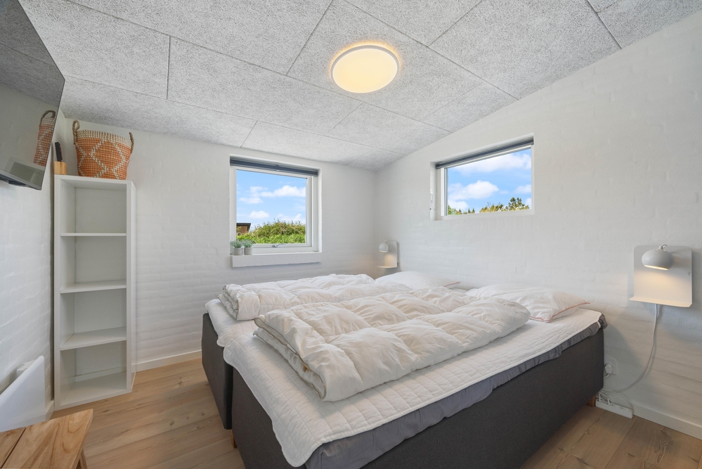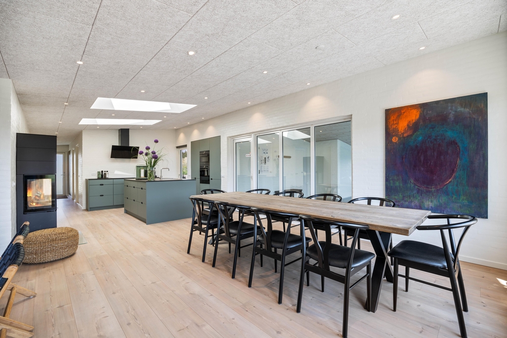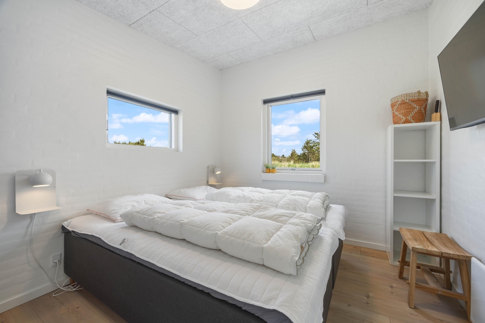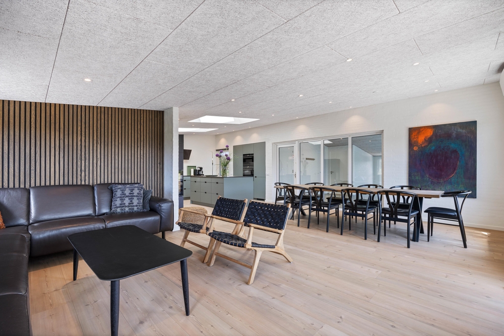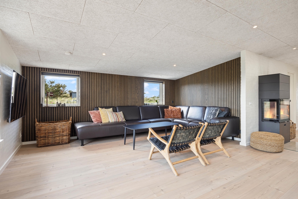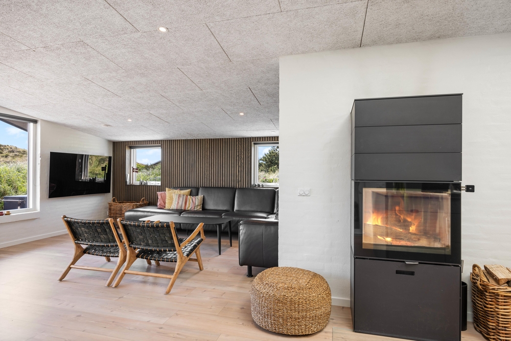Det 192 kvadratmeter store sommerhus byder jer straks velkommen med dets lyse farver, store rum og lyse vinduespartier, der inviterer solens stråler og de omkringliggende naturskønne omgivelser indenfor. Det store køkkenalrum er det naturlige centrum, hvorfra jeres aktiviteter kan foregå. Stuen er indrettet med gode og behagelige møbler, som man straks får lyst til at dejse ned i med en god bog. I denne afdeling står husets skønne brændeovn, der både udsender hygge- og varmebølger. Her finder I også et fladskærms-tv ? Der er desuden TV på alle værelserne, og så er der naturligvis trådløst internet i hele sommerhuset, så alle kan følge med i verden udenfor den lille oase.