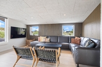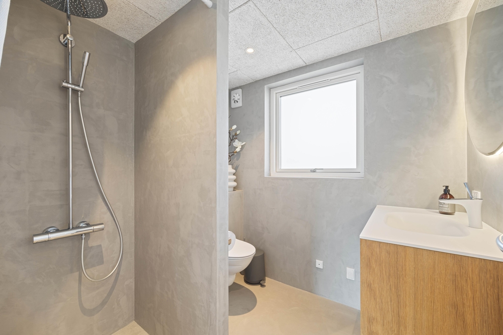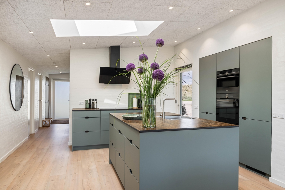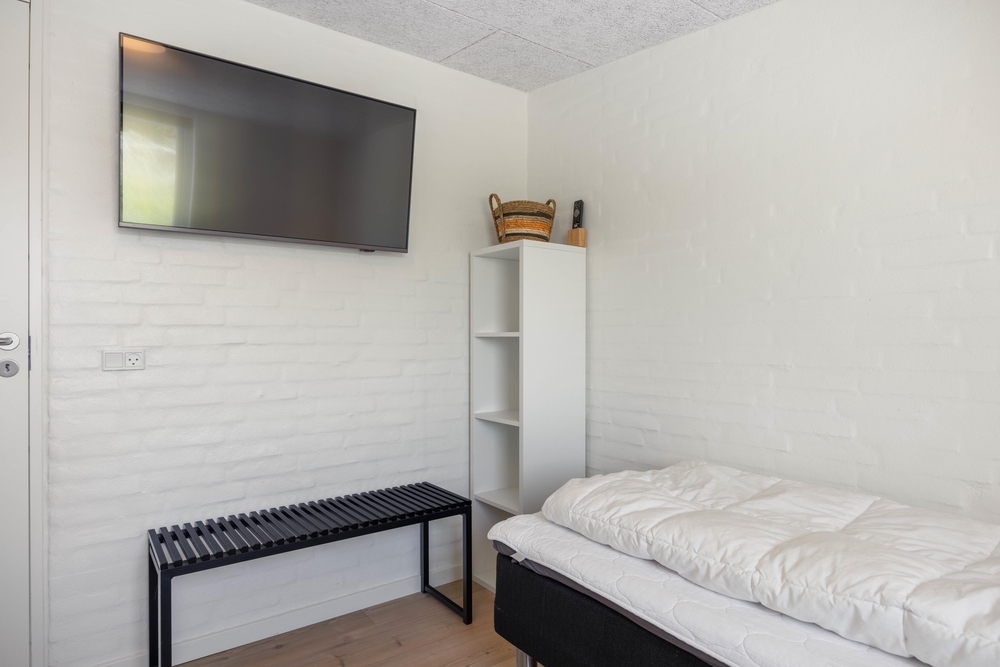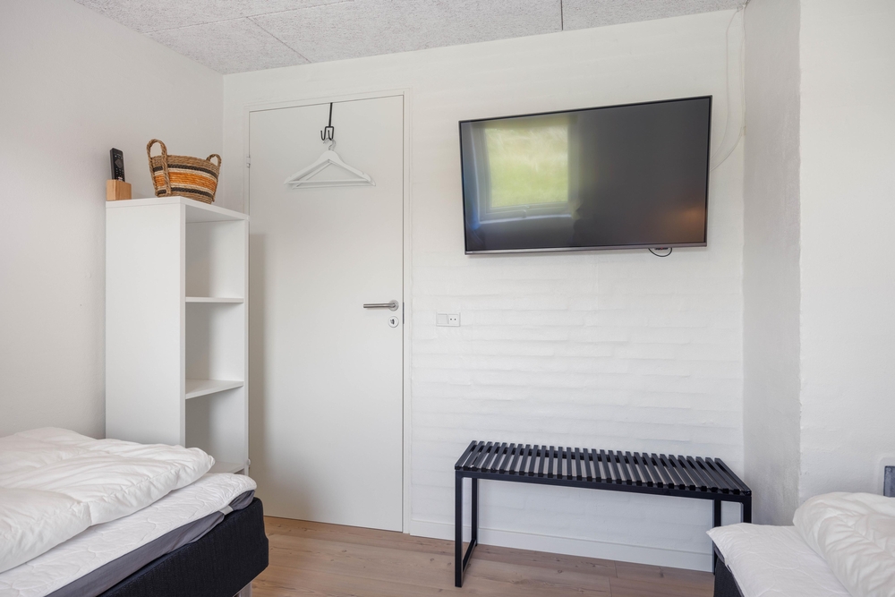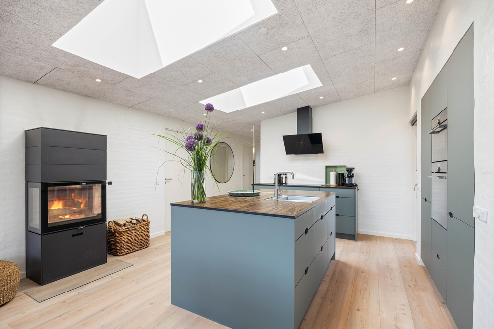 Det 192 kvadratmeter store sommerhus byder jer straks velkommen med dets lyse farver, store rum og lyse vinduespartier, der inviterer solens stråler og de omkringliggende naturskønne omgivelser indenfor. Det store køkkenalrum er det naturlige centrum, hvorfra jeres aktiviteter kan foregå. Stuen er indrettet med gode og behagelige møbler, som man straks får lyst til at dejse ned i med en god bog. I denne afdeling står husets skønne brændeovn, der både udsender hygge- og varmebølger. Her finder I også et fladskærms-tv ? Der er desuden TV på alle værelserne, og så er der naturligvis trådløst internet i hele sommerhuset, så alle kan følge med i verden udenfor den lille oase.