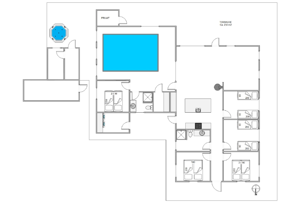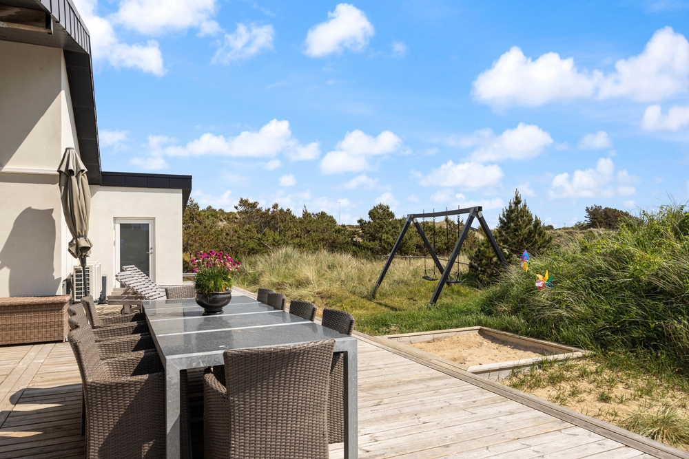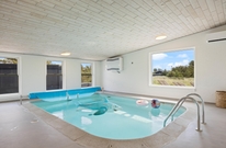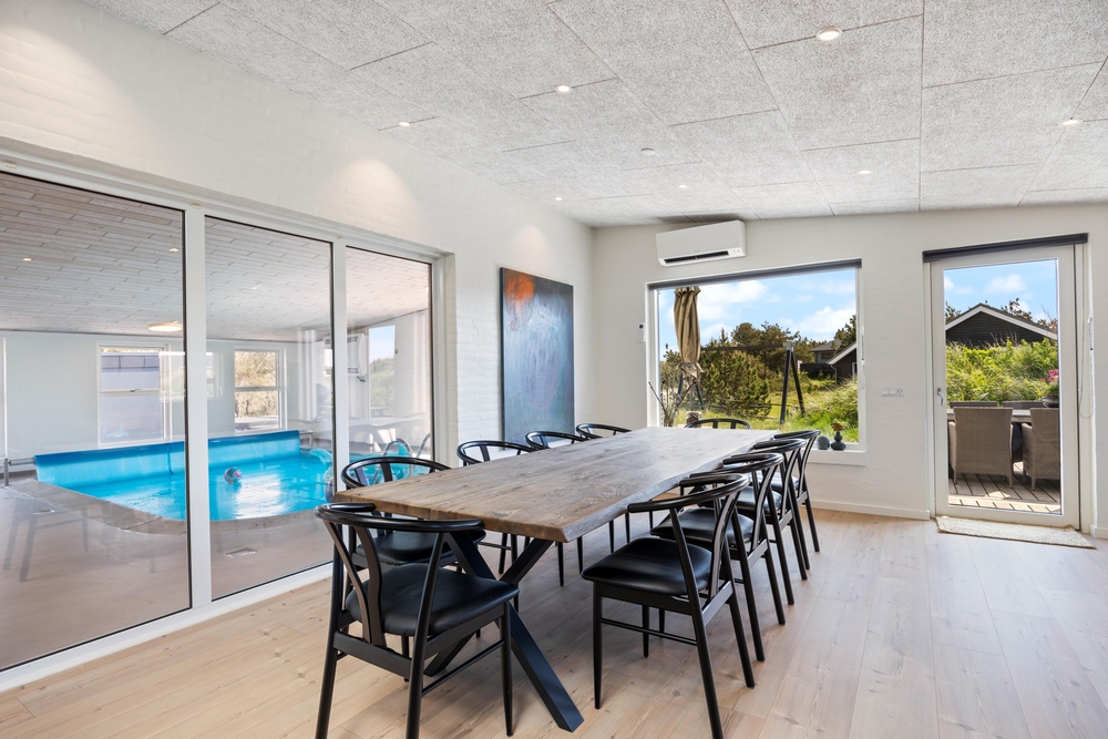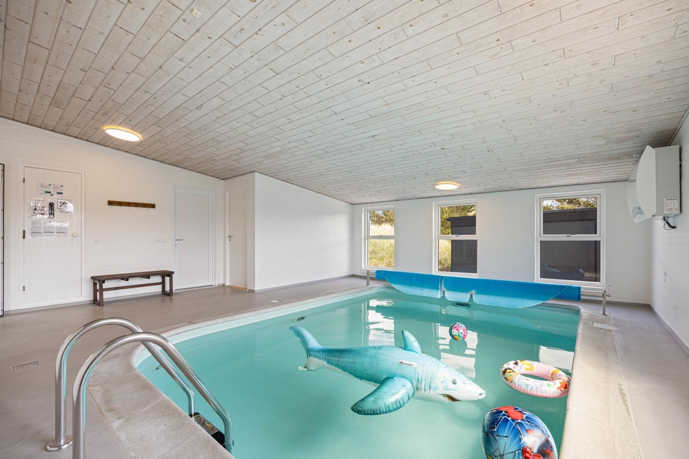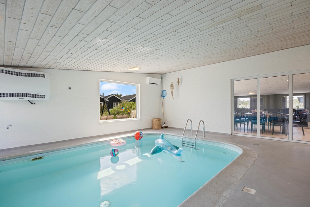 Swimmingpoolen indbyder i den grad til leg og vandplaskeri, og rummet er ganske uimodståelig for vandhunde med hang til fart og sommerfugle i maven. Den er opvarmet og klar når I kommer. Det er også en ekstra skøn forkælelse efter en lang dag ved Vesterhavet. Vandværdierne i saltvandspoolen bliver elektronisk overvåget 24 timer i døgnet, så vandkvaliteten altid er helt i top. Der er svømmetræner i poolen og spaen fyldes op med vand fra poolen.