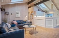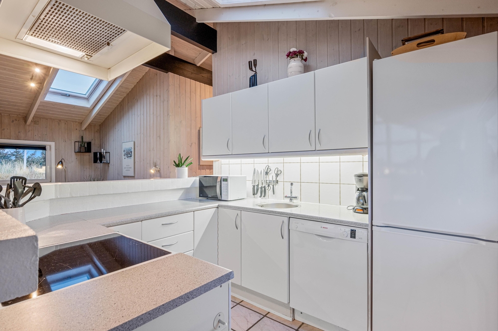 Marehalmen 52 byder jer velkommen til en dejlig lys opholdsstue som er i direkte åben forbindelse med både stue og køkken. Stilen er klassisk sommerhusstil i sort og hvidmalet interiør og køkkenet er fuldt udstyret med alt det nødvendige køkkenudstyr I skal bruge på ferien. Opvaskemaskinen klarer hurtigt opvasken på ferien og der er og der er god plads til at samles samt nyde et glas vin, imens børnene slapper af og lader op i alkoven med en iPad, så længe maden simrer.