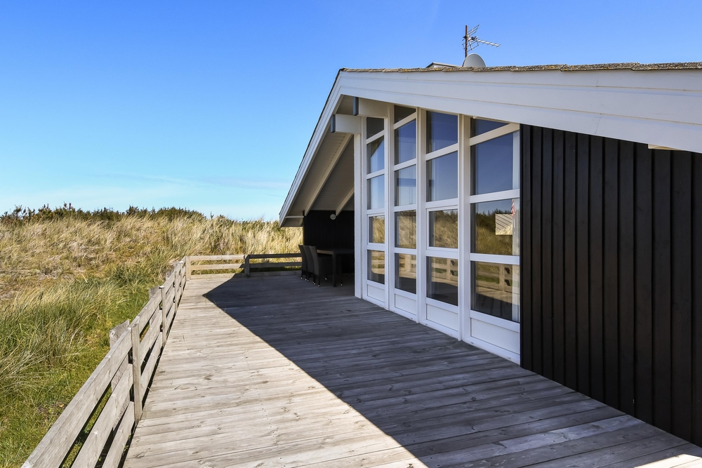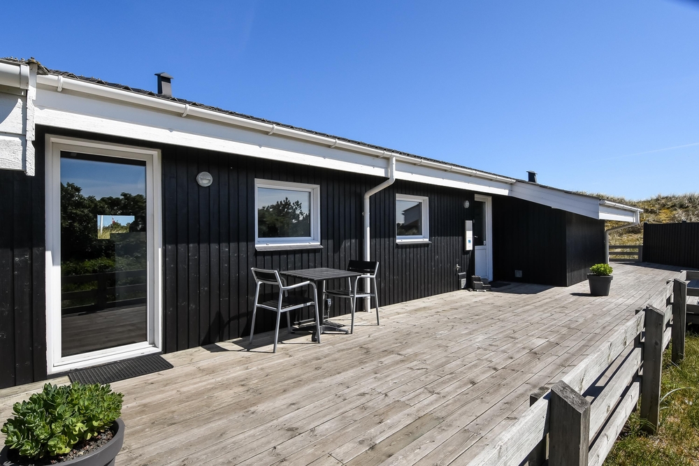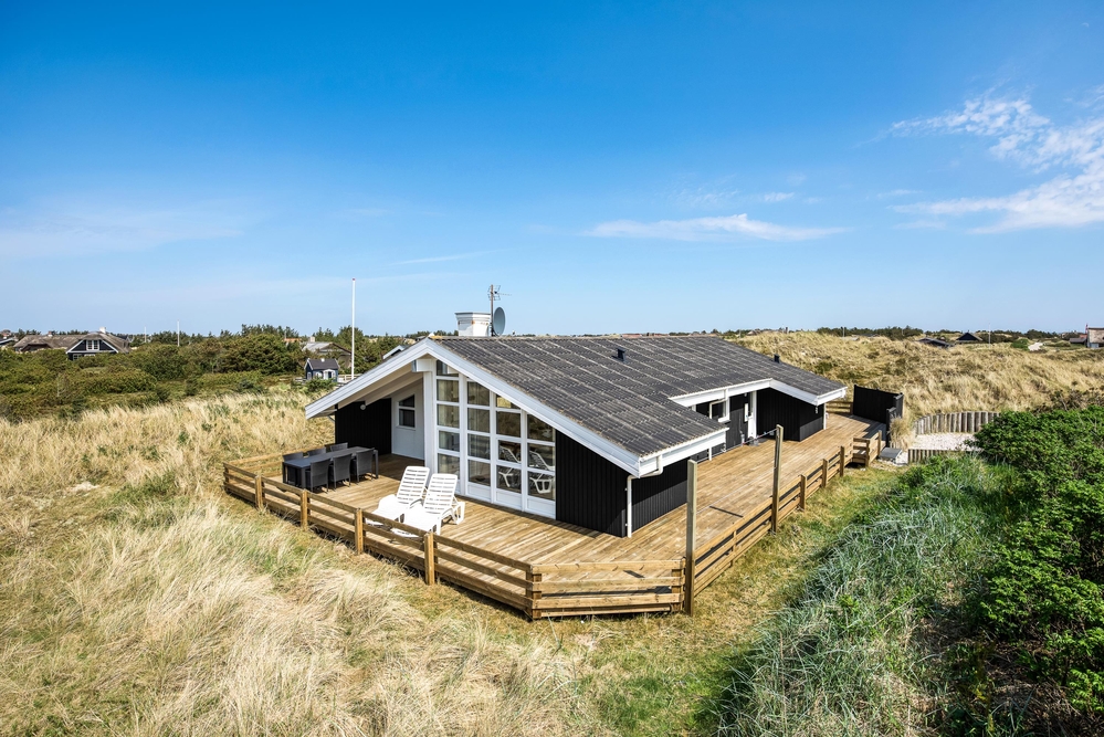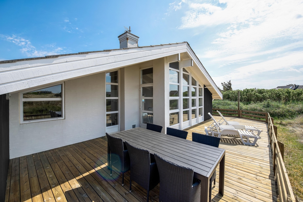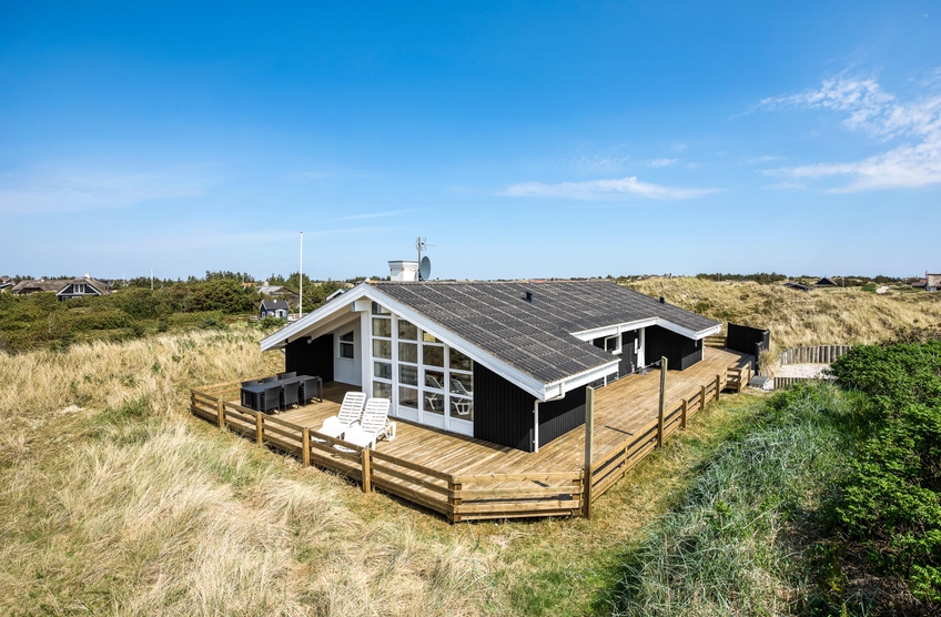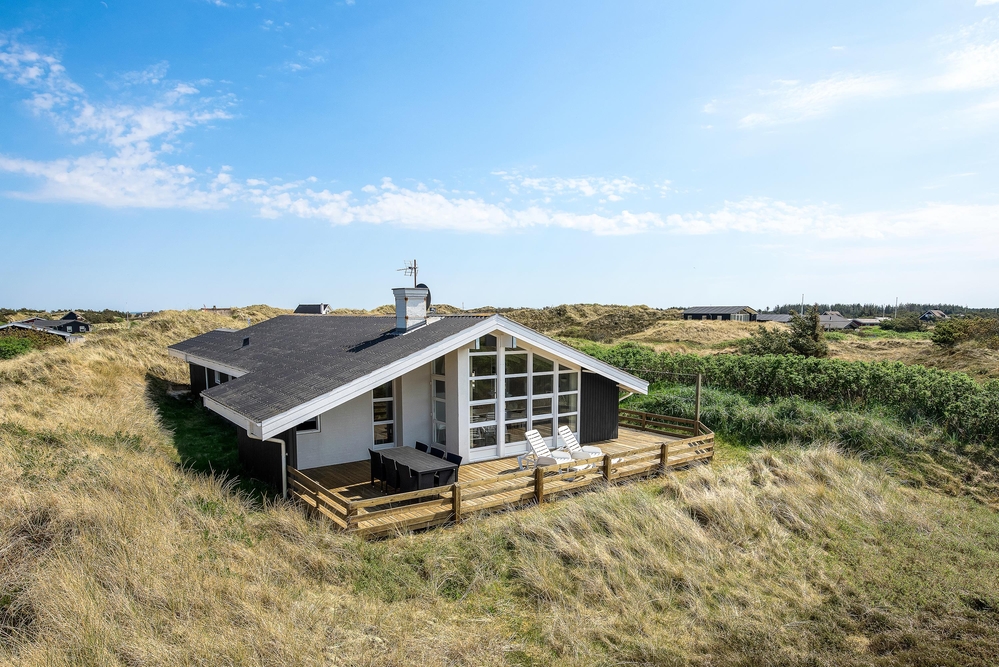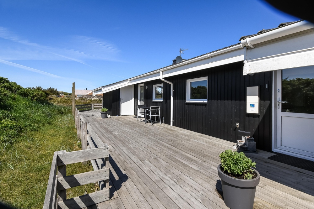 Sommerhuset på Marehalmen 52 ligger på en godt 2000 m2 stor grund og hele vejen rundt om sommerhuset er der en dejlig træterrasse. Her kan de voksne sidde og nyde det gode vejr i liggestolene, mens børnene hygger sig i sandkassen eller på gyngen. I er omgivet af smukt klitlandskab og med kun 300 meter ned til det bølgende Vesterhav og den lange sandstrand er det oplagt at gå mange ture her på ferie.