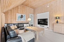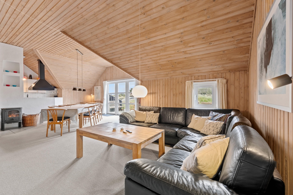 Den centrale opholdsstue forener køkken, spiseplads og dagligstue. Træbeklædte vægge kombineret med brændeovnen i dagligstuen bidrager til feriestemningen og afslappende aftener.