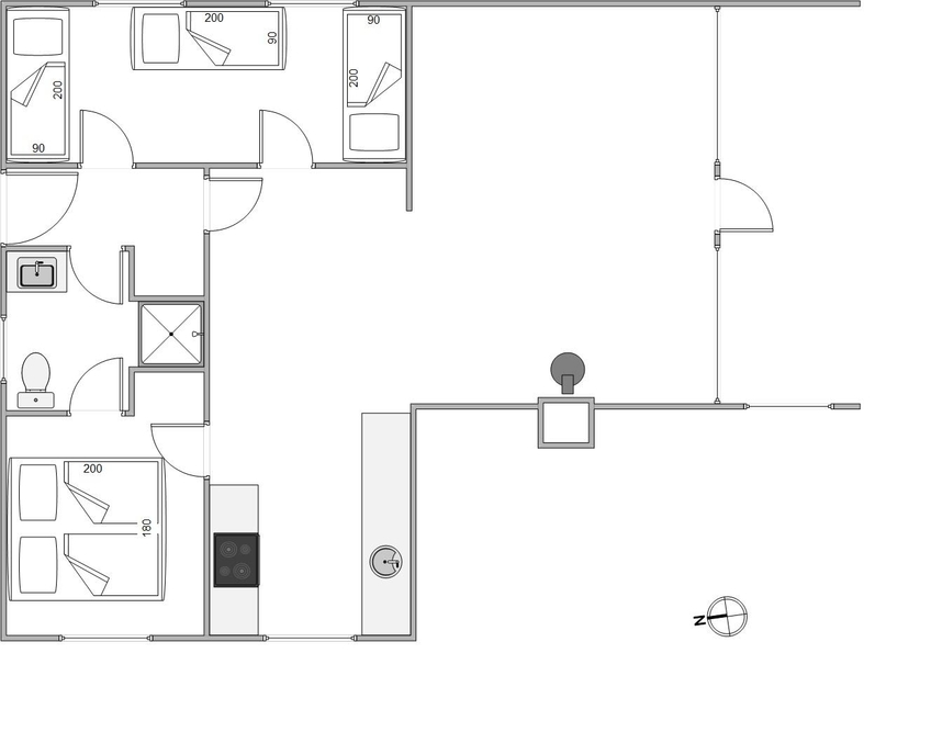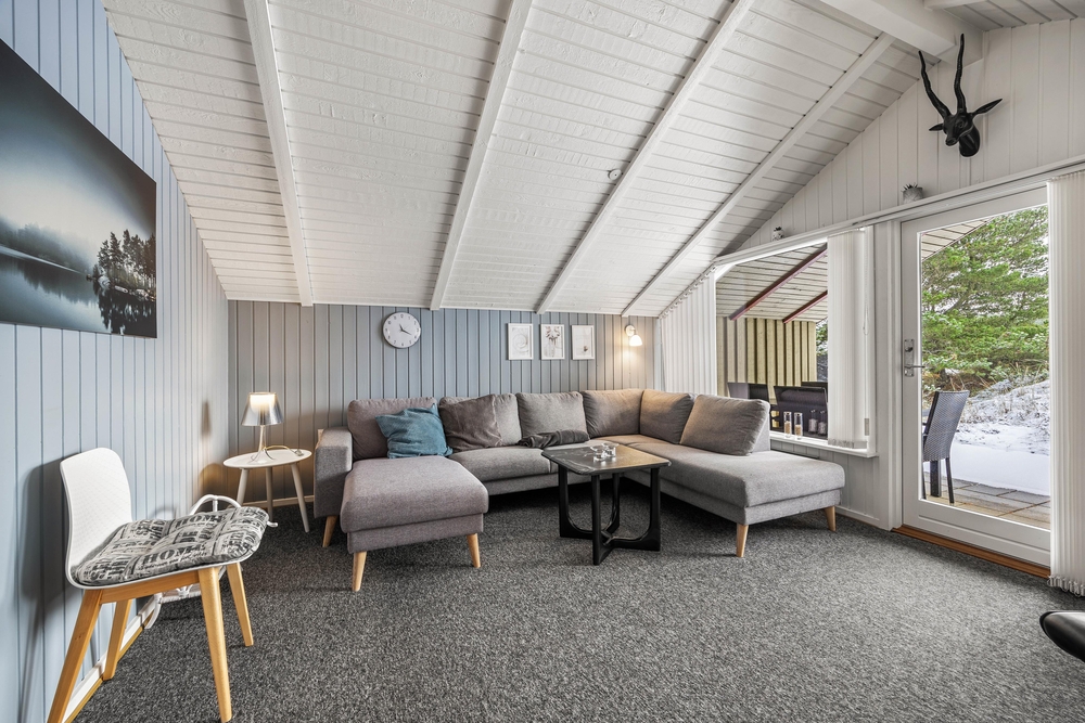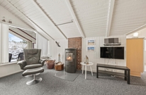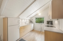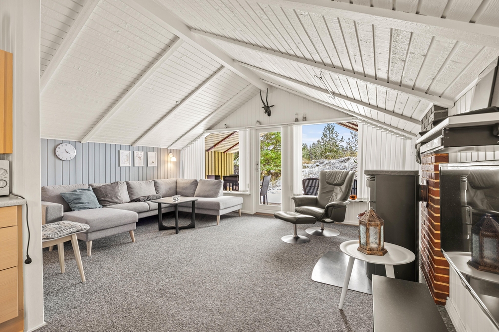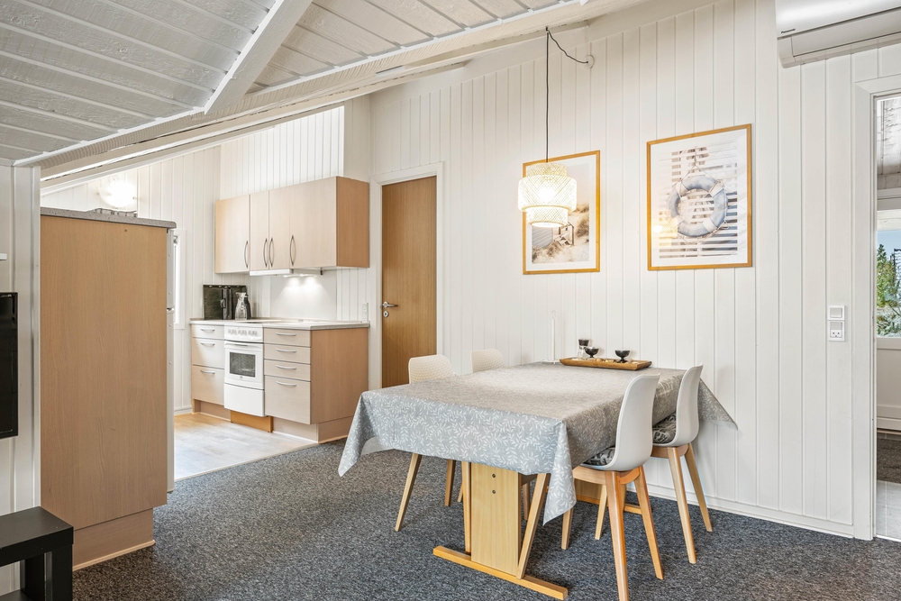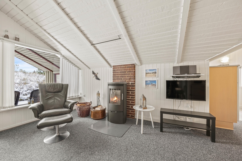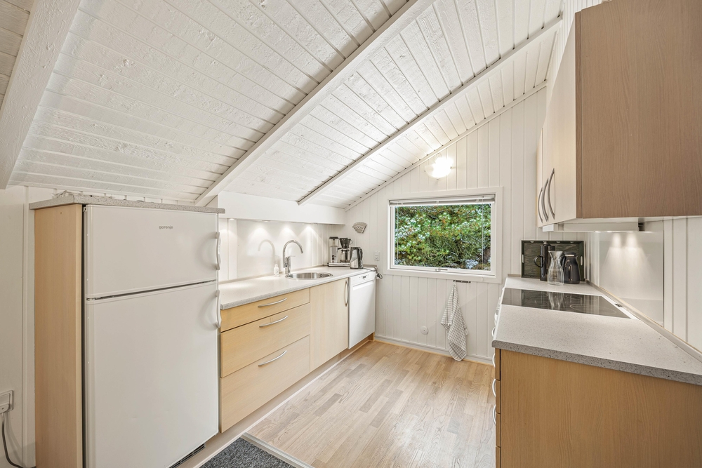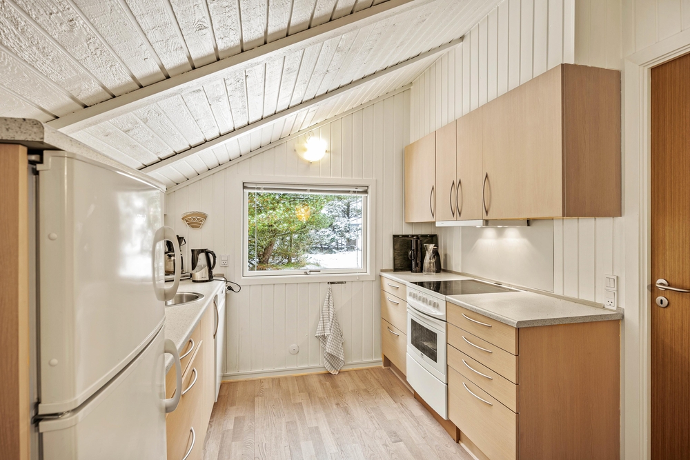 Hjertet i det 66 kvadratmeter store sommerhus udgøres af alrummet, hvor køkkenet ligger i åben forbindelse med stue og spiseplads. Her kan I nyde hyggelige feriestunder med film, madlavning og spil, mens brændeovnen fuldender feriestemningen med sine knitrende flammer i baggrunden.