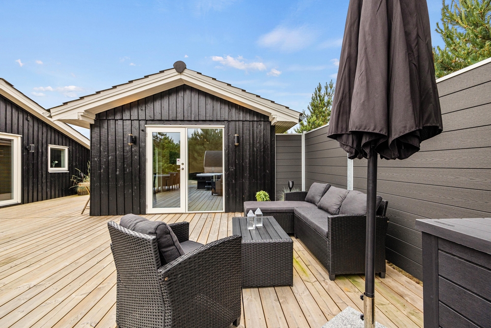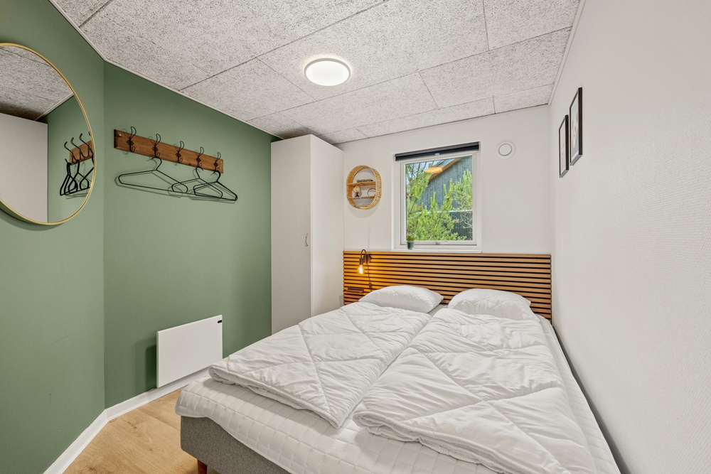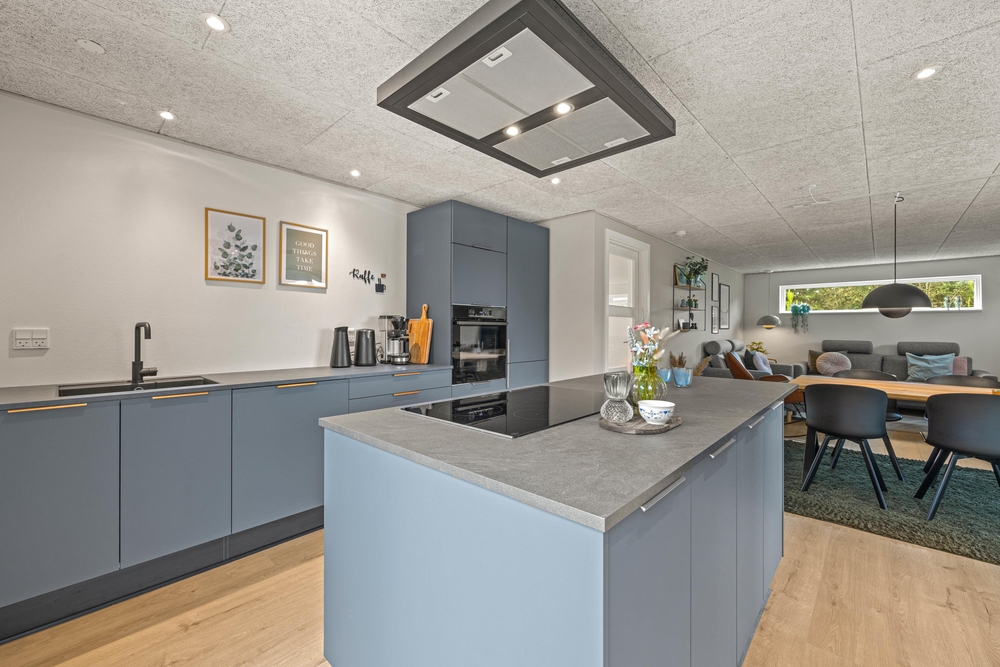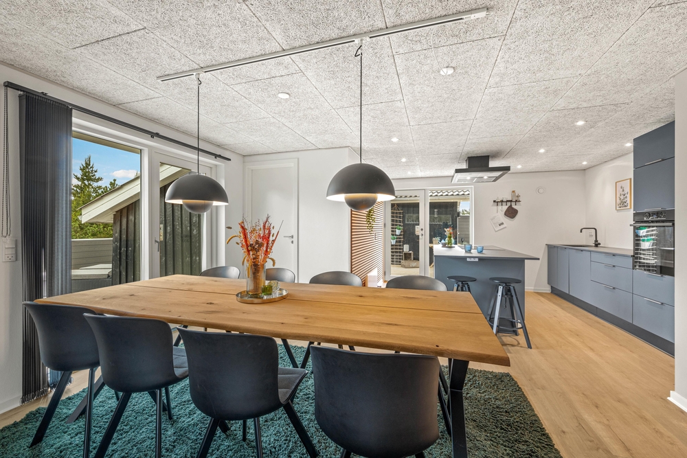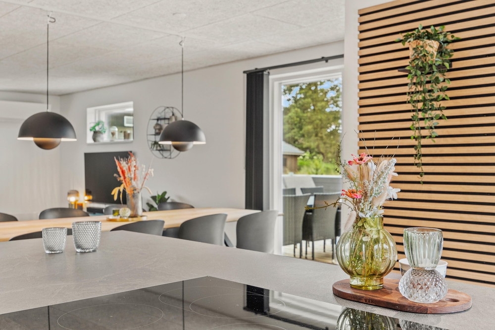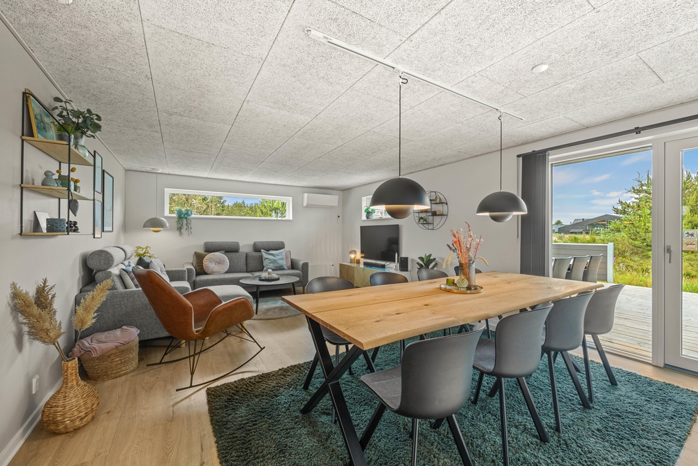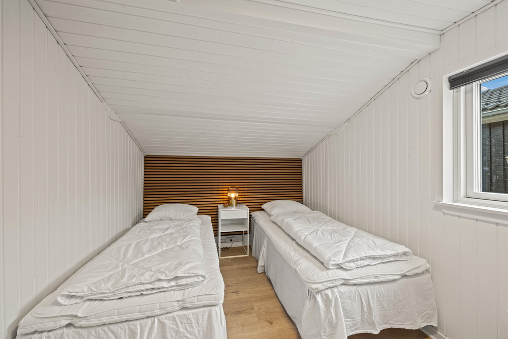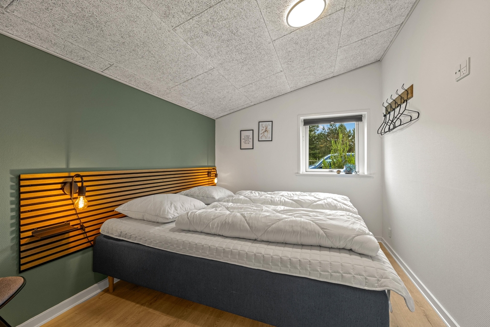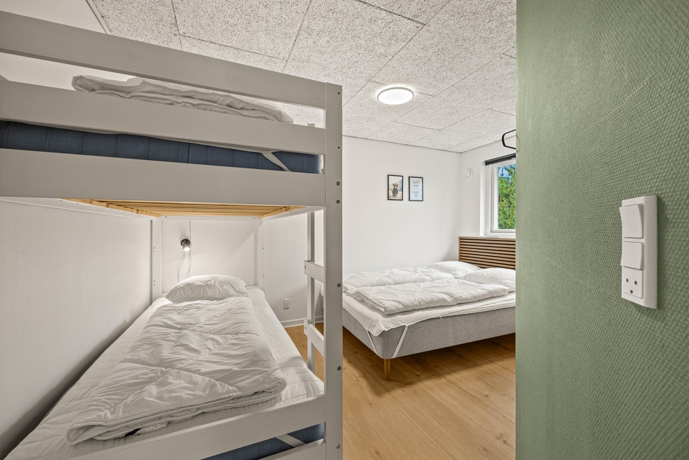 I dette moderne og stilfuldt indrettede feriehus finder i alt, hvad I har brug for til en skøn ferie. Med hele 4 soverum, herunder 3 med dobbeltsenge ? et med yderligere en køjeseng ? og 2 med enkeltsenge er der masser af plads til alle. Den rummelige stue er det ideelle sted at samles og hygge efter en lang dag med udendørs eventyr.