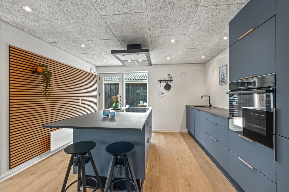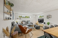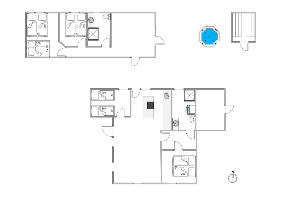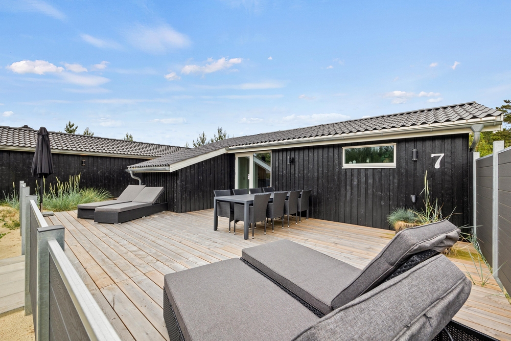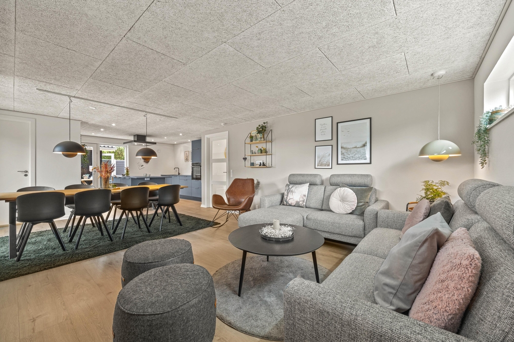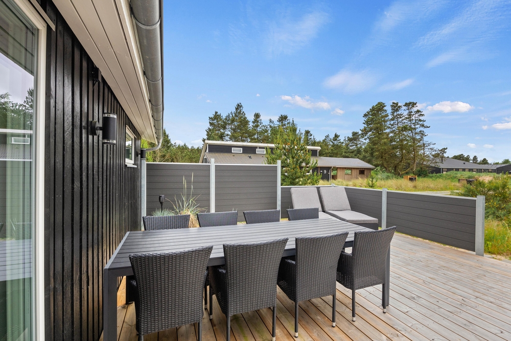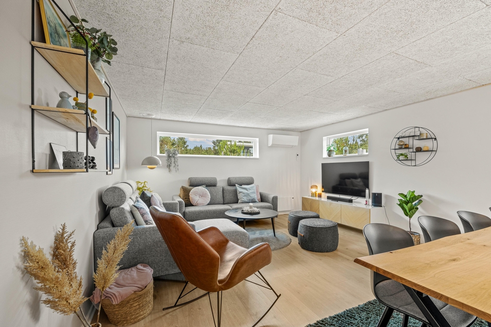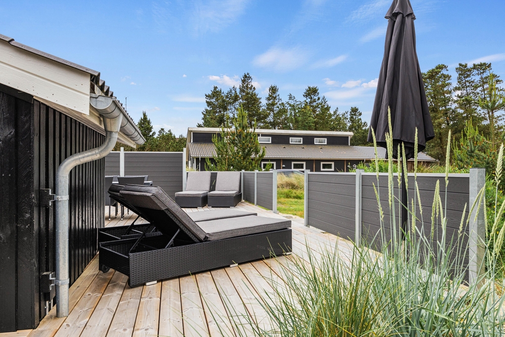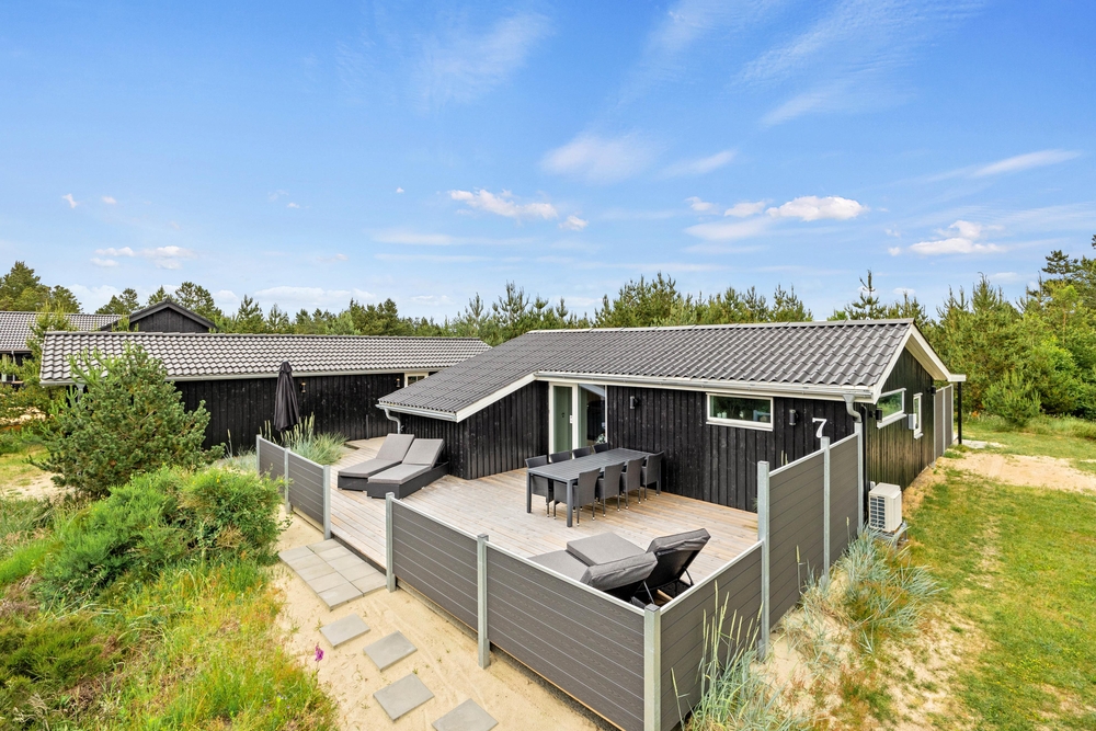 I dette moderne og stilfuldt indrettede feriehus finder i alt, hvad I har brug for til en skøn ferie. Med hele 4 soverum, herunder 3 med dobbeltsenge ? et med yderligere en køjeseng ? og 2 med enkeltsenge er der masser af plads til alle. Den rummelige stue er det ideelle sted at samles og hygge efter en lang dag med udendørs eventyr.