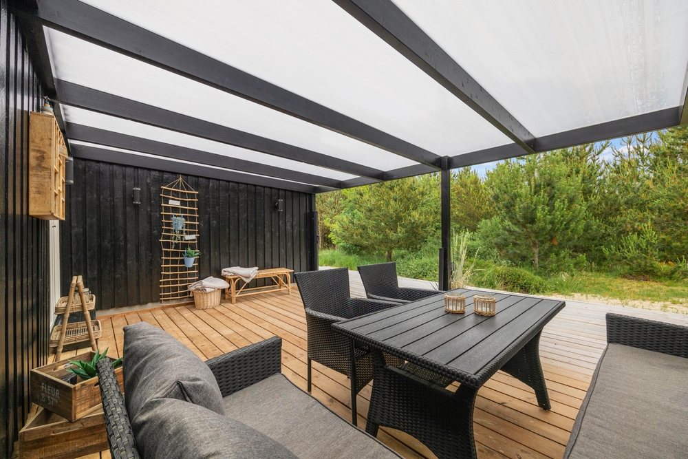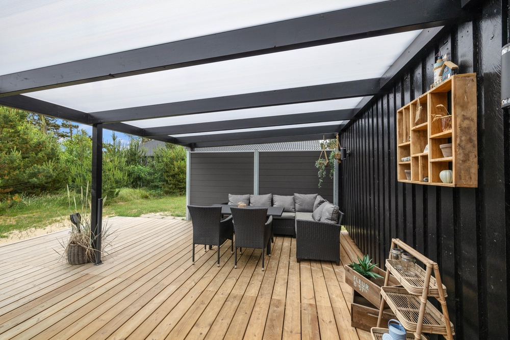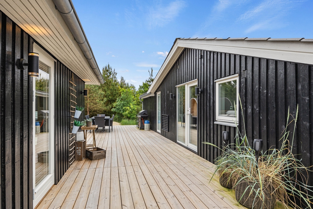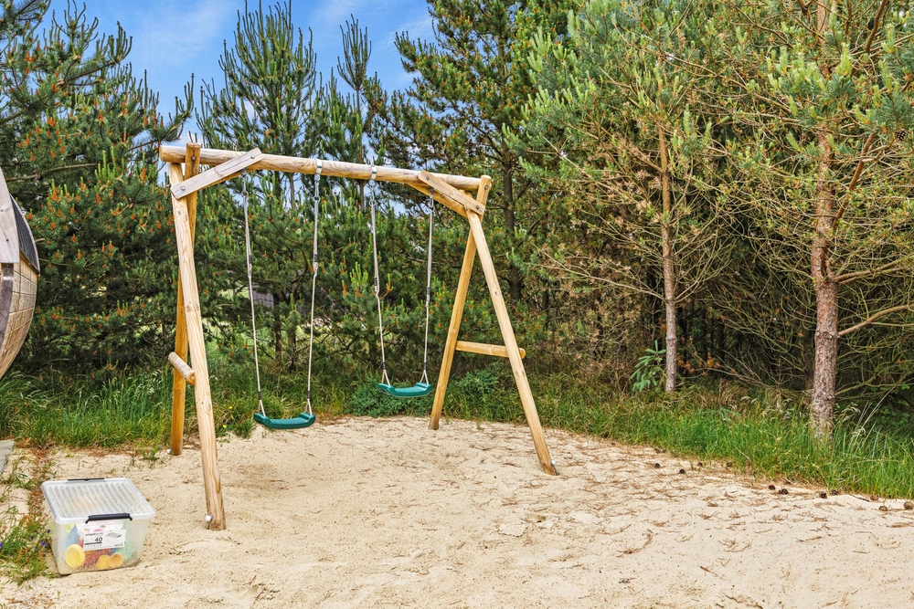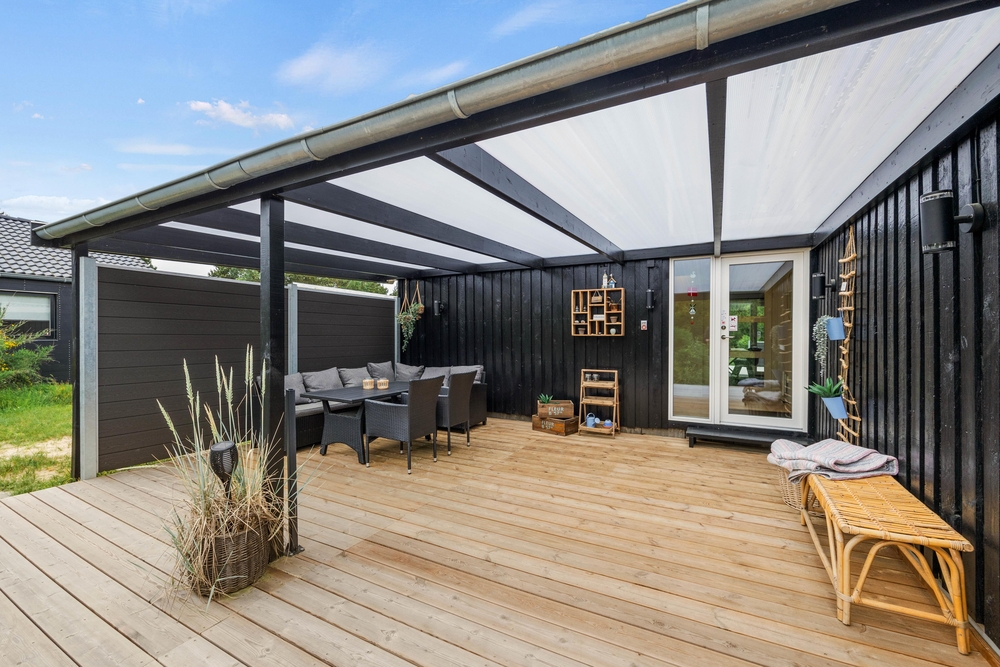 Udenfor finder I et skønt, hyggeligt udemiljø på en stor naturgrund, der byder på privatliv og masser at lave. Lad børnene lege i gyngen og sandet, mens I nyder en kop kaffe på den overdækkede terasse, eller slap af i skyggen på den afskærmede terrasse.
