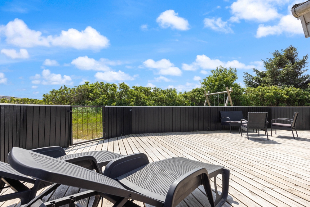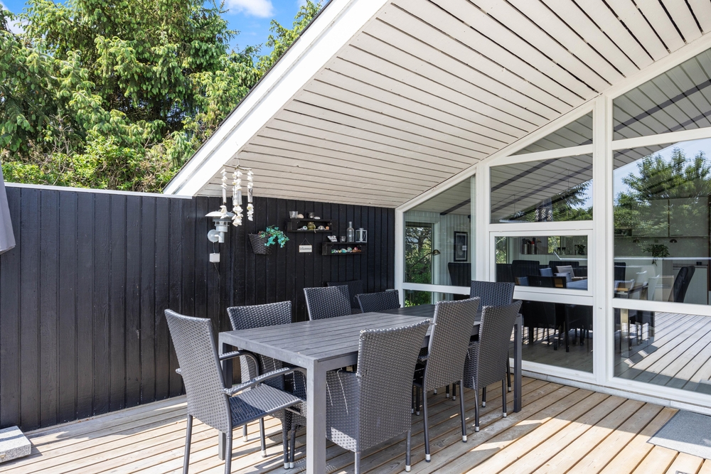 Der er en stor og skøn træterrasse mod syd. Den er delvis overdækket, delvis afskærmet og næsten helt lukket. Den er derfor særdeles anvendelig, både til lange og hyggelige grillaftener, til leg for børnene og til afslapning i solen. Desuden er der både sandkasse og gyngestativ til familiens yngste.