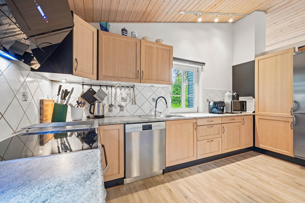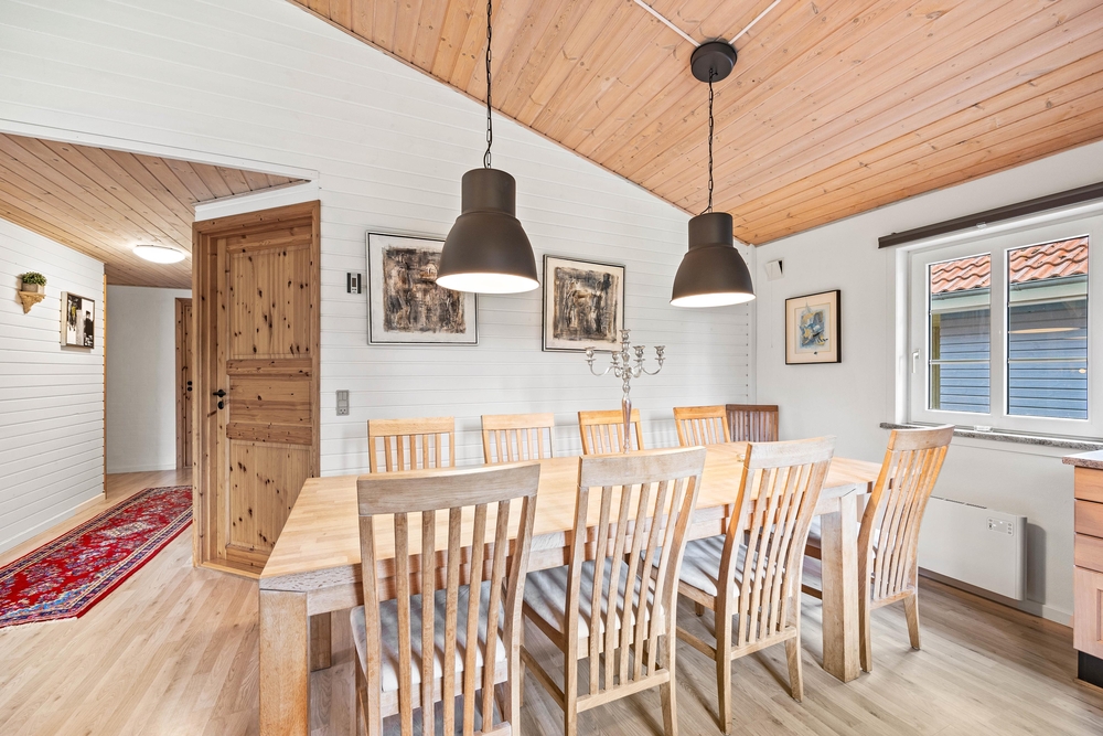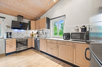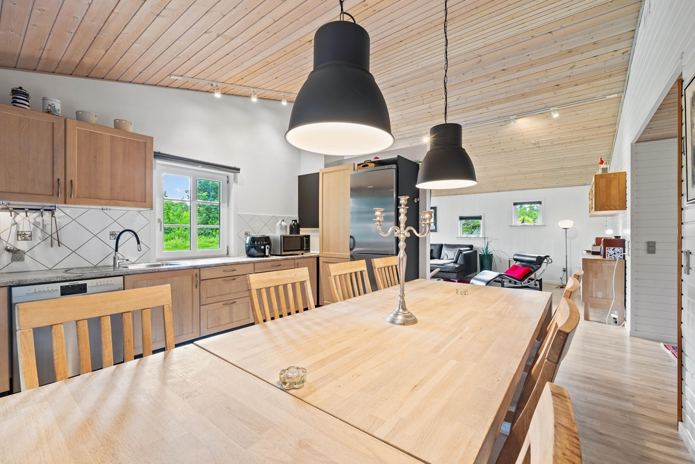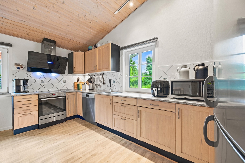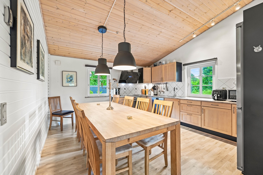 Indenfor finder I køkkenet udstyret med alle nødvendige faciliteter til at gøre jeres ophold så behageligt som muligt. Her finder I en airfryer til nye kulunariske oplevelser og en praktisk opvaskemaskine, der gør oprydningen efter måltiderne legende let. I samme rum finder I et rummeligt spiseområde, hvor hele familien eller vennegruppen kan samle sig til hyggelige måltider.