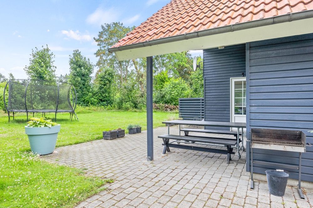 Fra stuen træder I ud på den overdækkede og delvist afskærmede terrasse. Her finder i både grill og havemøbler til en dag med mad under åben himmel, samt solvogne til de solrige dage. Herfra kan I træde ud på den 1540 kvm store plænegrund, der indbyder til spil og leg. Disse terrasser gør det nemt at finde det perfekte sted, om I vil solbade, spise udendørs eller bare slappe af med en god bog.