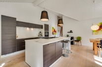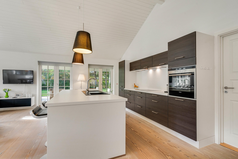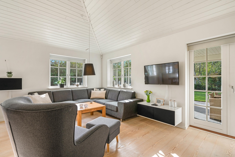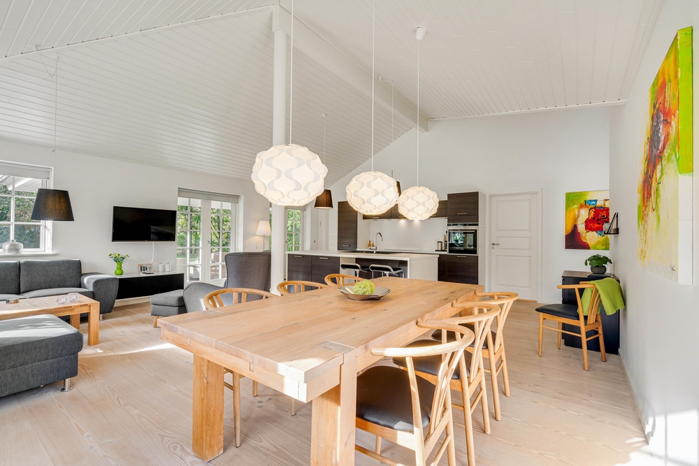 Det indbydende køkken og alrum hænger sammen, så her kan ferieflokken samles i et opholdsrum, hvor stemningen inviterer til feriehygge. Her kan I slænge jer i den store hjørnesofa med en god bog eller en film på tv?et. Desuden er køkkenet indrettet bekvemt med induktion, indbygget 80 liters fryser samt et praktisk bryggers med både vaskemaskine og tørretumbler til rådighed.