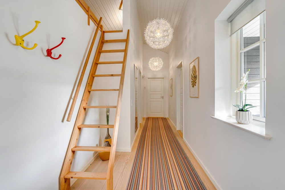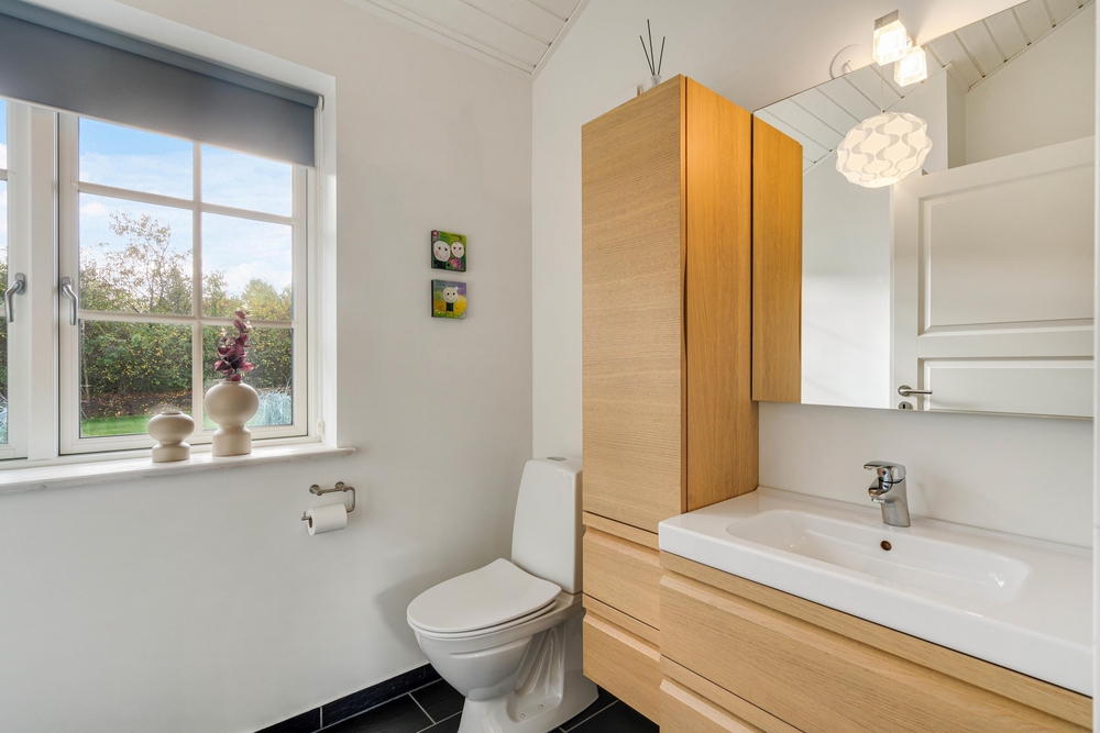Overalt i sommerhuset er der et dejligt indeklima med gulvvarme, og varmen er energivenlig med brug af varmepumpe.