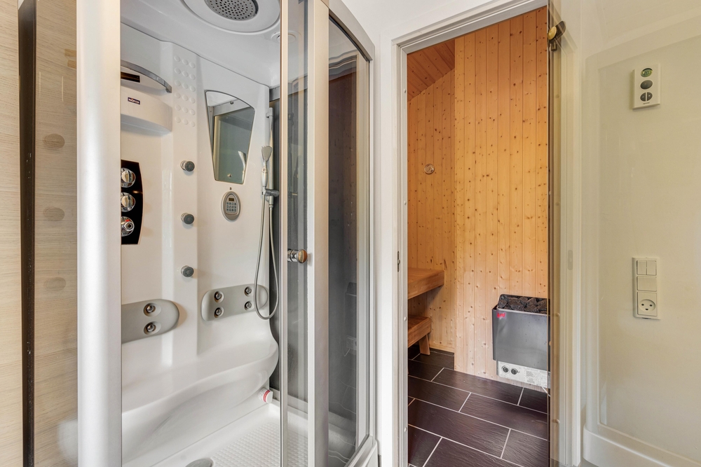 Det ene badeværelse er designet til velvære, hvor I kan nyde et afslappende spa for to, perfekt til at pleje både krop og sjæl. Derudover er der en sauna til rådighed, hvor I kan afstresse og genoplade energi under jeres ophold.