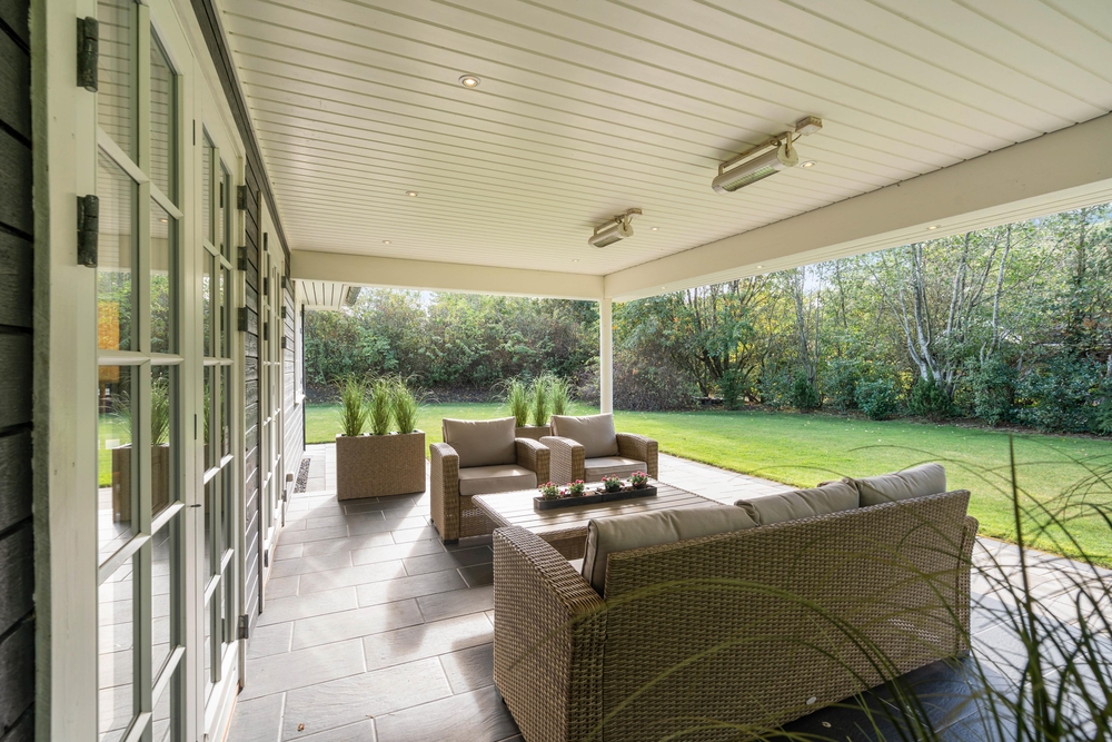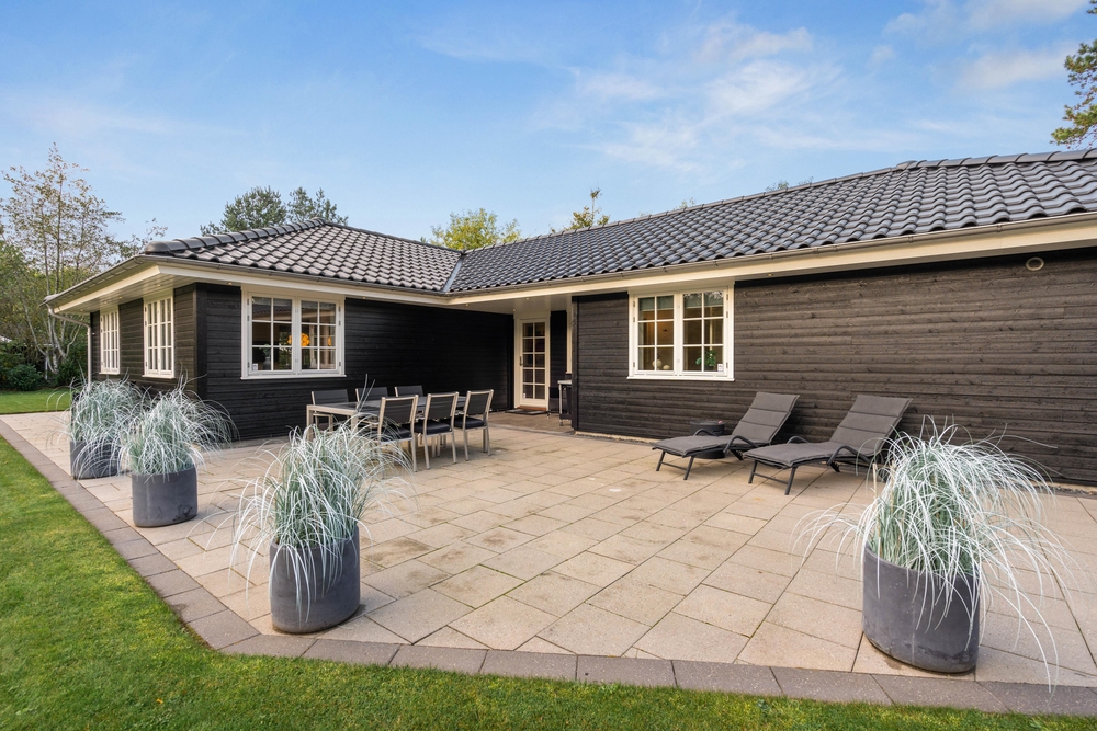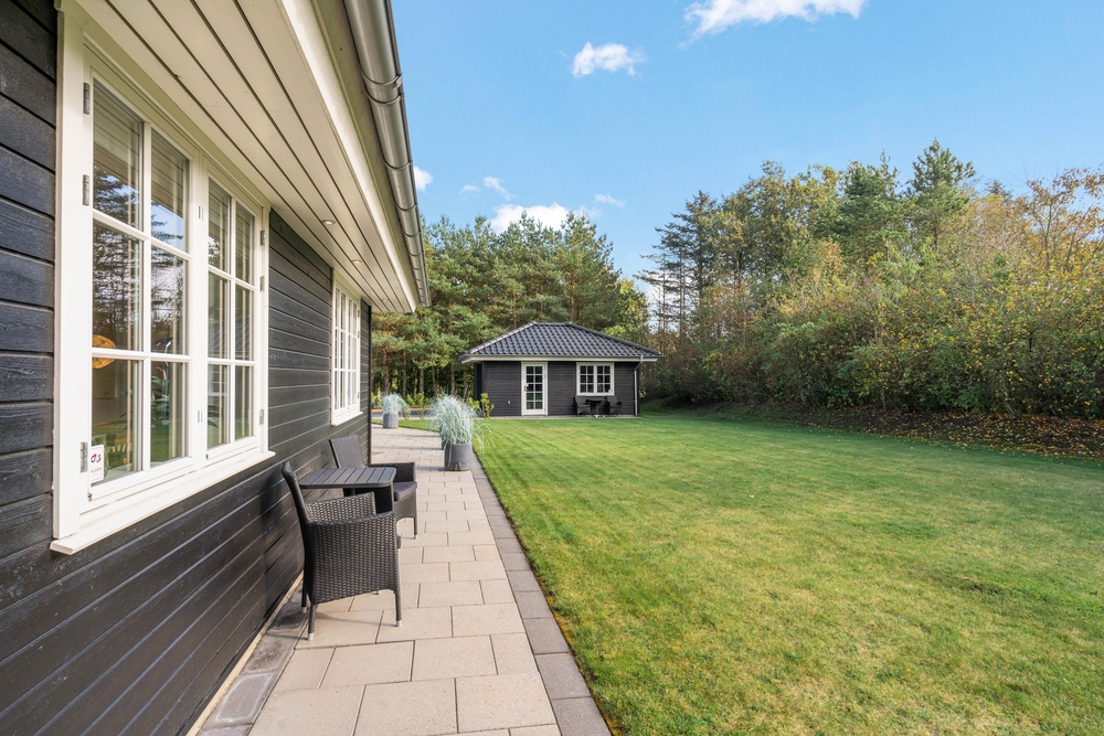 Fra sommerhuset træder I ud på den skønne terrasse, der både er åben og delvist overdækket til at nyde grillaftener på. På de varme dage kan I finde jer godt til rette i solen i diverse havemøbler og på liggestole.