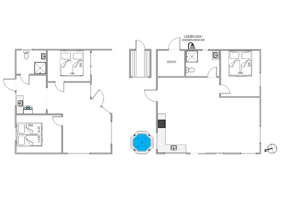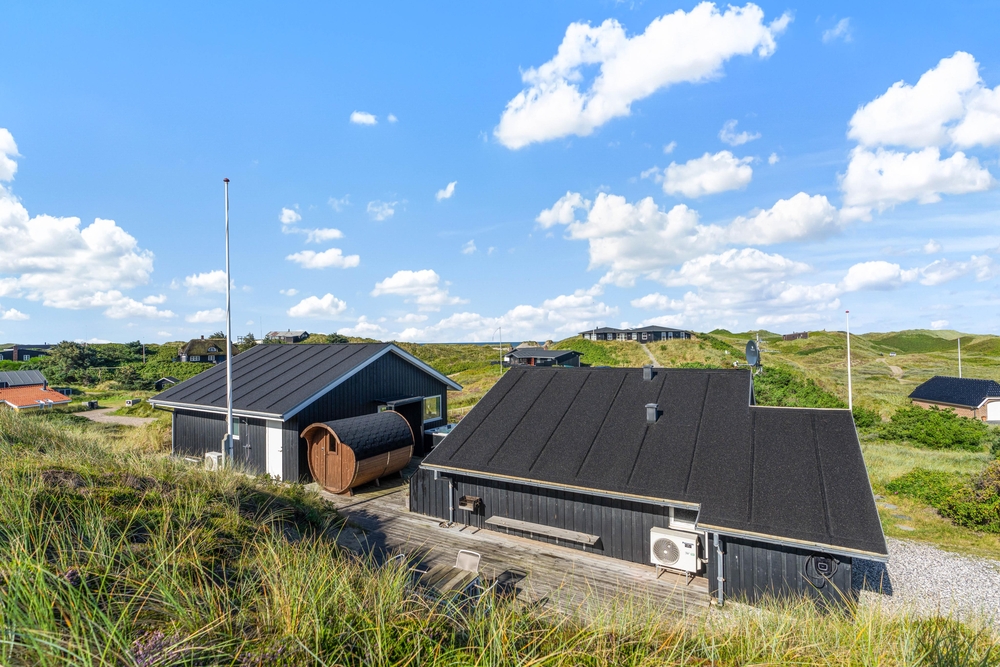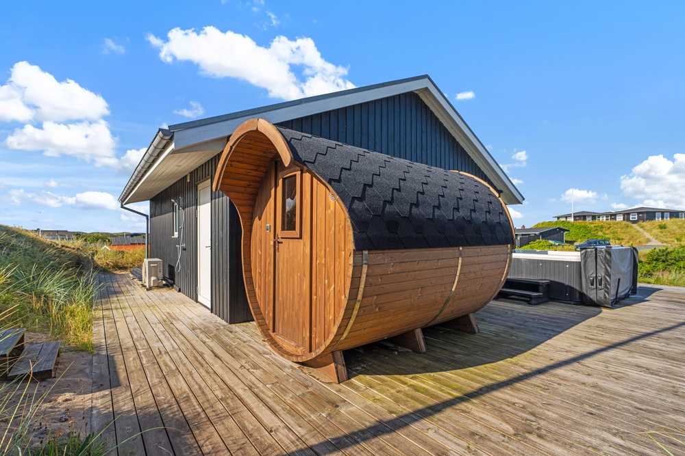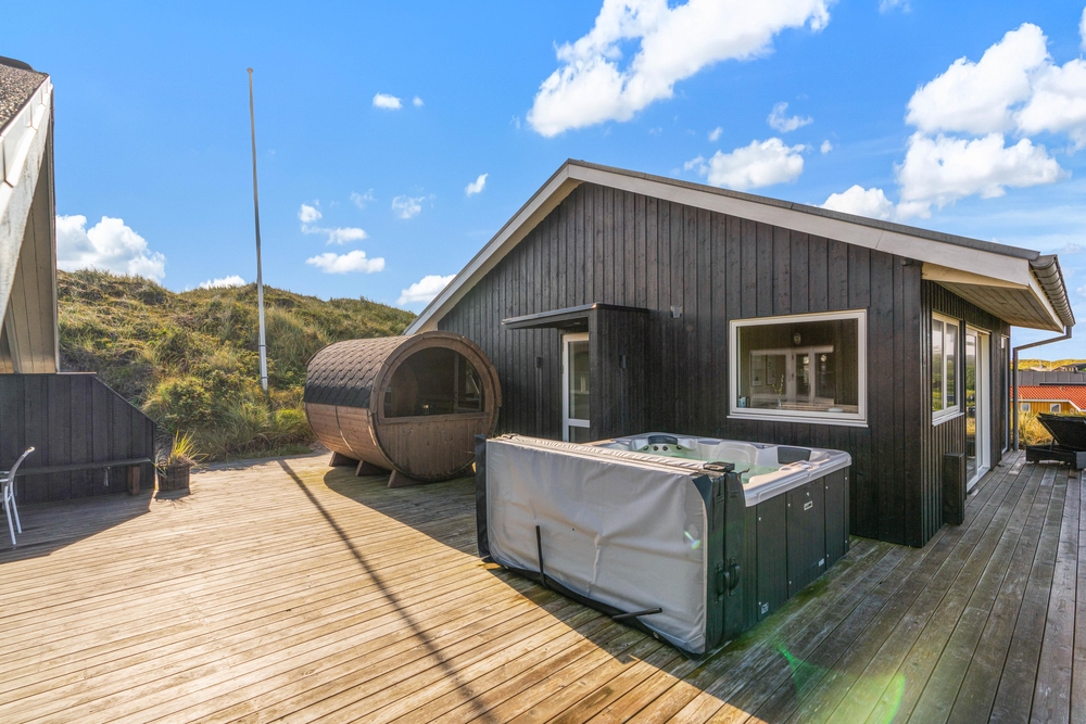 Daglige gåture på stranden giver jer mulighed for at slippe væk fra hverdagen, og hjemme i sommerhuset kan I koble fra i jeres egen lille wellness-oase. Højdepunktet og centrum på terrassen er en sauna og et udendørs boblebad. Fra saunaen og det udendørs boblebad har I en fantastisk udsigt over klitterne og de smukke natur-omgivelser. Har i været en tur på stranden, ha ri mulighed for at benytte jer af feriehusets udebruser, for at skylle sandet af kroppen. Vær opmærksom på at udebruseren er åben i perioden april-november.