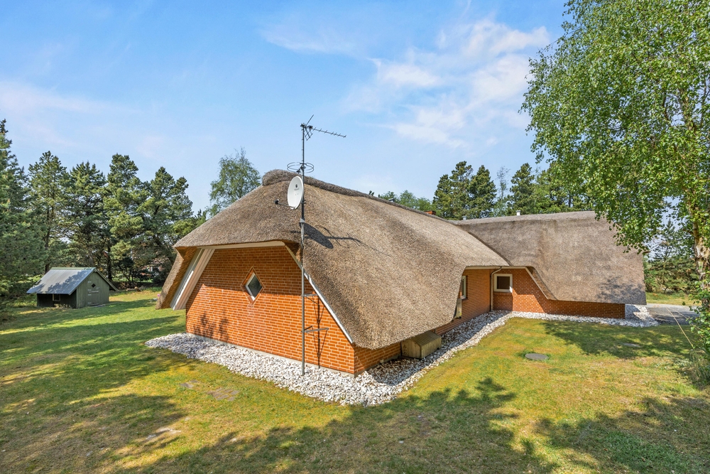 Det stråtækte sommerhus på Moritzvej 18 ligger på en 2.500 m2 stor naturgrund, ugenert og omkranset af løv- og nåletræer. I det store vinkel-opholdsrum med brændeovn er der god plads til, at alle kan spise og opholde sig sammen. Ved det lange spisebord kan I indtage jeres hjemmelavede måltider, spille kort eller brætspil, imens ilden knitrer i brændeovnen. Eller I kan hygge jer i sofagruppen med en god bog eller en film på TV?et. I alle soveværelser er der et TV.