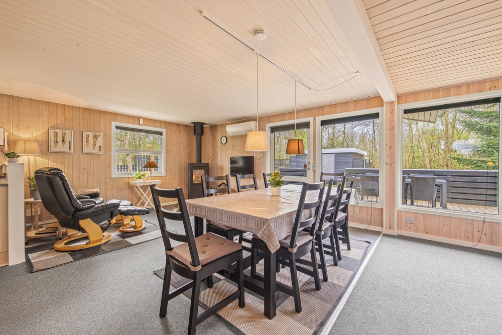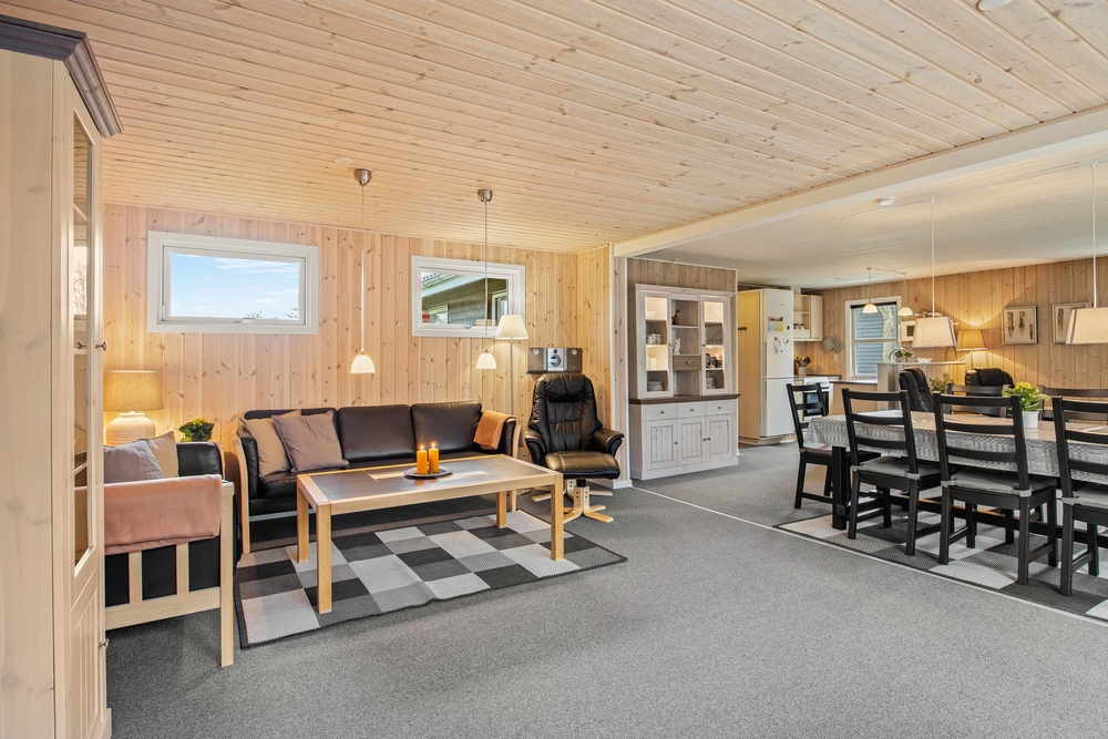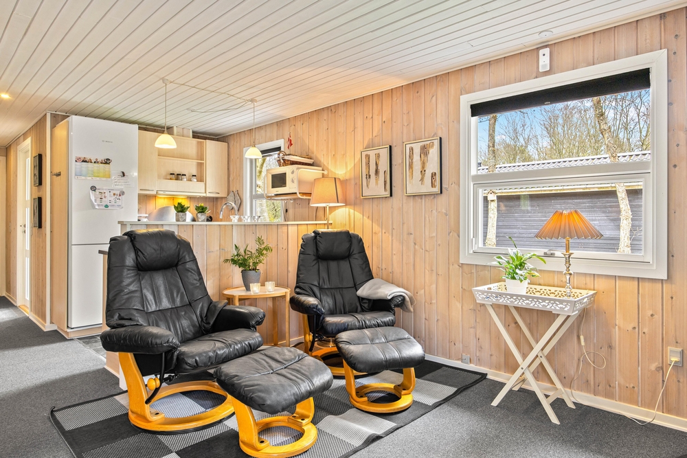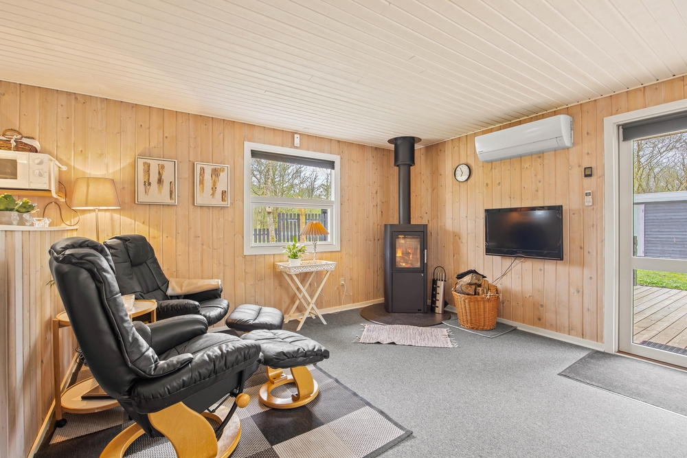 Den lyse indretning med flotte træpaneler og lyse møbler skaber en indbydende atmosfære. Sommerhuset byder på 2 separate stueområder, så I kan vælge mellem tv-hygge eller fordybelse foran brændeovnen ? og ejeren stiller frit brænde til rådighed, så I kan nyde varmen og knitren fra flammerne.