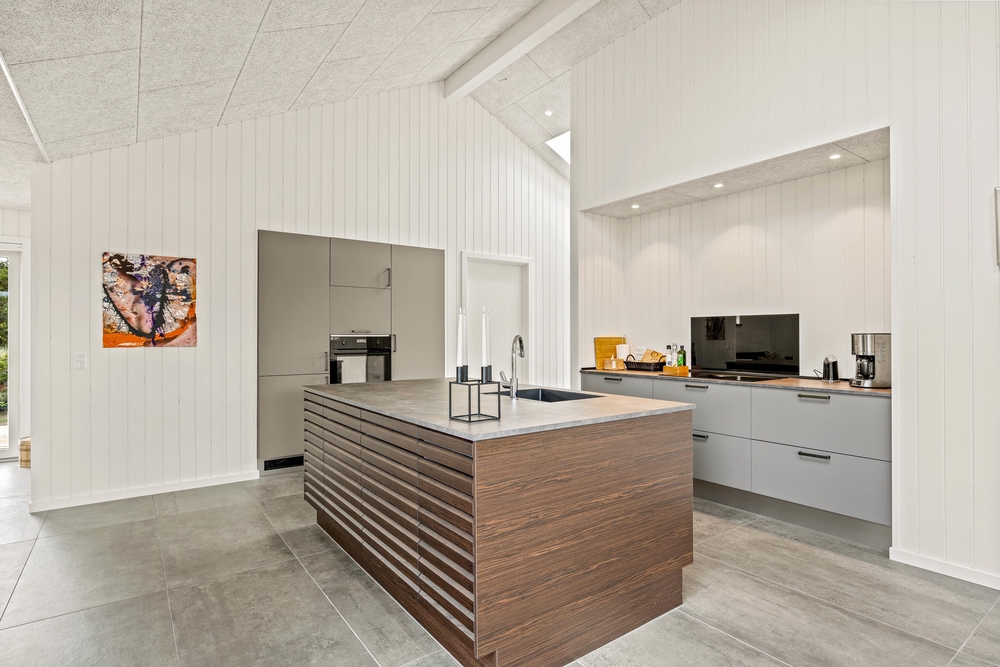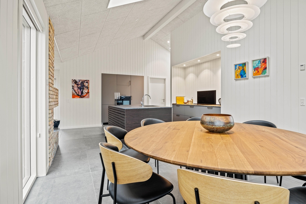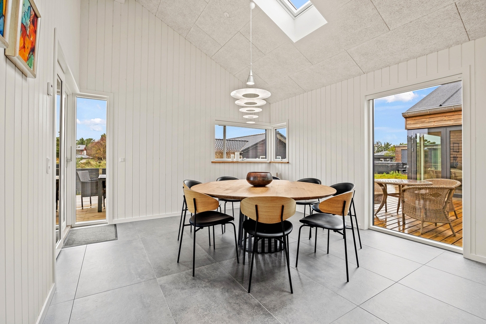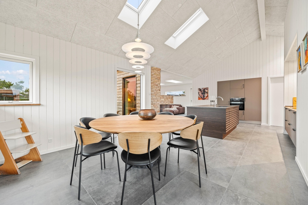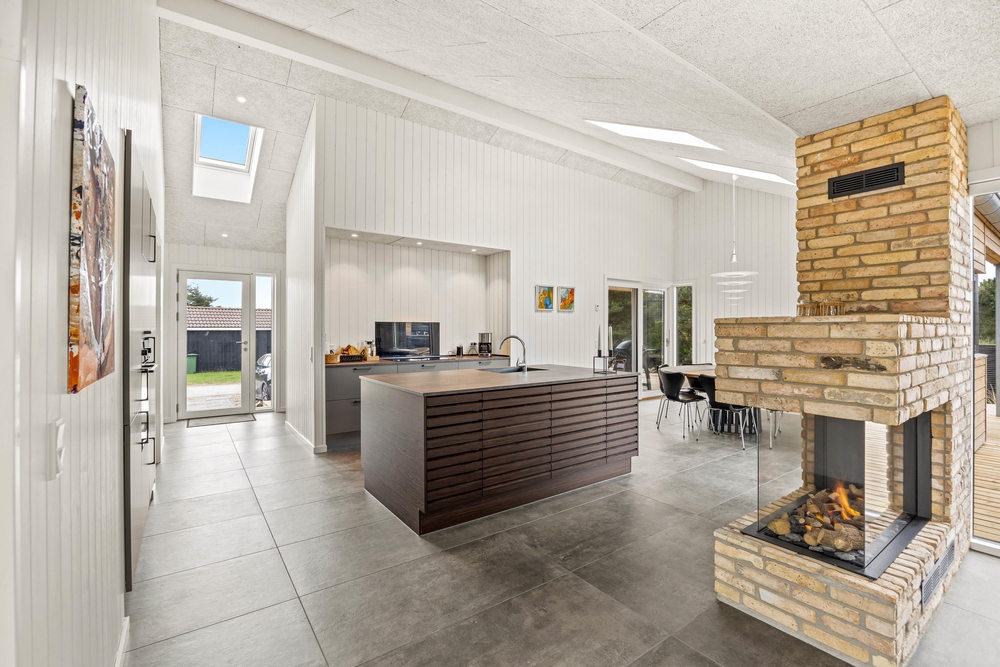 Så snart I træder ind i det åbne opholdsrum på Musvågevej 16, vil I bemærke den lyse og venlige indretning. Det store vinduesparti giver et fint lysindfald og en fantastisk feriestemning. I den komfortable sofa kan I se jeres yndlingsfilm via Chromecast, eller slappe af med en god bog. Ved det store spisebord kan I samles til en hyggelig spilleaften, imens ilden knitrer i gaspejsen.