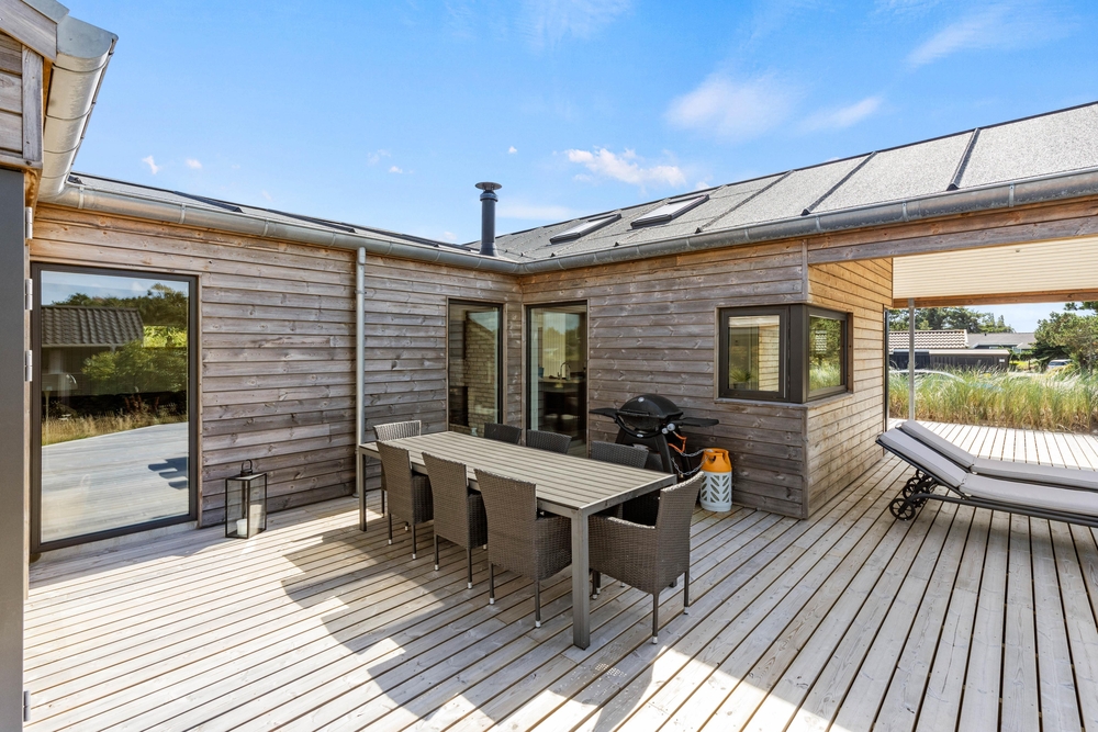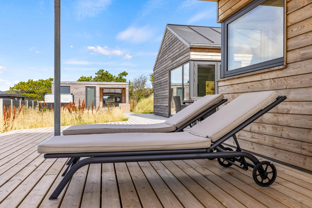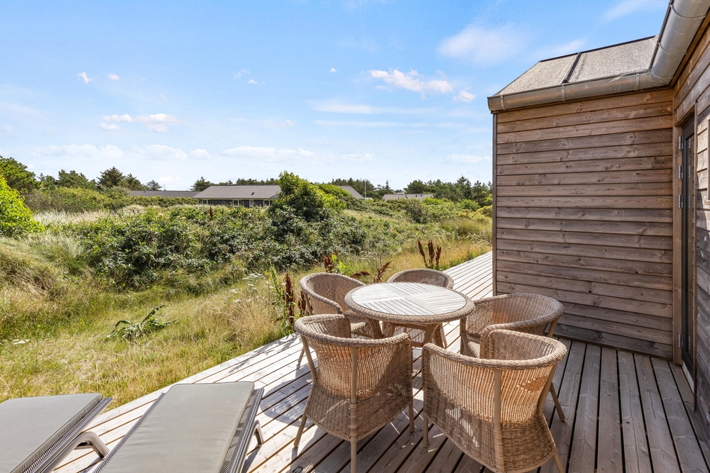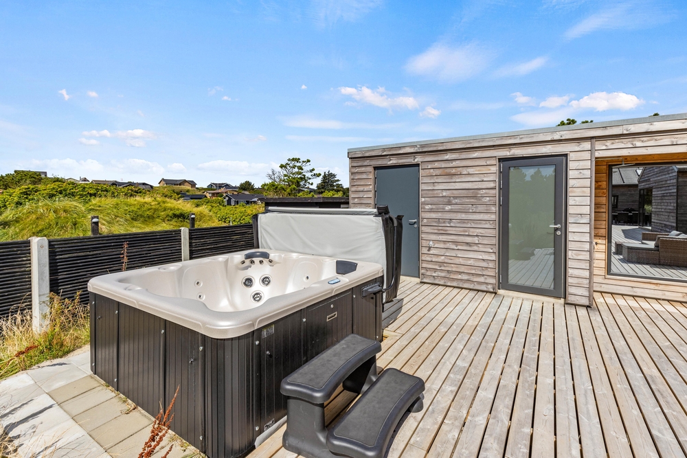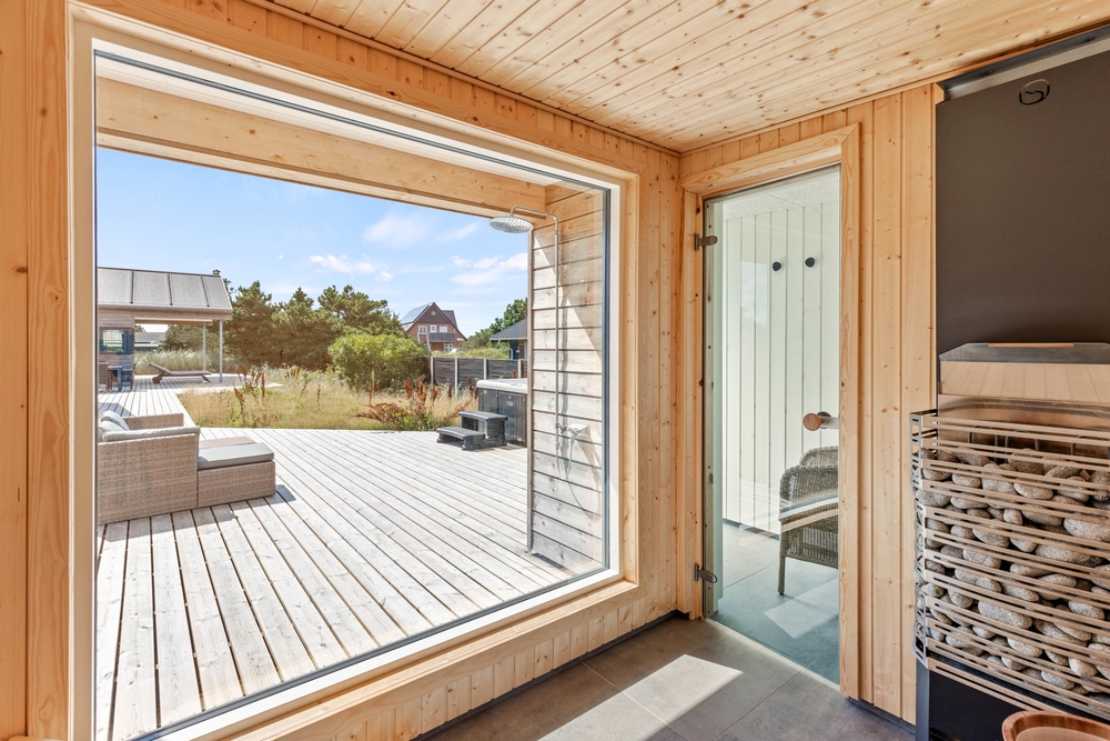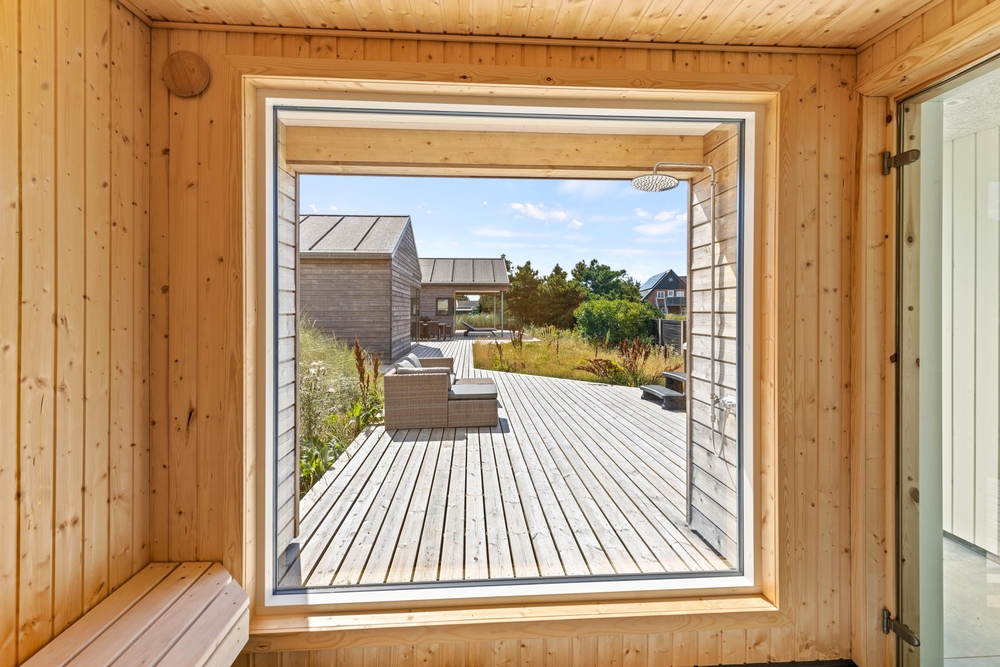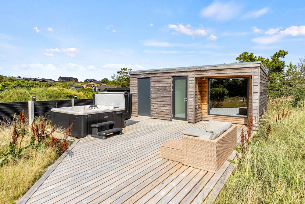 På den smukke terrasse har I god plads til at nyde de mange solskinstimer. Der er komfortable havemøbler og liggestole til rådighed, så I kan slappe af. Et højdepunkt er udendørs sauna og spa. Gå en kort tur ned til den fantastiske strand ved Vesterhavet, nyd stranden og luften, og gå tilbage igennem byen med sine mange hyggelige butikker.