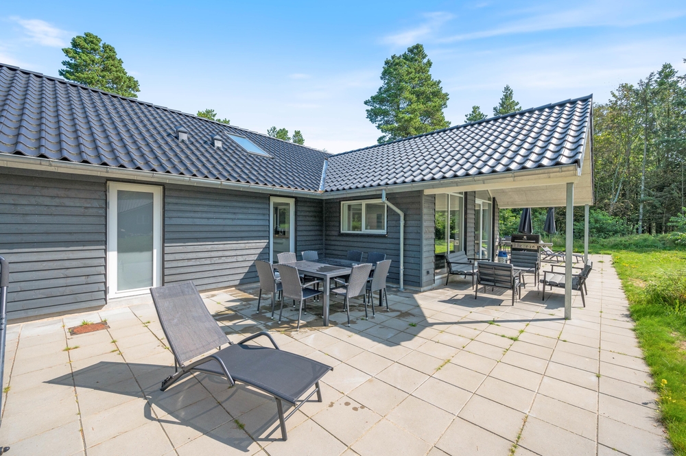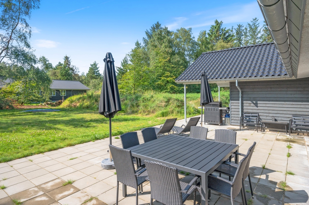 Luksussommerhuset har en kæmpe terrasse, som næsten omgiver hele feriehuset. Her finder I diverse havemøbler, så I bedst muligt kan udnytte de solrige dage på terrassen. Terrassen er også delvist overdækket, hvilket er praktisk, hvis I for eksempel ønsker at nyde frokosten udenfor i skyggen. Til sommerhuset har I også en gasgrill til fri afbenyttelse, hvor det altså går lidt hurtigere, når maden skal tilberedes. Desuden har sommerhuset et indbygget el-stik til jer, som kører elbil.
