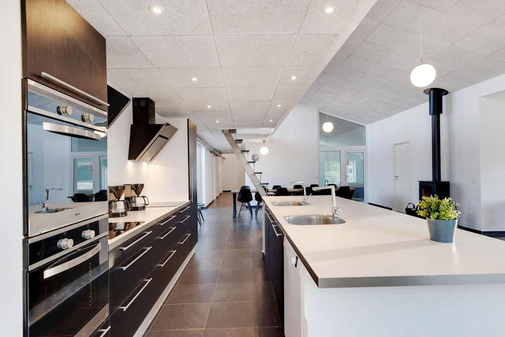 Samtidig sørger den knitrende brændeovn for den dér helt særlige feriestemning, der gør det ekstra hyggeligt at være fælles om kreeringen af en lækker 3-retters feriemenu, mens man i ny og næ kaster et blik ud på de grønne omgivelser i haven.