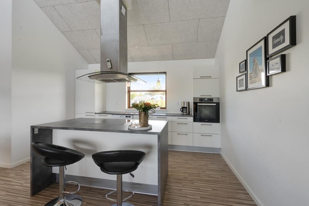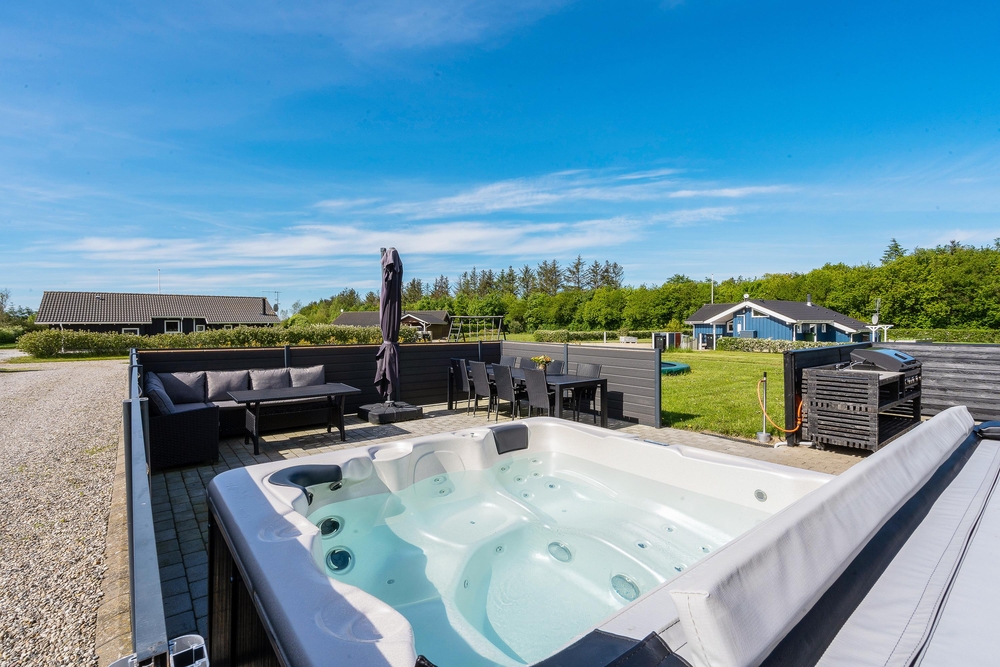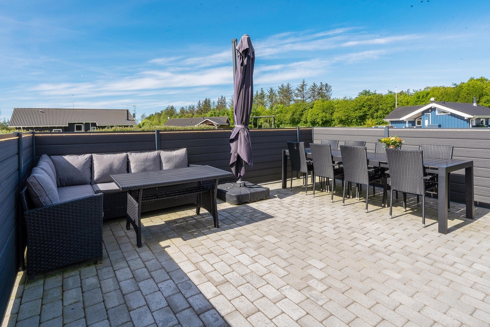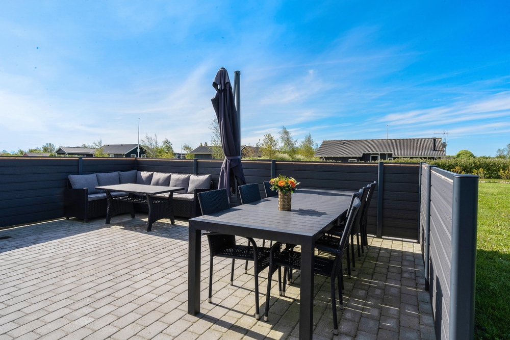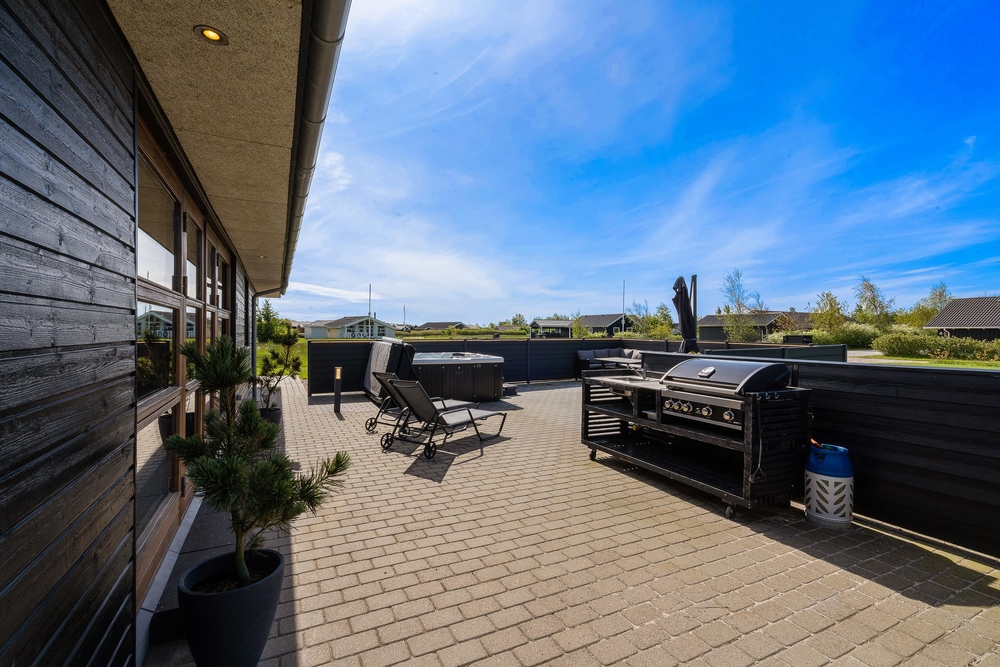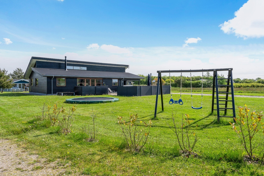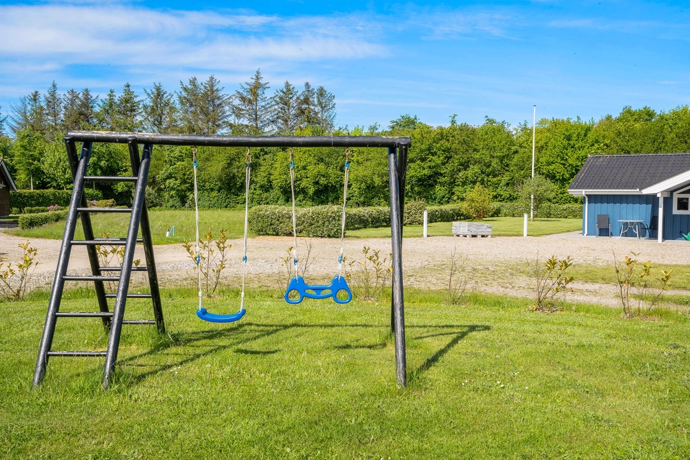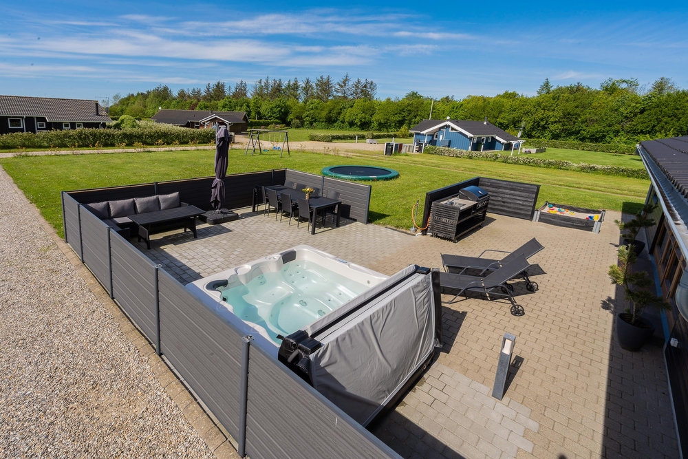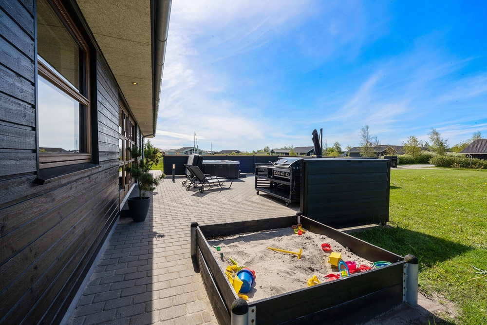 Feriehuset har en skøn og delvist afskærmet terrasse, hvor I kan bruge udekøkkenet og grillen samt nyde solen på solrige dage. Terrassen er som skabt til hyggelige stunder med familien eller vennerne, hvor I kan tilberede lækre måltider under åben himmel. For børnene er der en gynge, en sandkasse og endda en trampolin! De små vil elske at lege i denne udendørsoase, mens I slapper af med en god bog eller et køligt glas vin i hånden.