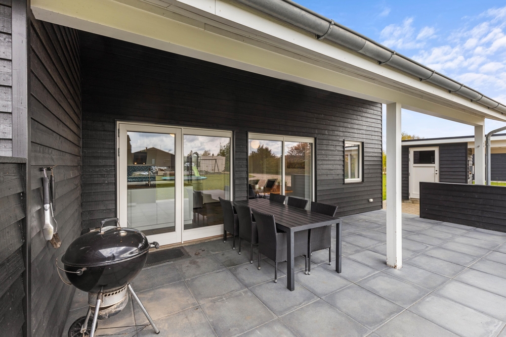 Fra køkkenalrummet kan I træde ud på den overdækkede terrasse, hvilket gør det muligt at nyde jeres måltider i alt slags vejr. Udsigten til den omkringliggende natur og lyden af fuglekvidder skaber den perfekte ramme for afslapning og gode samtaler. Højdepunktet udendørs er helt sikkert den afskærmede terrasse, hvor I både finder en behagelig spa, udebruser og sauna. Udebruseren kan benyttes fra april til november, hvilket giver jer mulighed for at nyde de forfriskende faciliteter i lang tid af året.