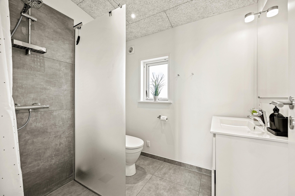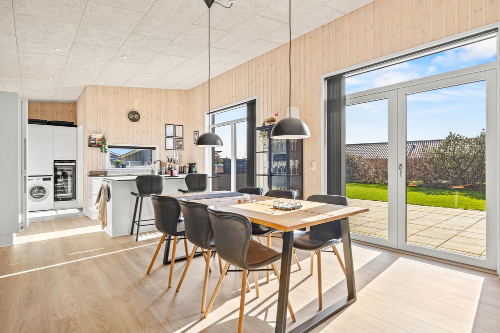 Ferielivet gøres let og bekvemt med den medfølgende vaskemaskine og tørretumbler, der gør det nemt at holde styr på feriegarderoben. Køkkenet er hjertet af huset, med en moderne og lys atmosfære, og det er forbundet direkte til både stuen og spisestuen. Her kan nogle af jer hygge omkring madlavningen ved det flotte køkken, mens andre samles omkring spisebordet til en hyggelig omgang puslespil eller diverse kortspil.