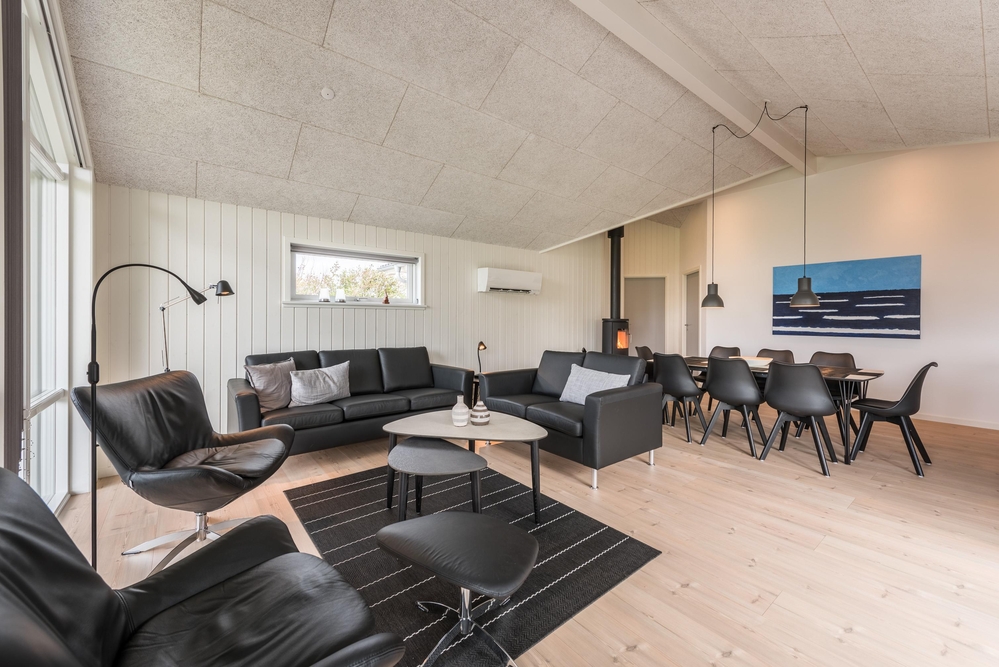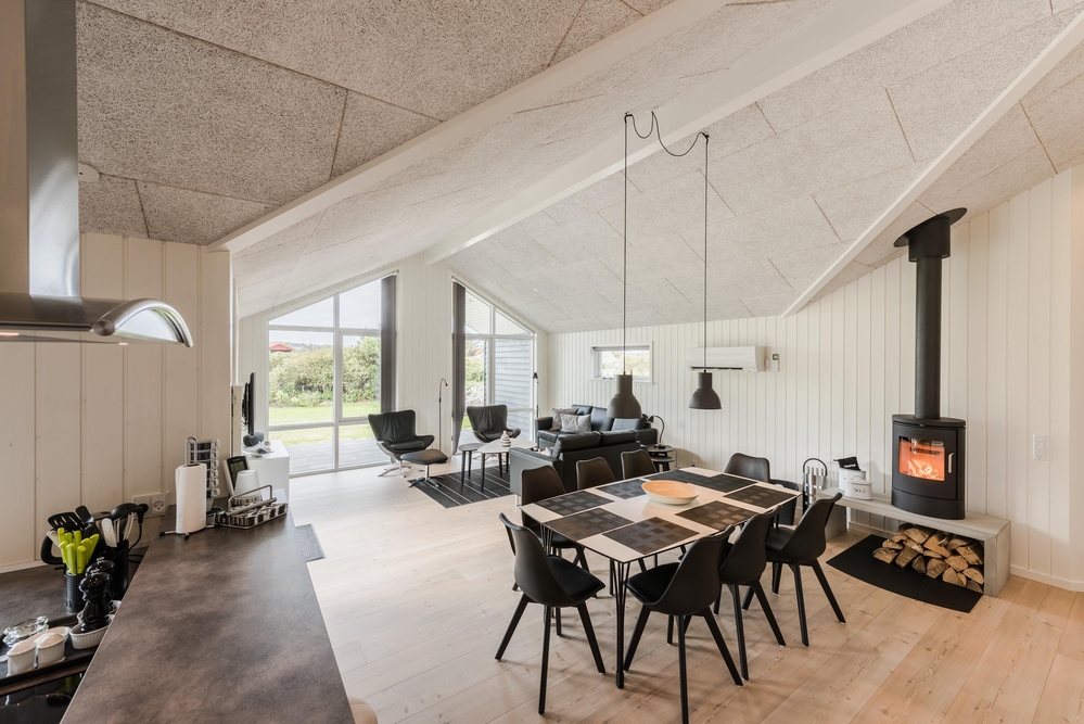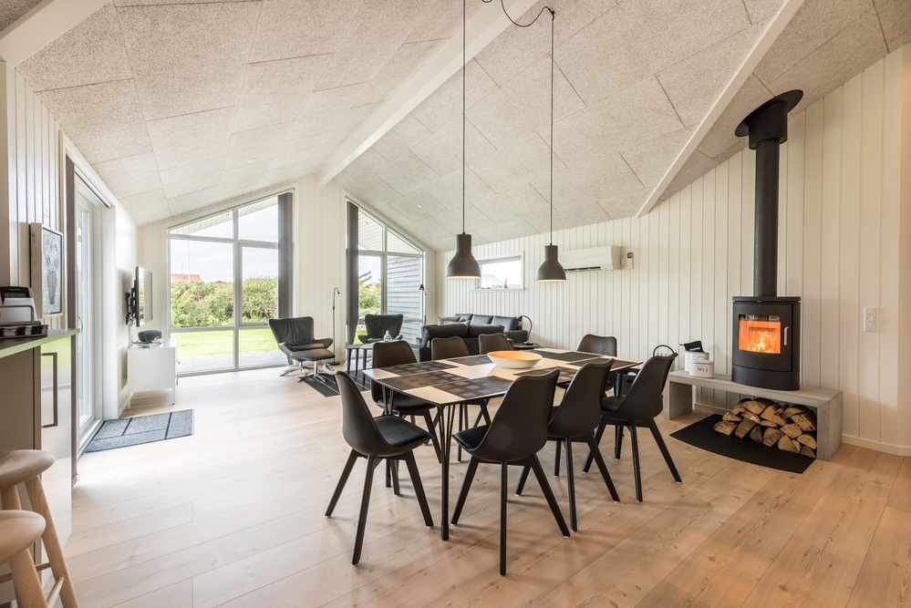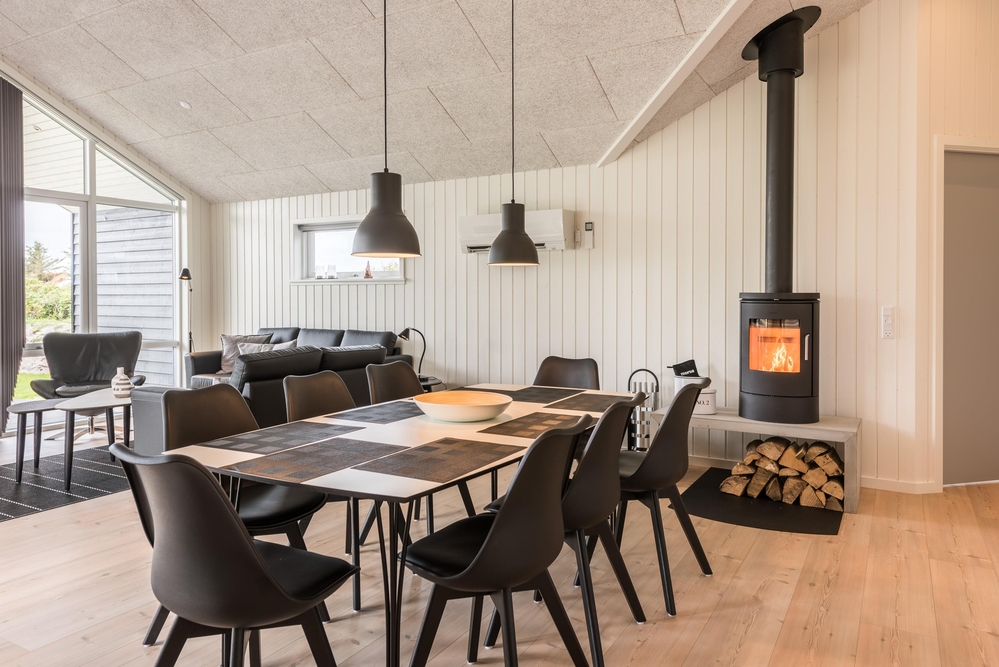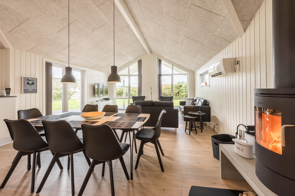 Hvem ville ikke sidde her og nyde varmen fra brændeovnen på en kølig dag, og da især efter en rask travetur til havet ? så falder der ro på alle. Og hvis I virkelig trænger til at blive varmet rigtig godt igennem, er der en dejlig sauna, hvor I kan slappe af og nyde et strejf af hjemme-wellness, mens børnene ser film på det store fladskærms-TV i huset eller surfer på husets stabile fiberinternet. En luft-til-luft varmepumpe bidrager til et behageligt indeklima i hele huset.