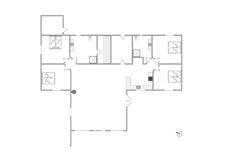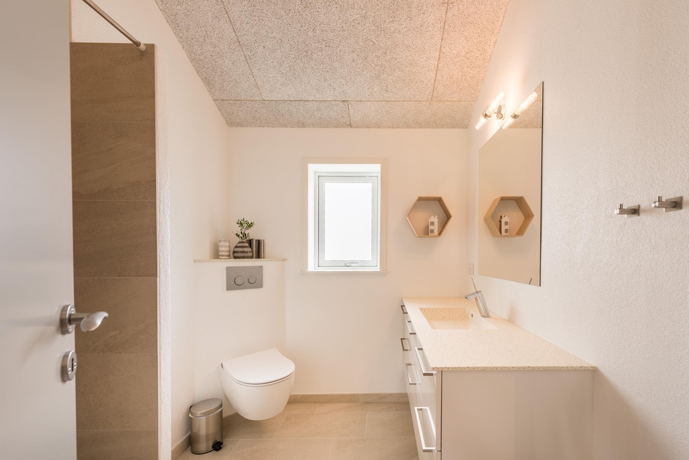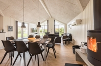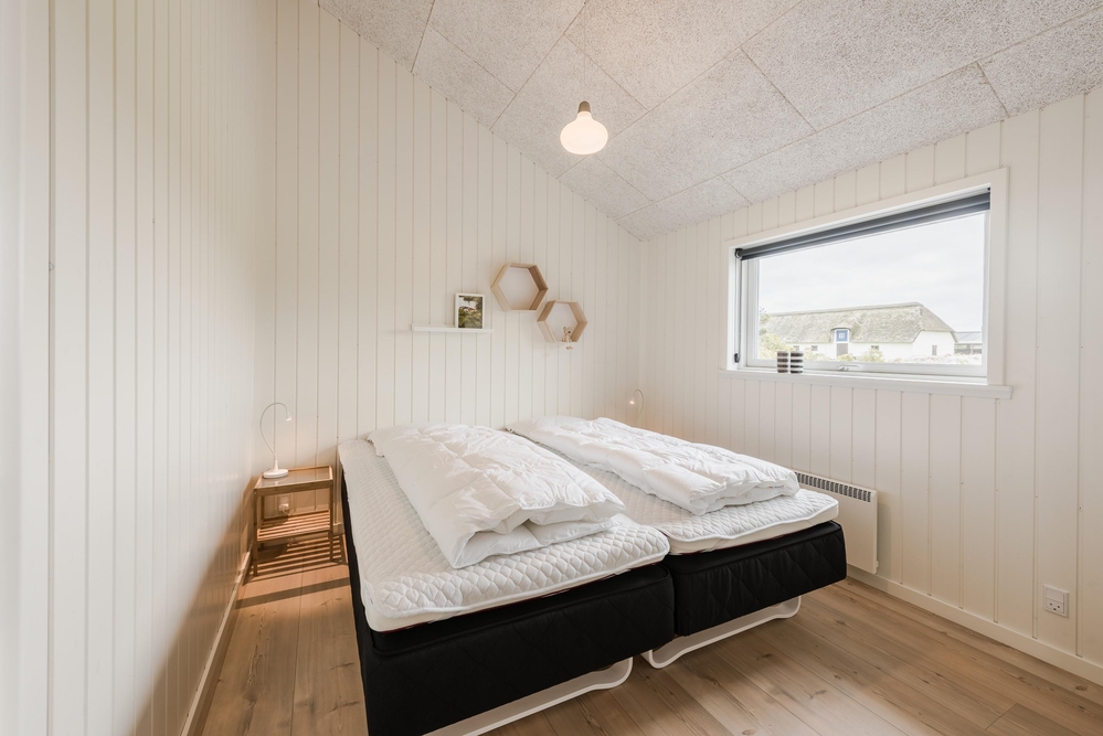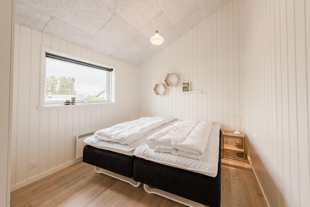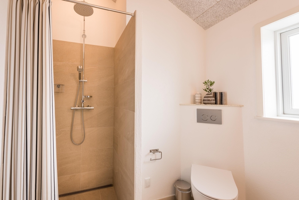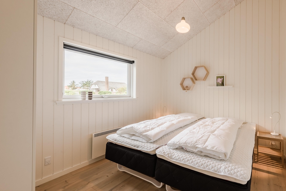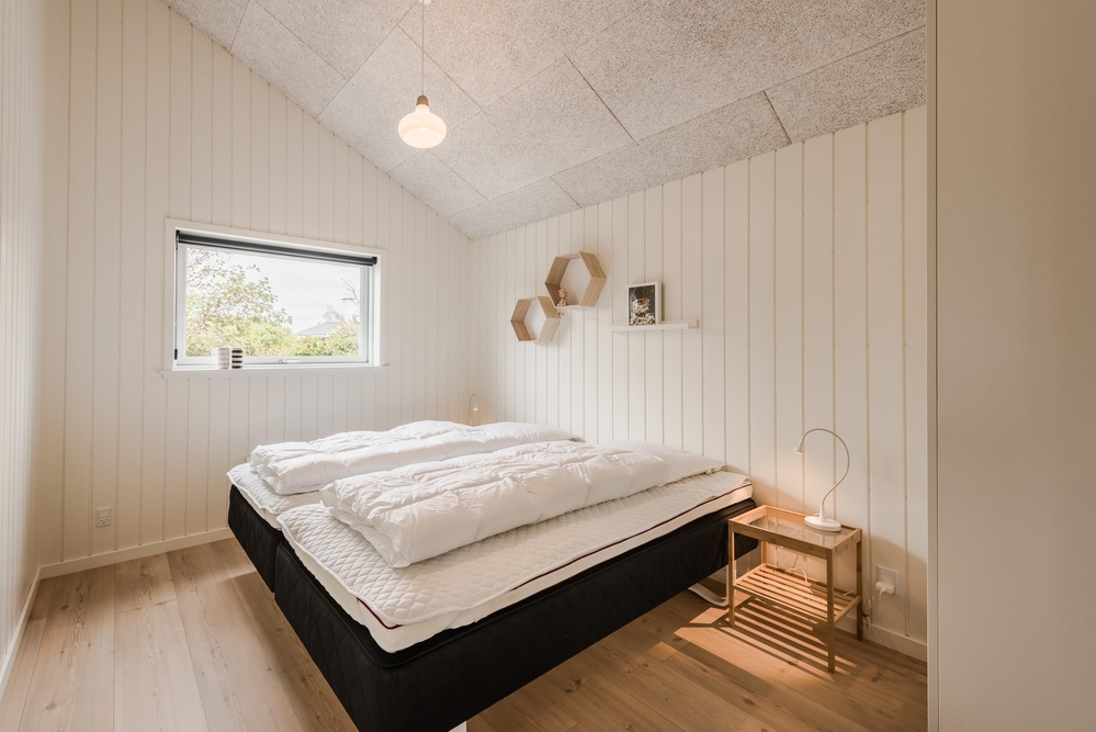Sommerhuset byder på 120 kvadratmeterfordelt på fire rummelige soverum, hver med deres egen dobbeltseng, så I kan nyde en rolig og afslappet nattesøvn. To moderne badeværelser med gulvvarme sikrer, at komforten er i top, selv på de køligere dage. Om aftenen kan I samles i den hyggelige stue hvor der er loft til kip, hvilket skaber en skøn og dejlig rummelig stue. Her er der en brændeovn, der er med til at sprede varme og hygge, mens I nyder hinandens selskab.