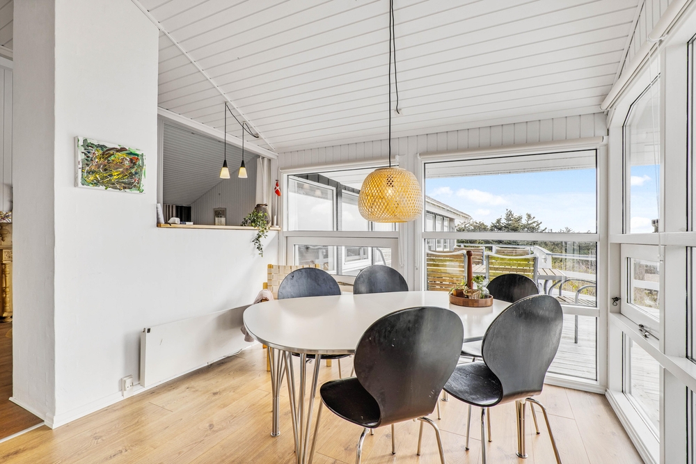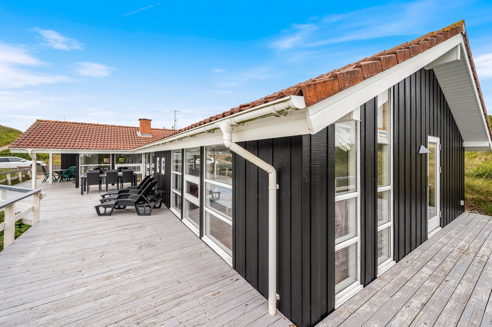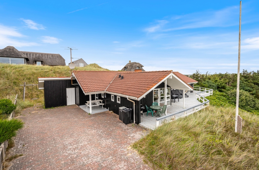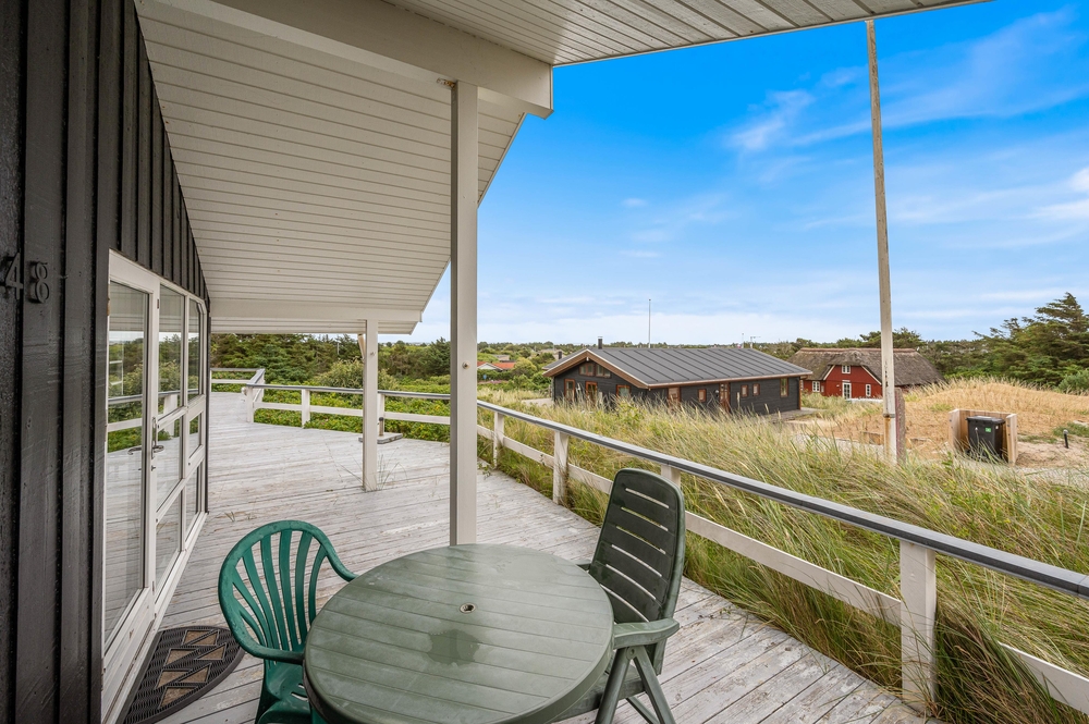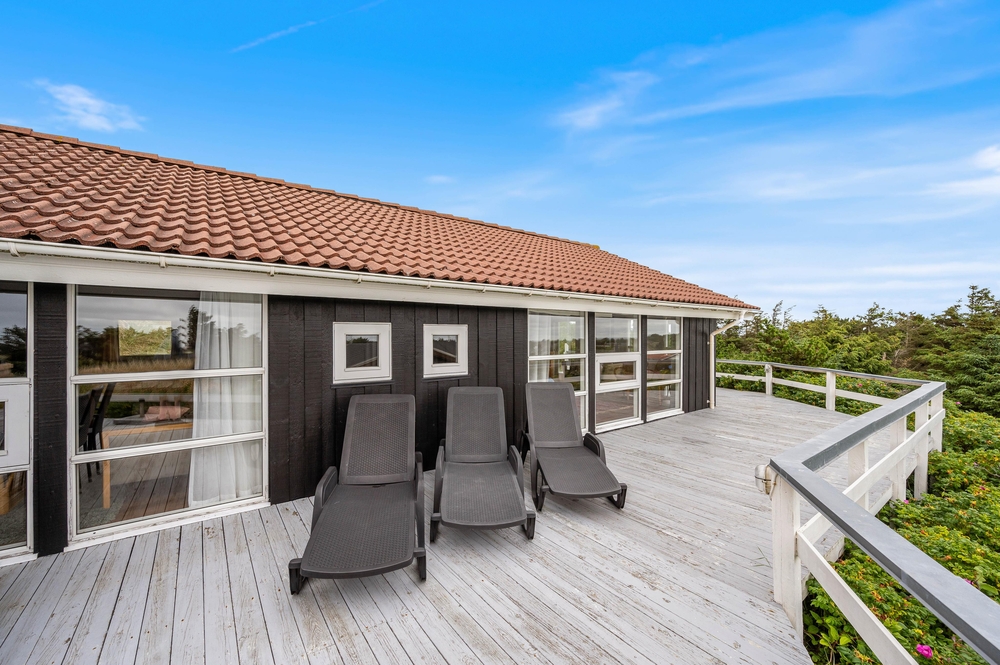 Med dette sommerhus får I en helt enestående god udsigt ud over den vestjyske natur. Der findes intet bedre end at stå op, lave en kop kaffe og tage den med ud på terrassen, hvor I kan nyde den fantastiske panoramaudsigt. Skinner solen, er det selvfølgelig oplagt at tilbringe dagen udenfor i det skønne vejr, og på den fine terrasse, står havemøblerne og liggestolene allerede klar til jer. Til de mindste er der i haven både gynger og en sandkasse.