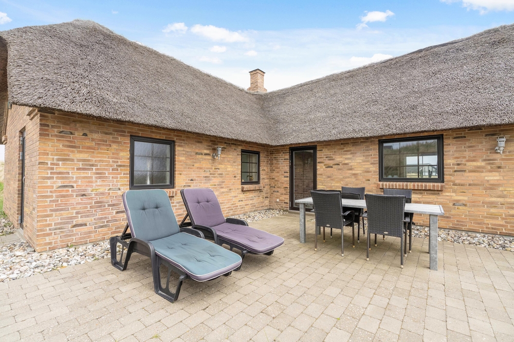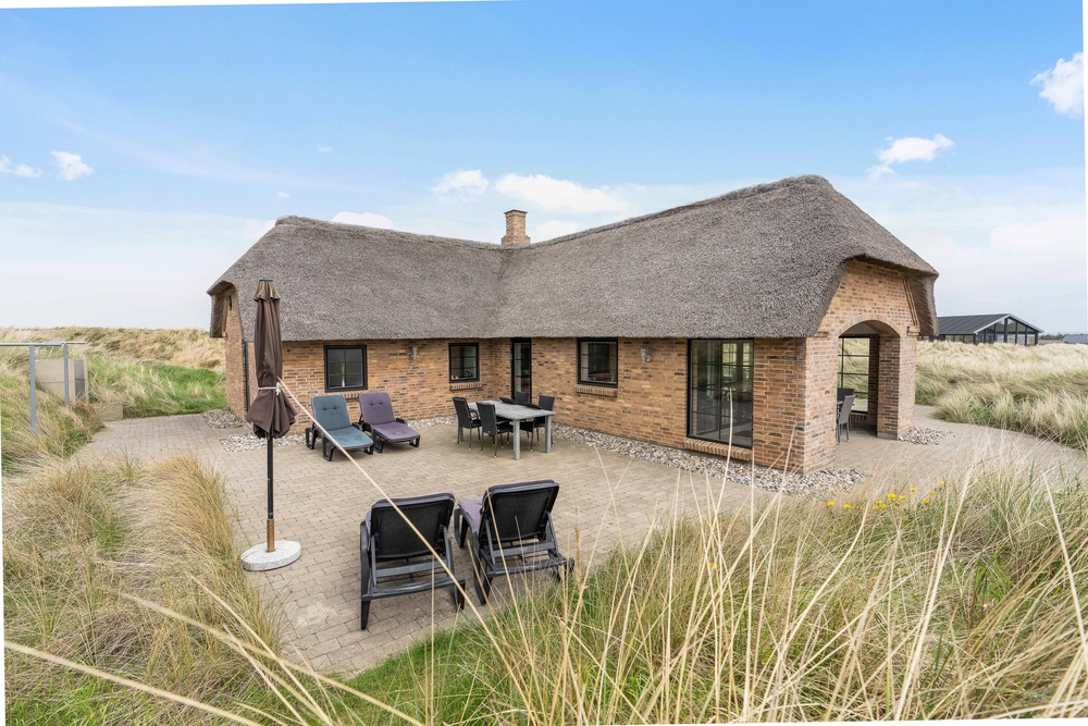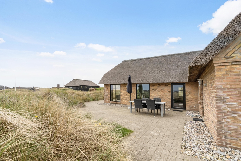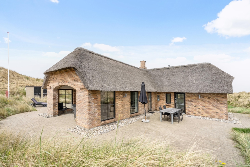 Feriehuset er opført i en flot traditionel stil med stråtag og flere terrasser, så det også udefra emmer af ferie med hygge, afslapning og kvalitetstid med familien.