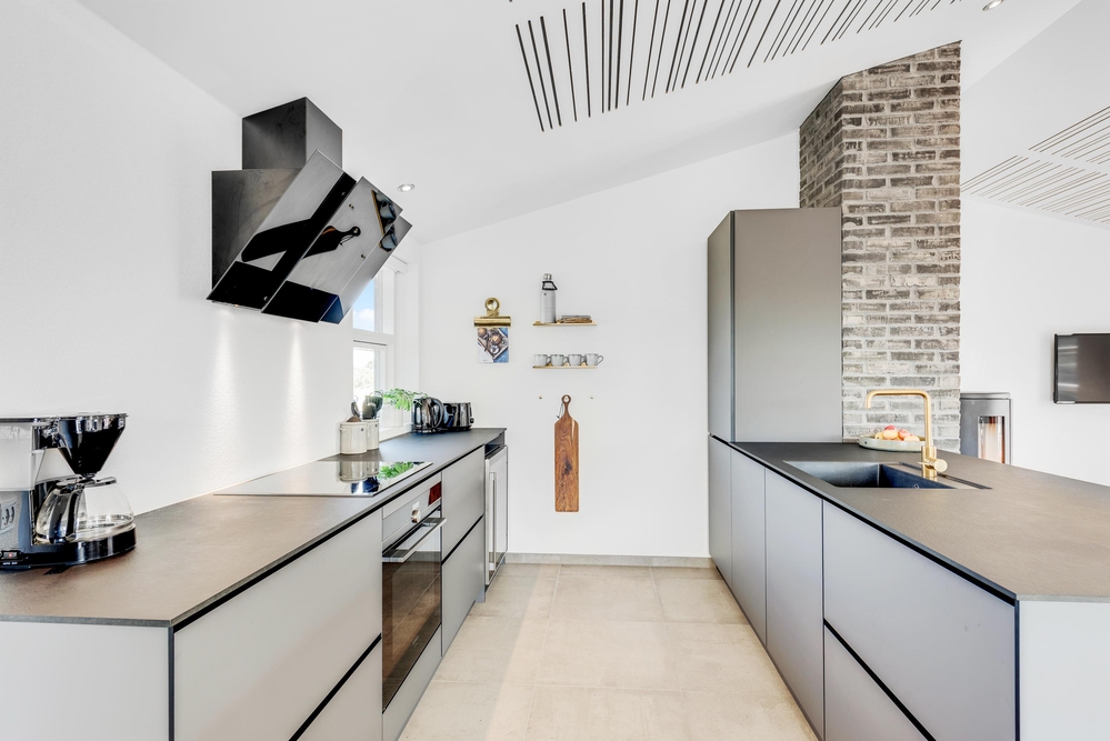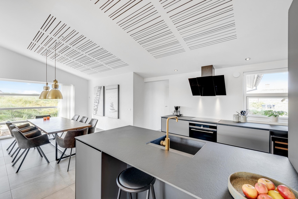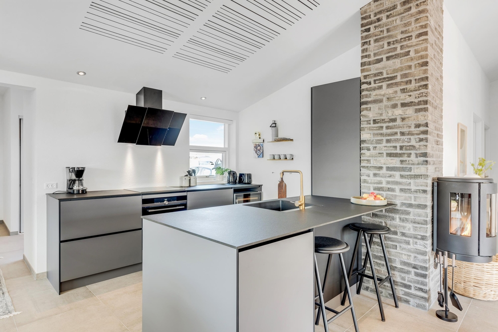 Det flotte sorte sommerhus har et stort opholdsrum, hvori stuen og køkkenet indgår ? Dette fungerer altså som feriehusets hjerterum, hvor der er plads til hele jeres familie. Nyd nogle hyggelige og afslappende dage med hinanden ? Hvor det eneste I behøver at bekymre jer om, er hvad aftensmadsmenuen skal stå på. I kan også slappe af foran tv?et i stuen og hvis man ønsker at se en anden film end de andre, er der tv i alle soverrum.