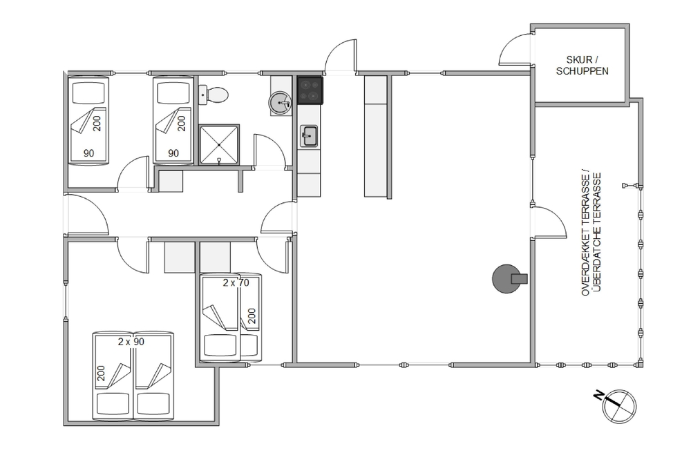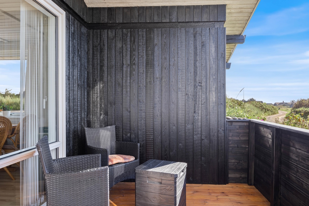 Ud over den gode indretning, så er der er flere terrasser til huset som også forlænger mulighederne for at slappe af og nye kvalitetstid udenvendigt. Den ene terrasse mod øst er helt lukket og den mod syd er delvist overdækket og lukket. Samtidigt er den delvist afskærmet med en stor glasvæg, som danner læ for vinden, men hvor man stadigvæk føler man er ude i den smukke natur. Et perfekt sted om aftenen at grille og nyde et glas kold vin eller andre drikkelser. Udvendigt er huset også perfekt til børn. Her kan de lege i sandkassen eller svinge sig en tur i gyngerne.