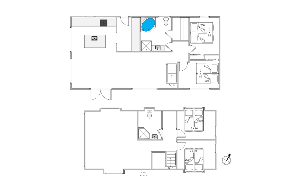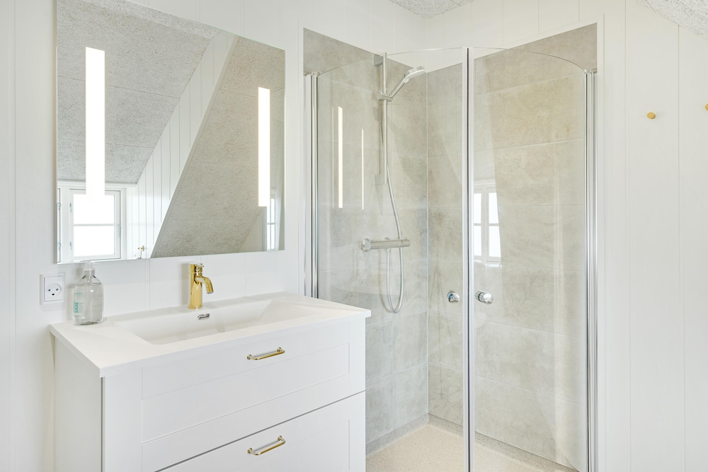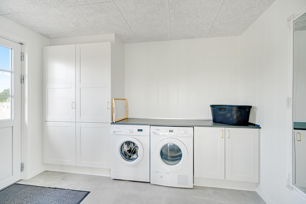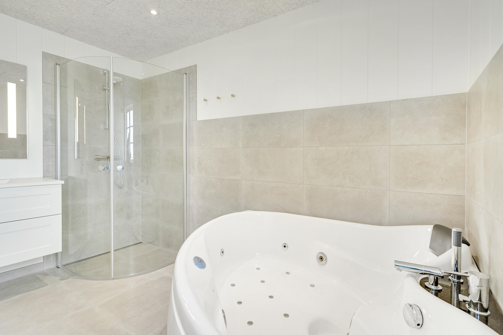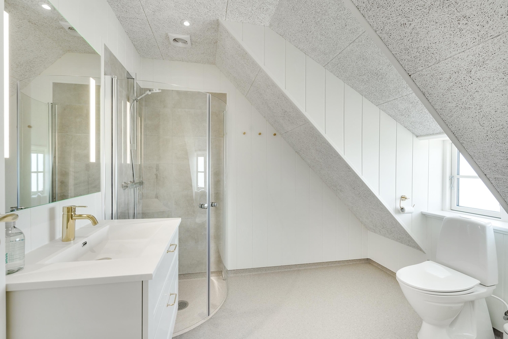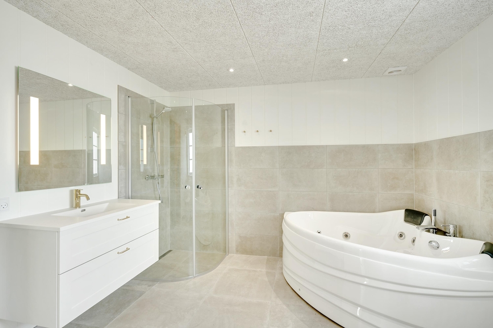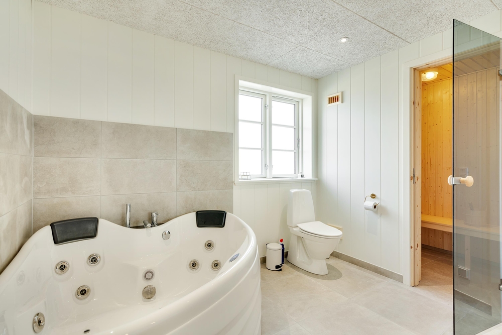 Med 2 badeværelser (med gulvvarme) ? ret praktisk et på hver etage ? slipper I for lange køer til toilettet om morgenen, og på det ene badeværelse kan I tanke nye kræfter på ferien i saunaen og spabadet.