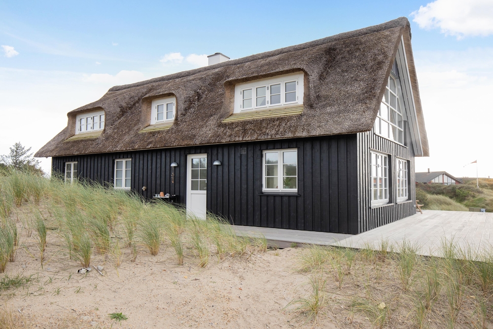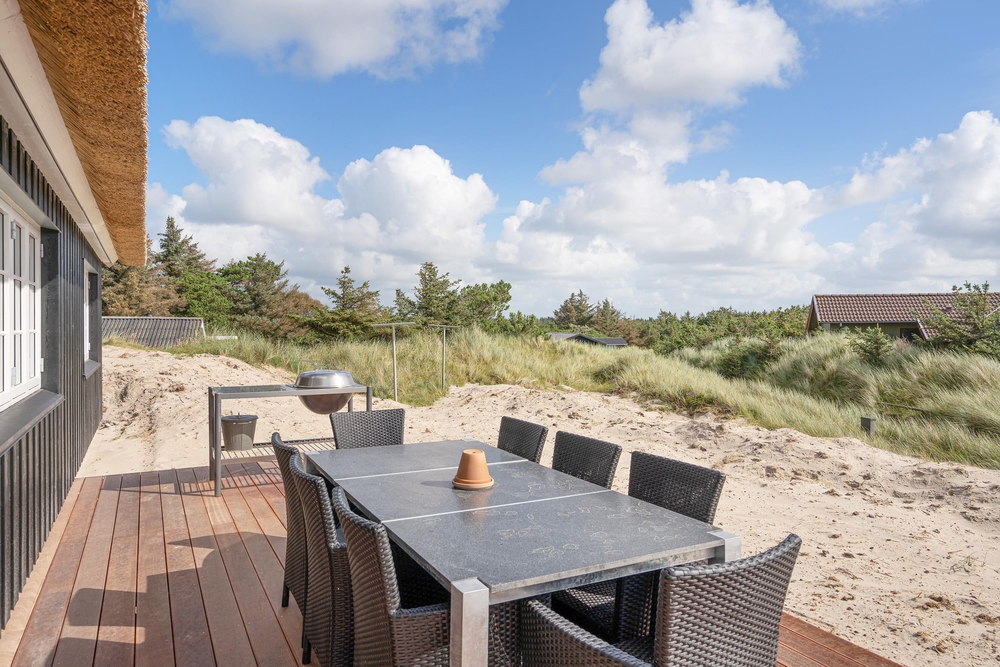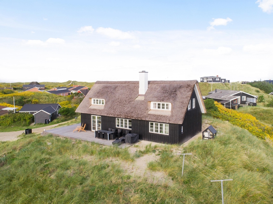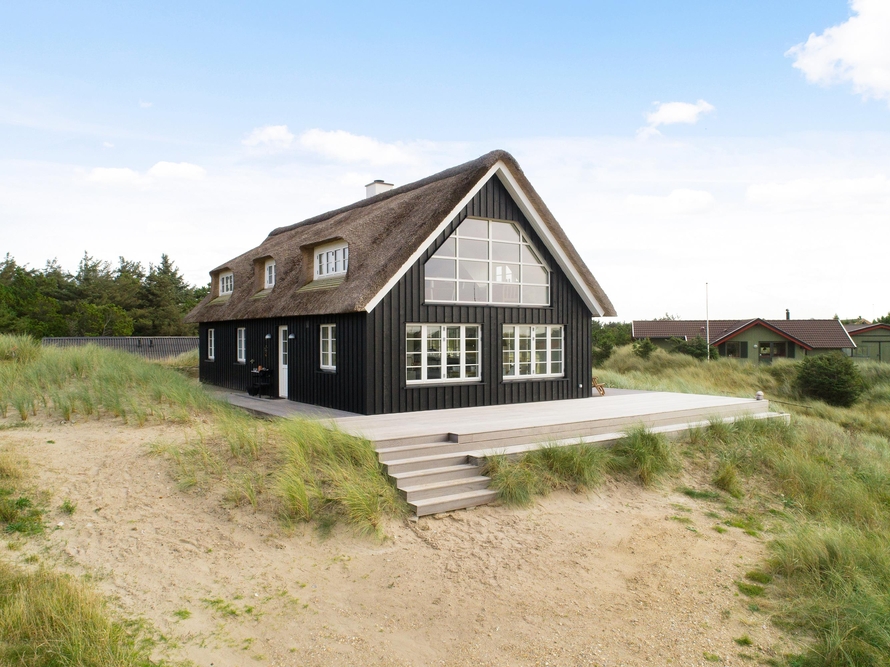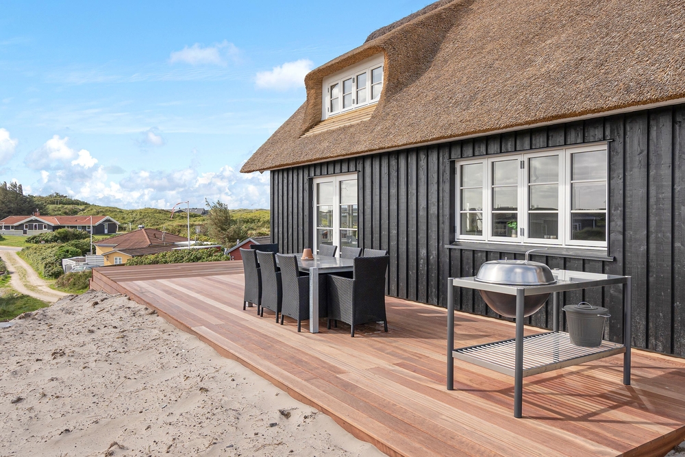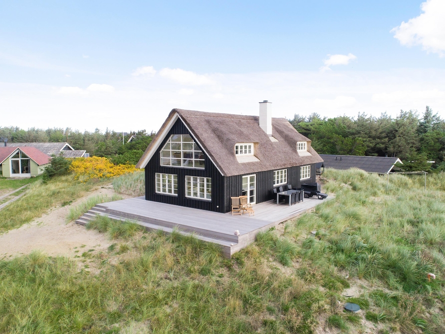 Dette stråtagshus tæt på stranden i Vejers har plads til 8 personer og har ? blandt andet en dejlig stor terrasse og et spabad. sommerhus med sauna, spabad og attraktiv beliggenhed