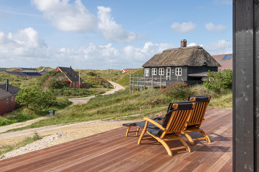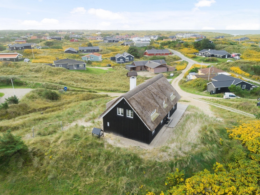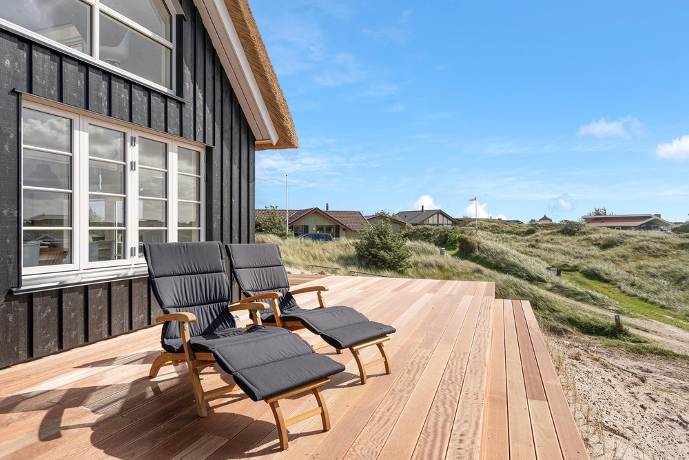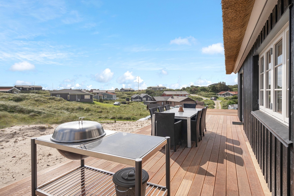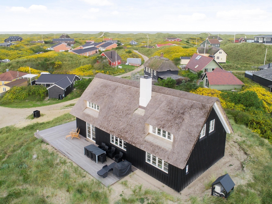 Dette stråtagshus tæt på stranden i Vejers har plads til 8 personer og har ? blandt andet en dejlig stor terrasse og et spabad. sommerhus med sauna, spabad og attraktiv beliggenhed