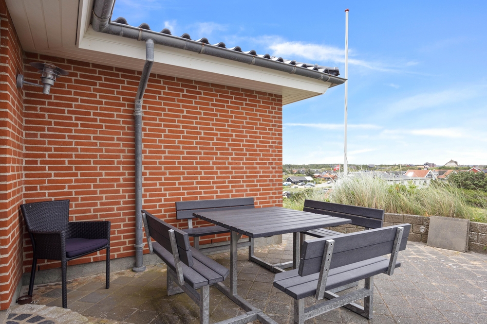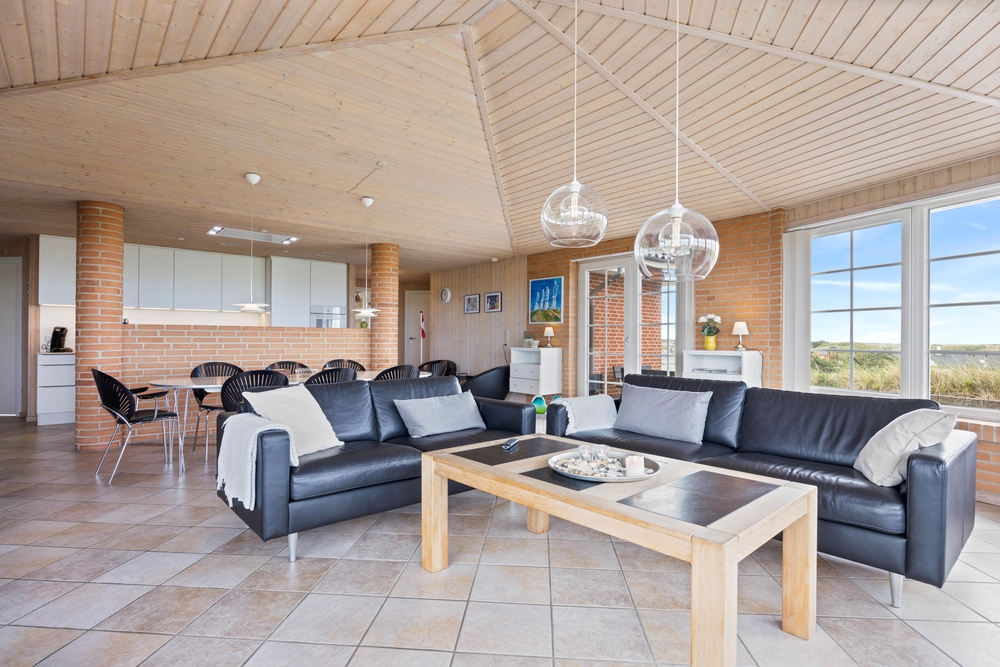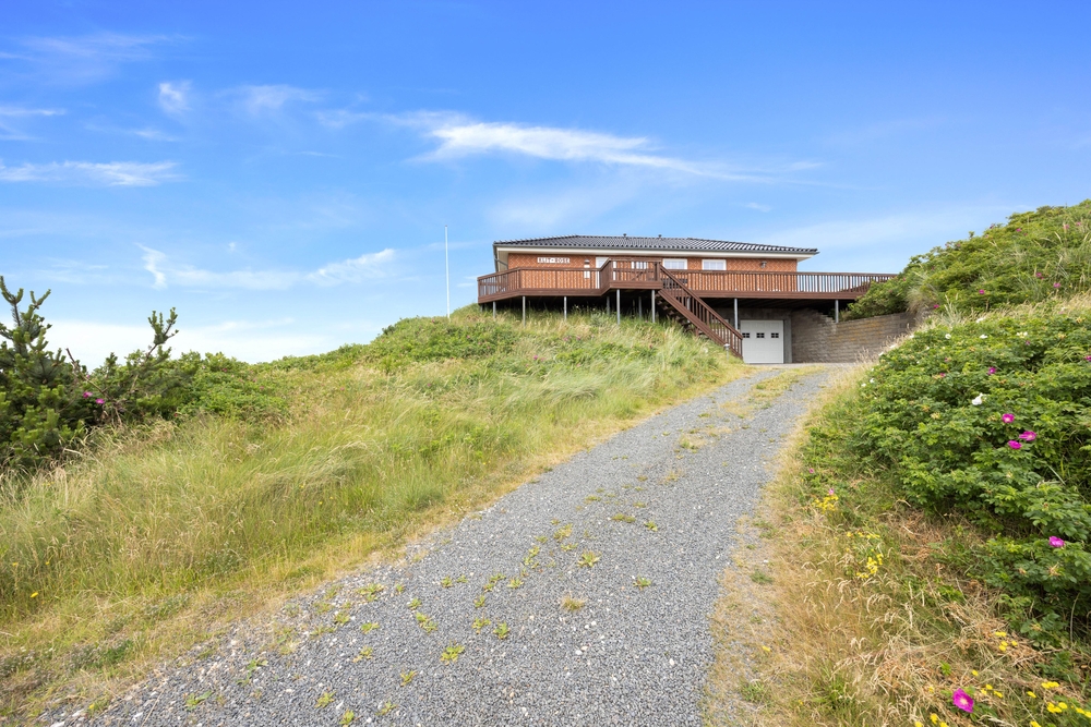 På toppen af en klit finder I dette fine sommerhus med plads til 8 personer. Et solidt og rummeligt feriehus med spa og sauna. Sommerhuset er beliggende på Nordvej 5 i feriebyen, Vejers, på en stor klitgrund (7.688 m2) med flot panoramaudsigt over klitlandskabet. Det er muligt via en sti, der hører til feriehuset, at gå direkte ned på Nordstranden og kun 150 meter fra det brusende Vesterhav. Hjertelig velkommen!