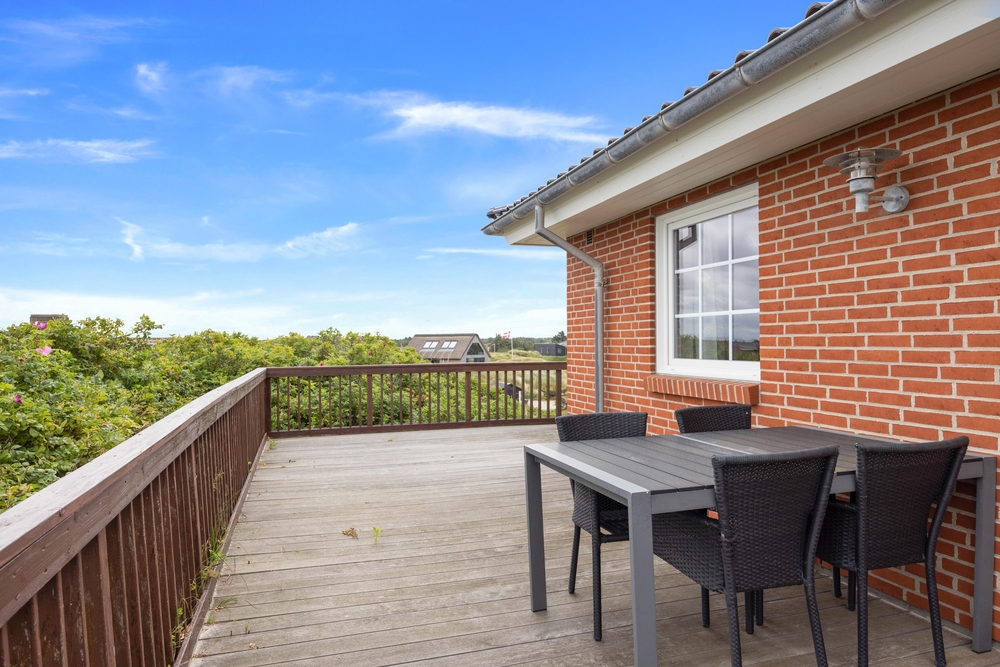 Når I har parkeret bilen, vil en lang trappe føre jer op til feriehuset, der er beliggende højt oppe på en klit. Feriehuset er 152 m2 og funktionelt indrettet. Sommerhuset har en hyggelig rummelig atmosfære, og det fremstår lyst og venligt med den enkelte indretning. Her er god plads til familielivet!