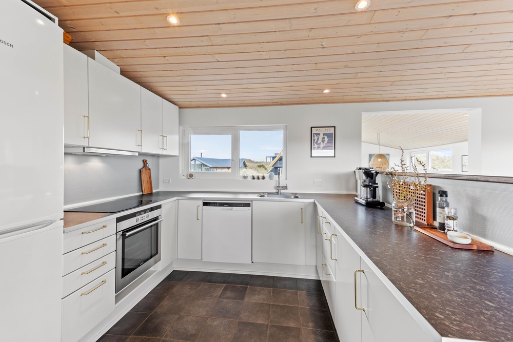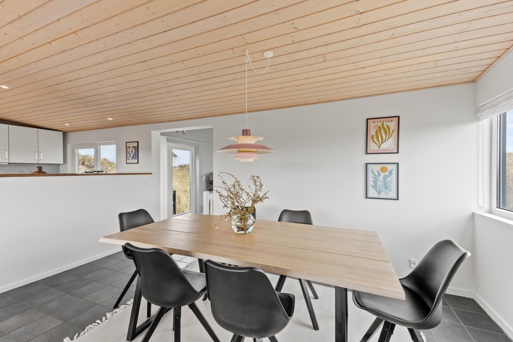 I feriehuset bliver I mødt af en hyggelig indretning, der bliver komplimenteret af lysindfaldet fra de mange vinduer. Samtidig giver de mange vinduer jer også en dejlig udsigt over det område, sommerhuset ligger i med udsigt til både klitter, rå-og kronvildt.