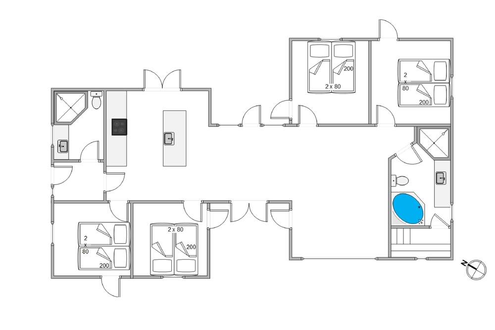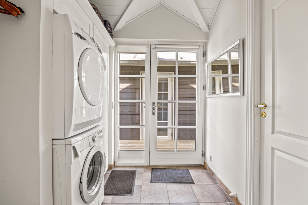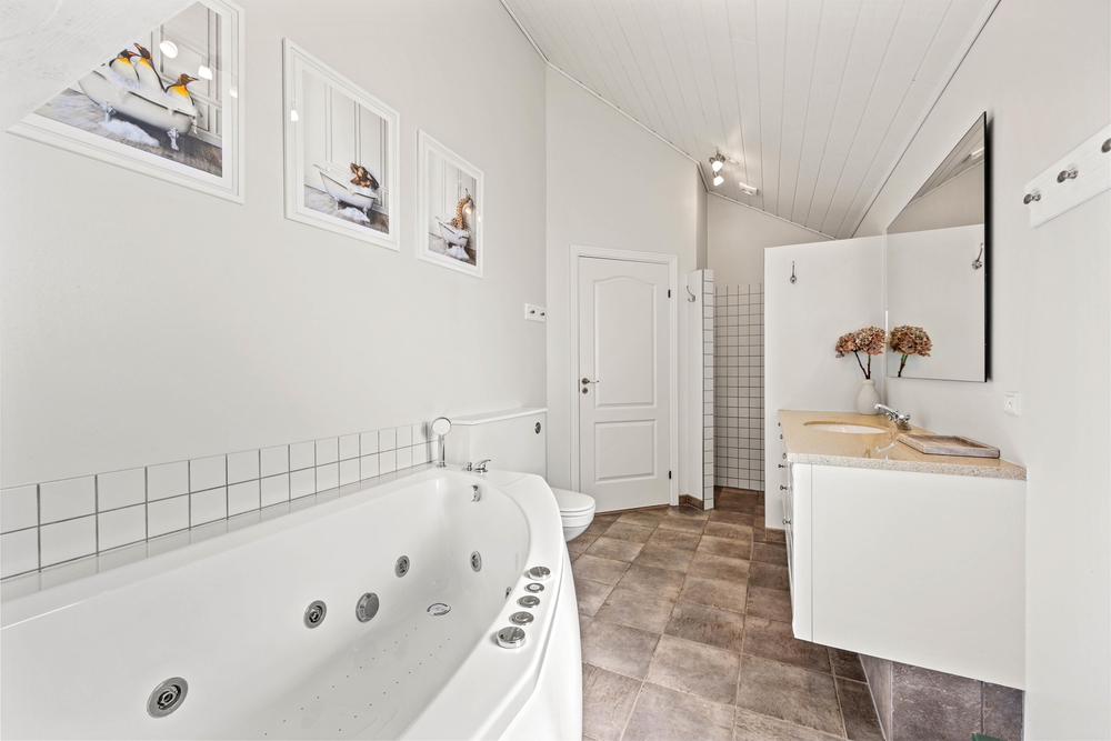 Huset er indrettet med 2 badeværelser (med gulvvarme), og på det største badeværelse får I jeres helt egen lille wellnessoase med sauna og spabad. Få varmen efter en forfriskende gåtur langs vandet eller rund en dejlig feriedag af med en afslappende wellness-session ? så bliver det ikke bedre!