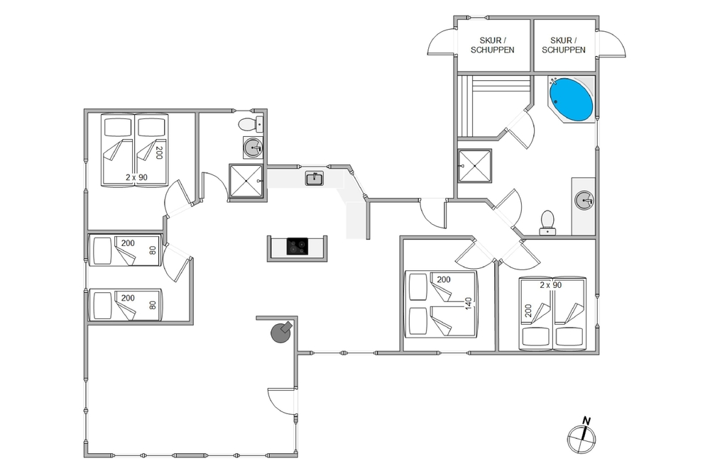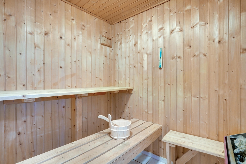 I det største af to badeværelser finder I jeres helt egen wellnessoase med sauna og stort spabad. Her kan I forkæle jer selv og hinanden lidt ekstra, og på de sene aftener, når børnene er blevet lagt i seng, kan I læne jer tilbage i varmen og tanke energi til endnu en dejlig feriedag.