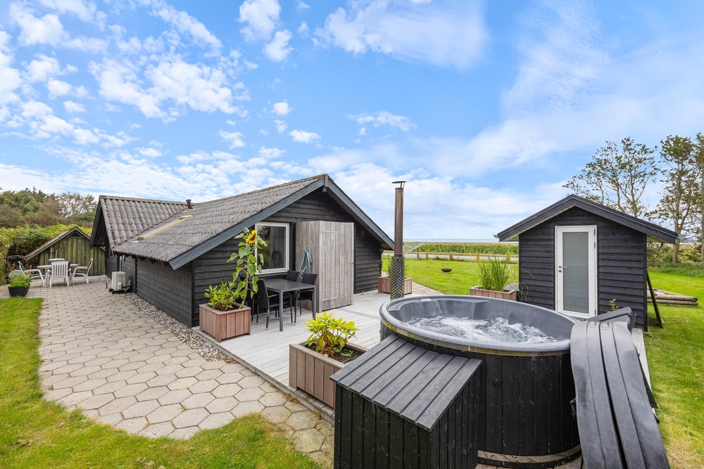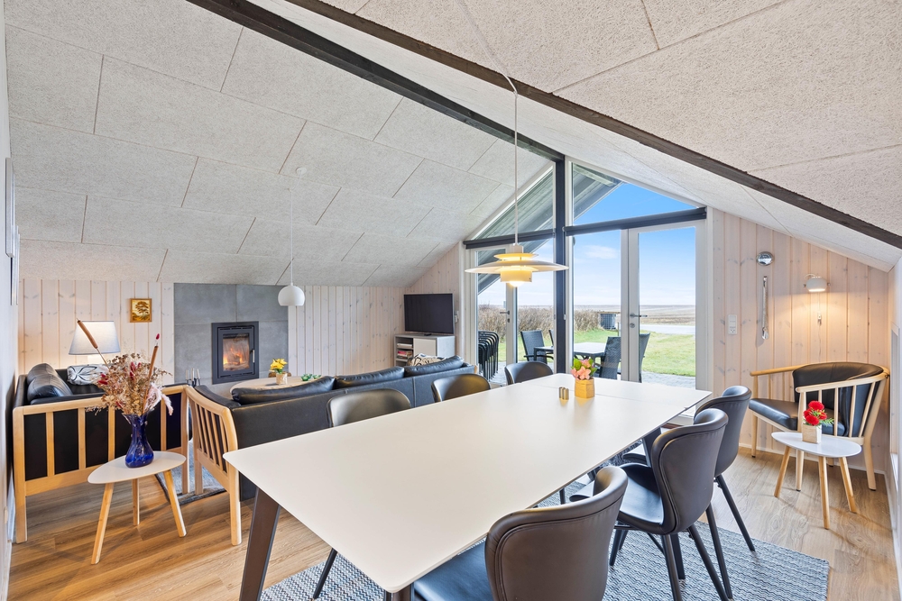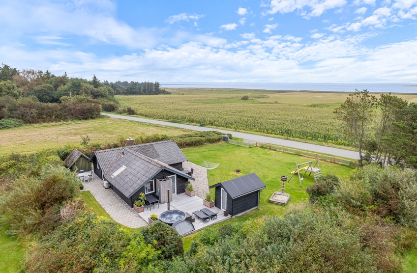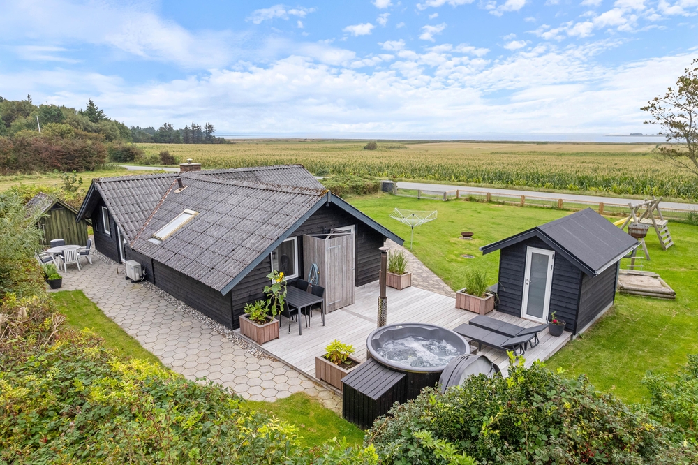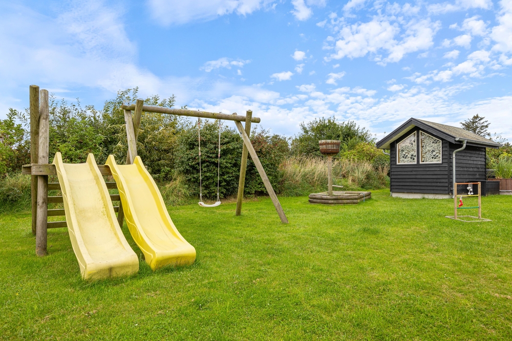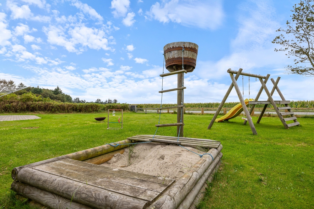 Udendørsområdet imponerer med sin overdækkede terrasse, så I kan nyde den friske Vesterhavsluft uanset vejret. Her kan I se børnene lege på legetårnet, hvor de kan klatre, rutsje og gynge. Her kan de virkelig slå sig løs. Jeres 2 hunde vil også nyde den store have. Fra feriehuset har I en fantastisk panoramaudsigt over landskabet med Nissum Fjord i baggrunden.