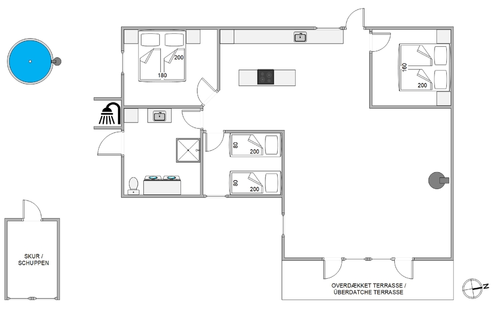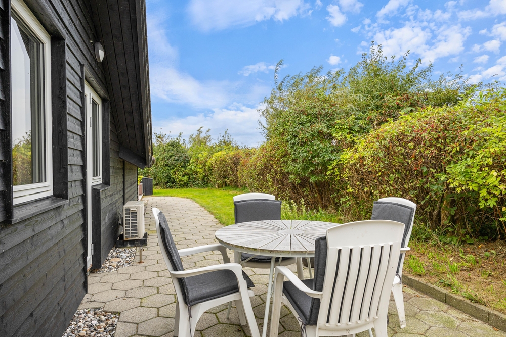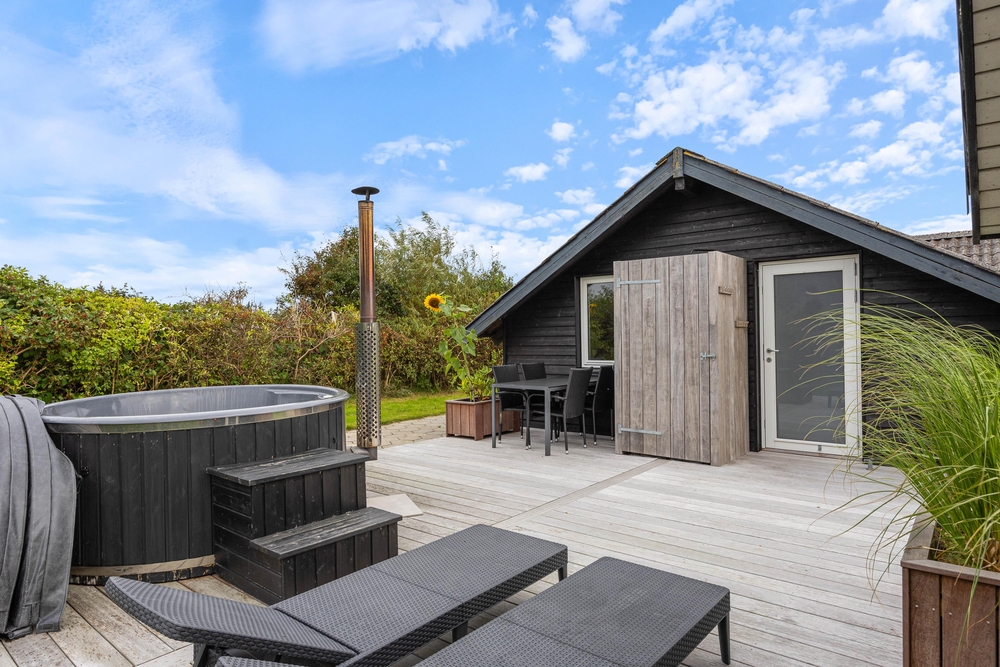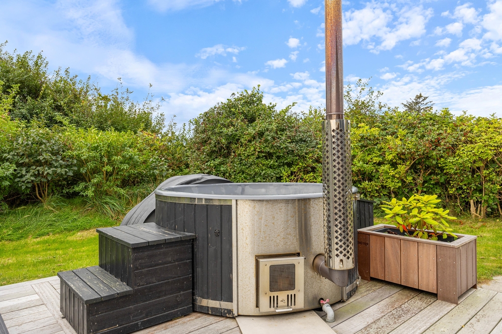 Når I kommer tilbage til feriehuset efter en tur på stranden, kan I benytte udendørsbruseren til at vaske sandet væk. Udebruseren kan benyttes fra april til november. Om aftenen kan I tænde op i grillen og slappe af i havemøblerne. Et af feriehusets højdepunkter er vildmarksbadet og udesaunaen, hvor I rigtig kan blive varmet igennem, efter en god feriedag. Her kan I nyde stjernehimlen om aftenen, mens I lytter til lyden af Vesterhavet i baggrunden.
