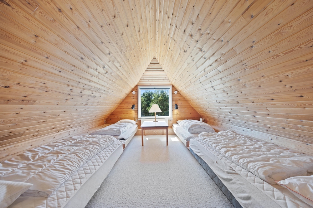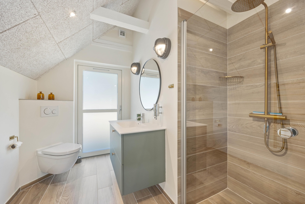 Der er 2 badeværelser med gulvvarme, så I behøver ikke at stå i kø til morgenbadet. I annekset er et soveværelse med dobbeltseng, derudover er der et soveværelse i stueplan og 2 soveværelser på 1. sal i feriehuset, alle med enkeltsenge. I sommerhuset er vaskemaskine, tørretumbler og en energibesparende varmepumpe.