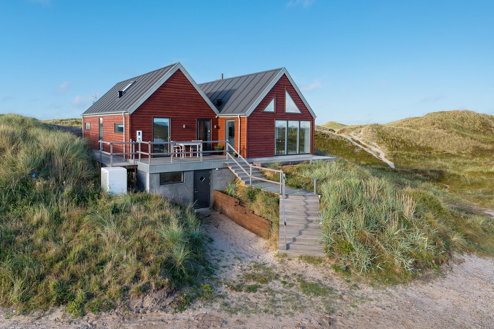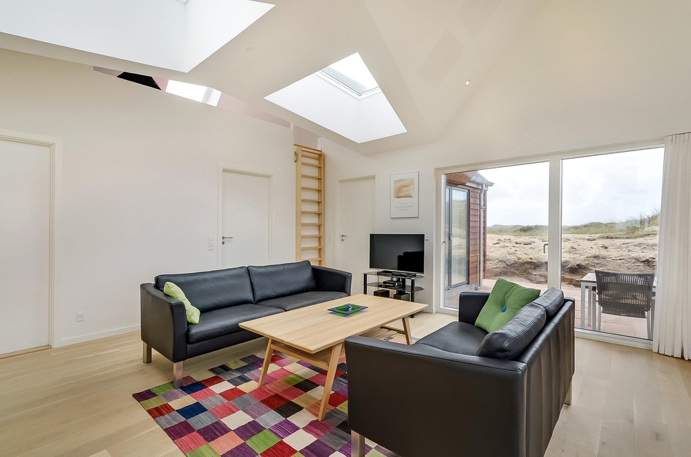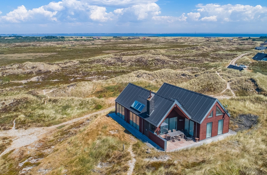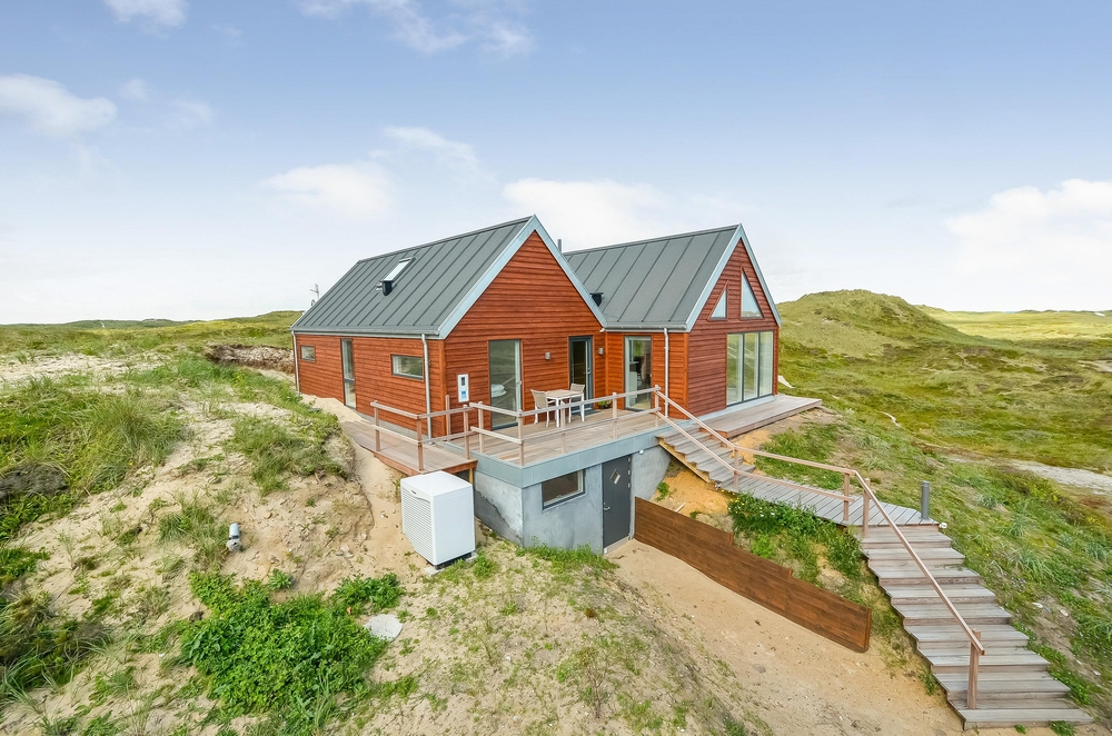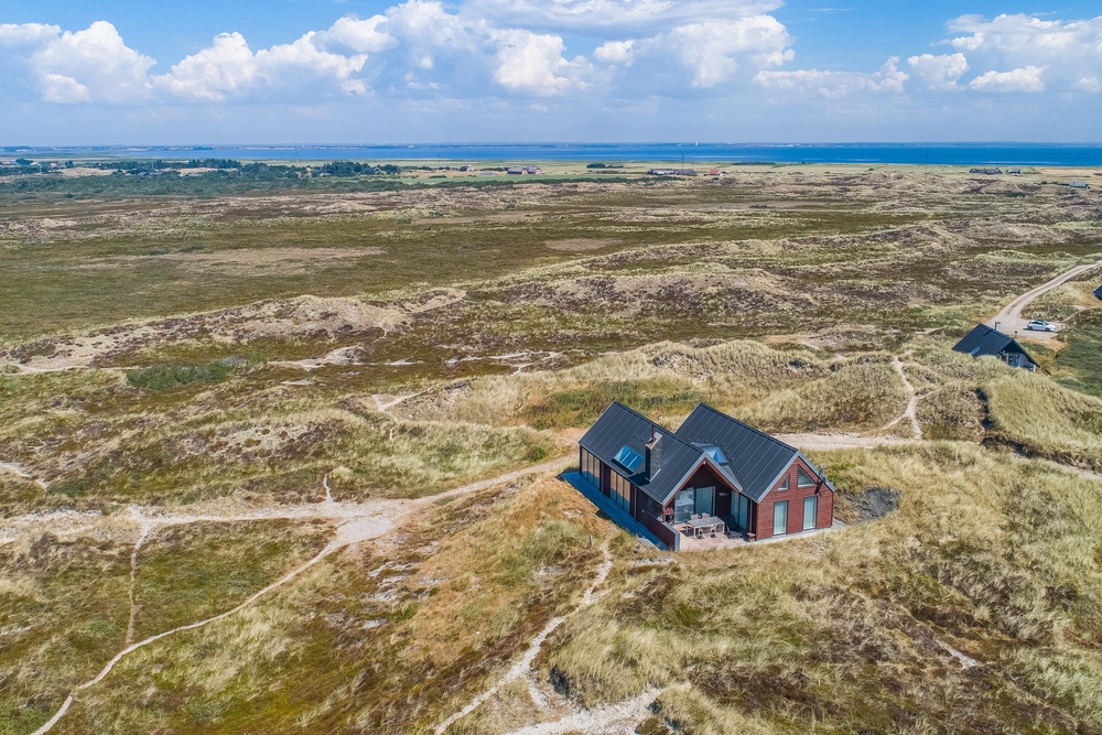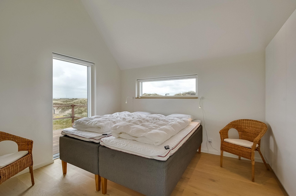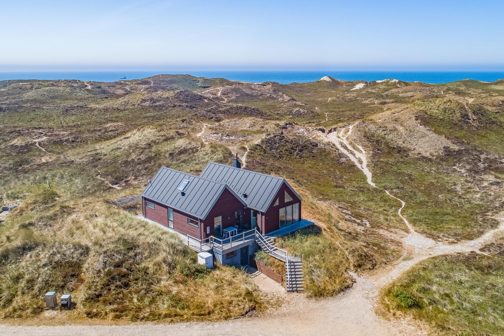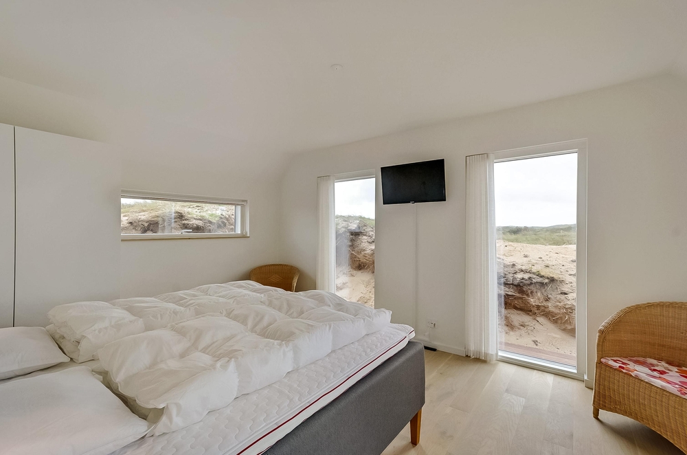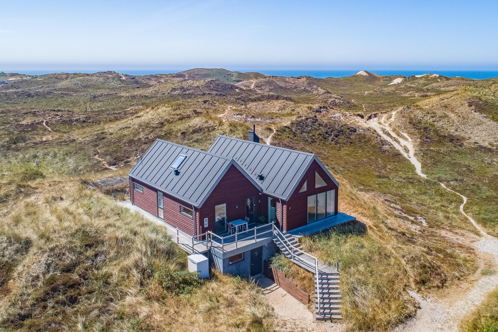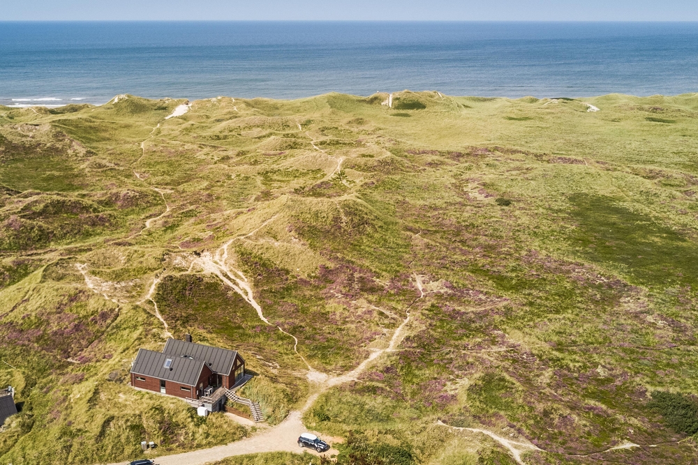 Meget få huse har så unik en beliggenhed som dette hus. Der er ikke kun beliggende i yderste klitrække, men det er også højt placeret, så du har en smuk udsigt. Mod vest og mod nord er der klitter så langt øjet rækker, og mod øst er der et flot blik over Ringkøbing Fjord. De store vinduespartier og loft til kip giver et vidunderligt lys i huset samt følelsen af, at du næsten er helt alene i landskabet. Der er terrasse hele vejen rundt om huset, så du nemt kan finde en god plads i sol og læ.