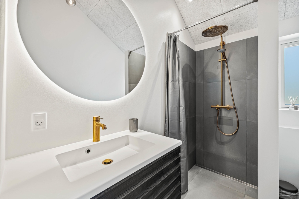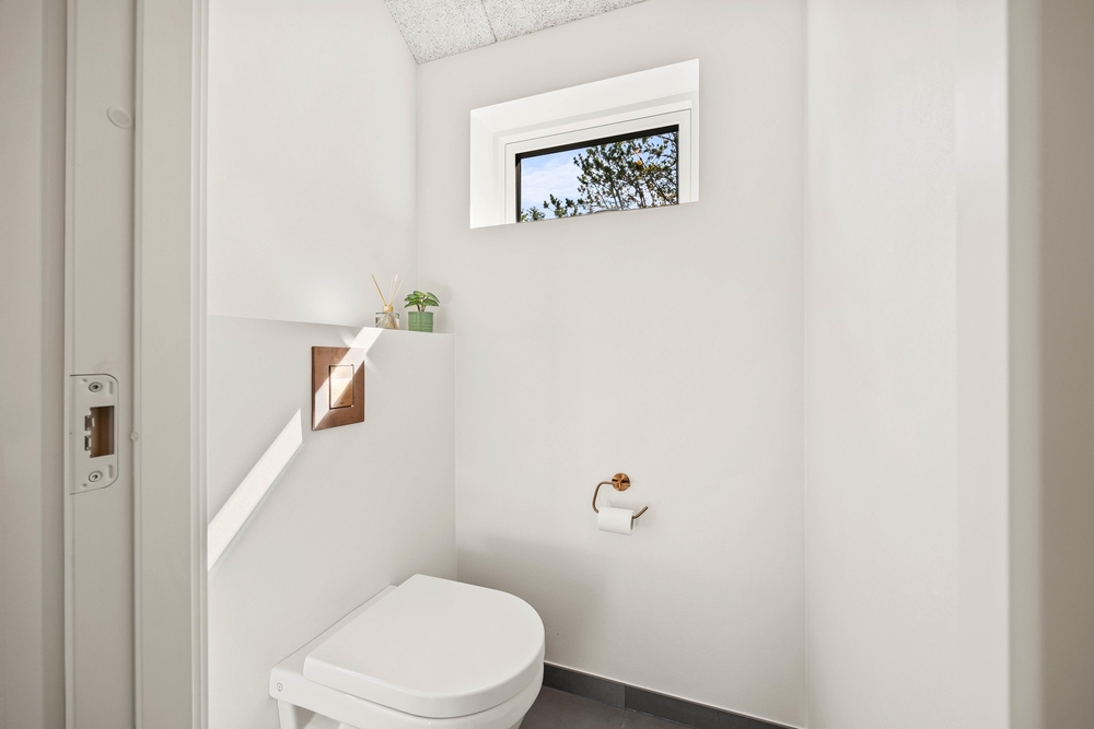 I det 192 kvadratmeter store feriehus venter jer 5 gode soveværelser, der er indrettet med i alt 3 dobbeltsenge, 2 enkeltsenge og 1 etageseng, som I kan få jer en god nats søvn i efter en dejlig feriedag. Jeres feriemorgener starter uden kø til toilettet, da I har 2 badeværelser og 1 gæstetoilet i feriehuset. Både badeværelser og gæstetoilet er desuden udstyret med gulvvarme, så I kan holde jeres fødder varme.