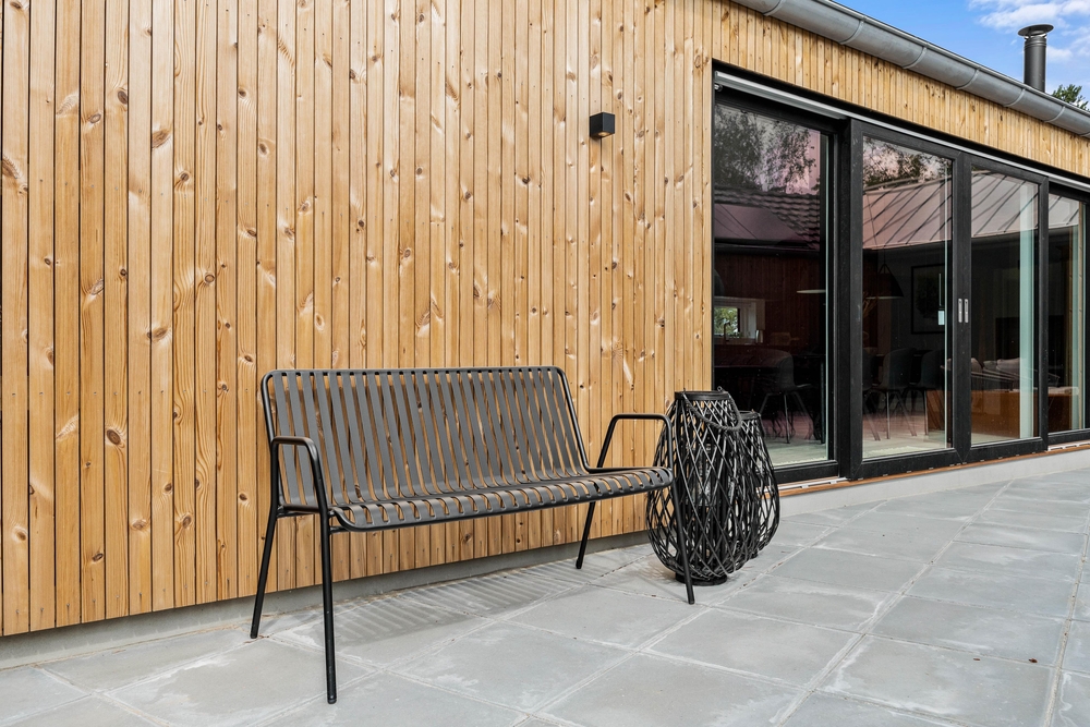 Feriehuset har en skøn, stor terrasse, som I kan tilbringe de lange sommerdage på. Her står komfortable havemøbler og liggestole klar til jer, så I kan finde jer godt til rette og slappe af i solen med en god bog eller køligt glas vin, mens børnene leger i haven, hvor der er en gynge til dem.