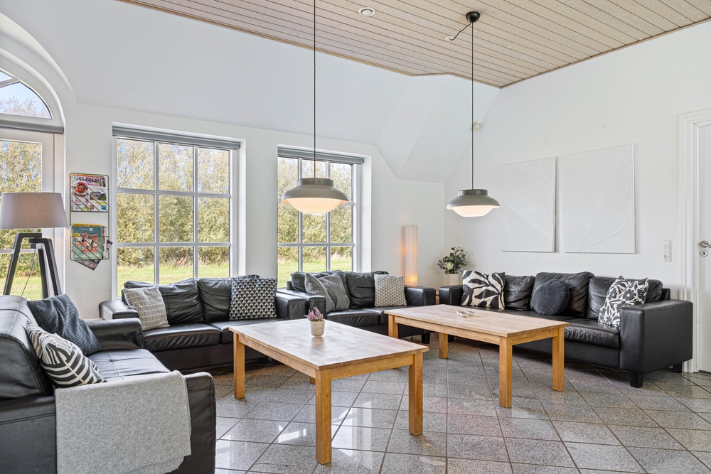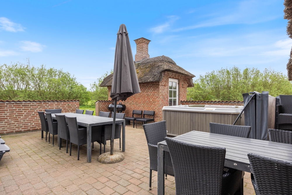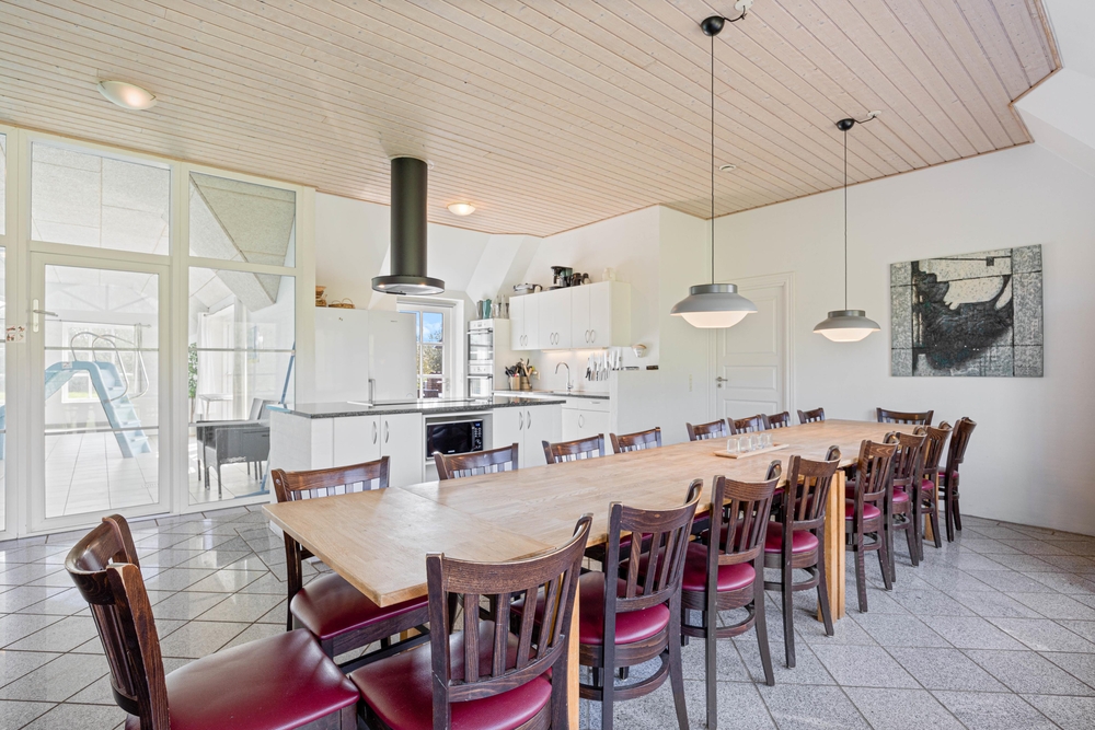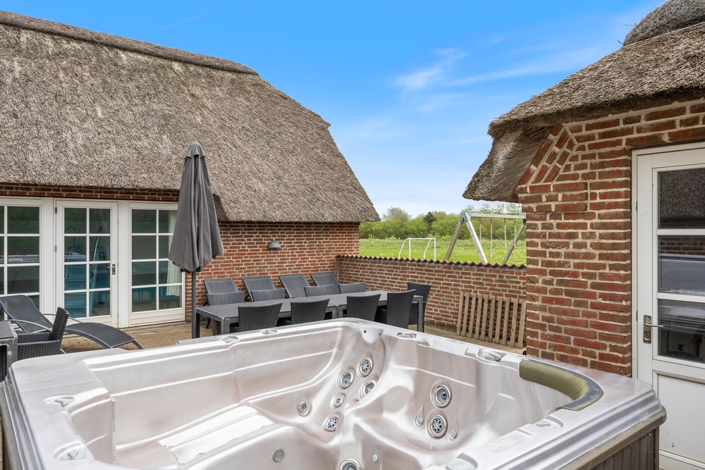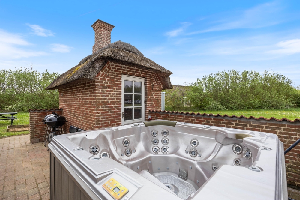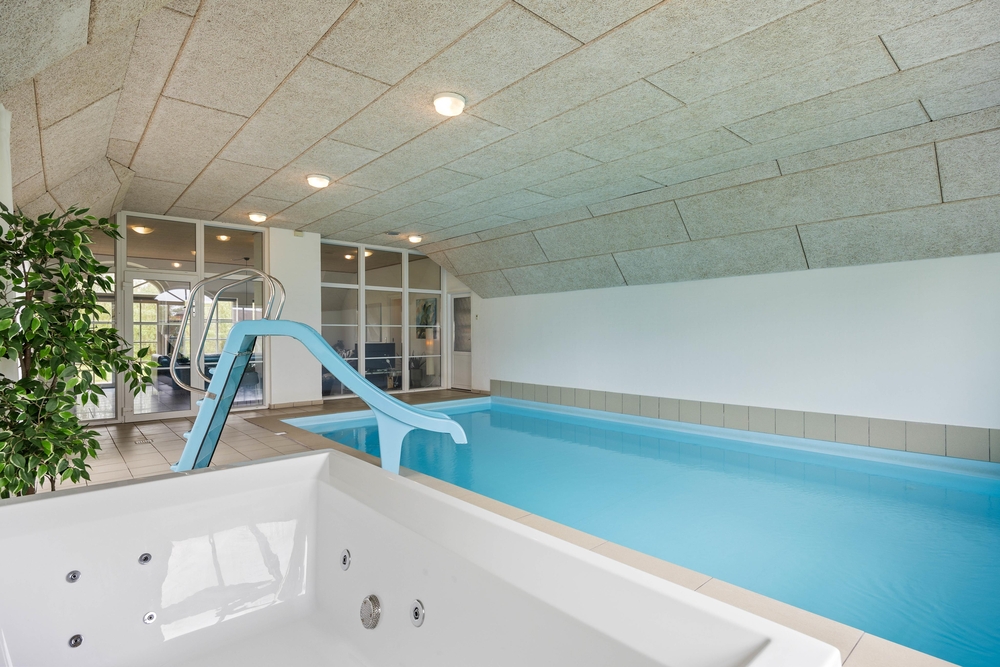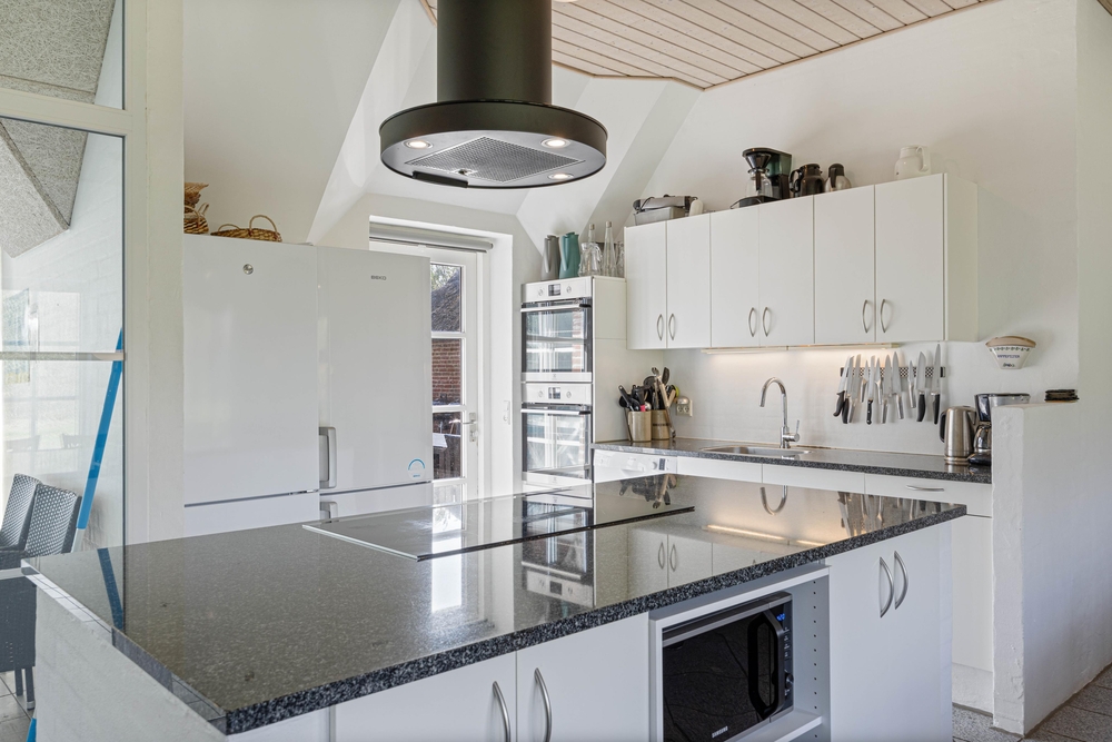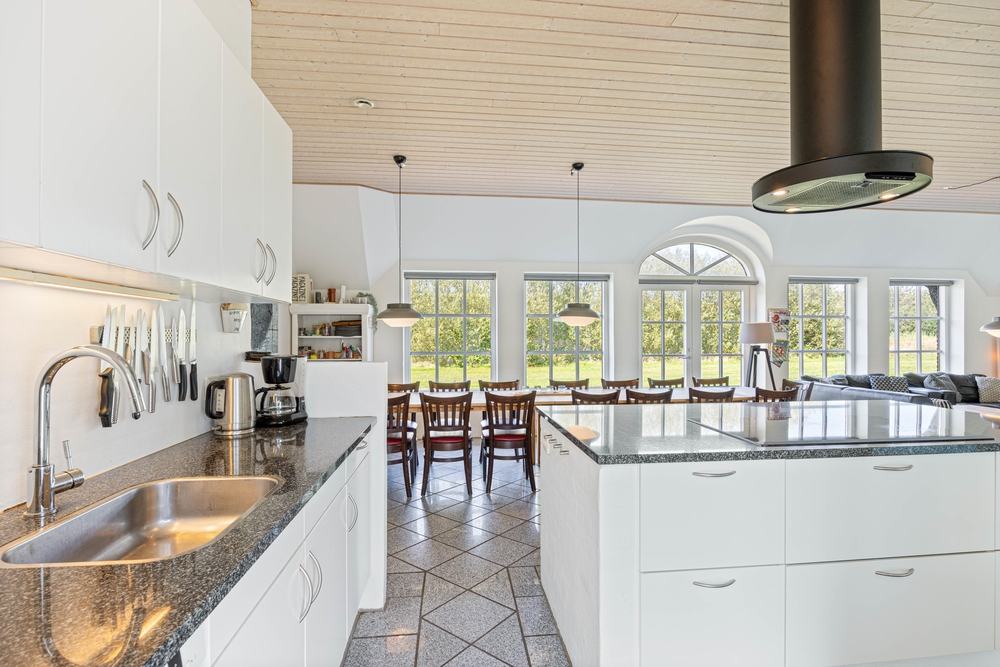 Lige så snart I træder ind i dette dejlige feriehus, kan I straks mærke at jeres ferie er begyndt. Det lyse og åbne køkkenalrum bidrager til en god hjemlig følelse, og de mange muligheder i feriehuset vil forbløffe jer. Uanset om I slapper af i saunaen, svømmer i poolen, slapper af foran den knitrende pejs med en god bog eller lader batterierne op i inde- eller udespaen, er mulighederne mange. I feriehusets store køkken med to ovne og to køleskabe er der rig mulighed for at I kan lave mad til alle folk. Opvasken skal I ikke tænke på, da der står en opvaskemaskine til rådighed.