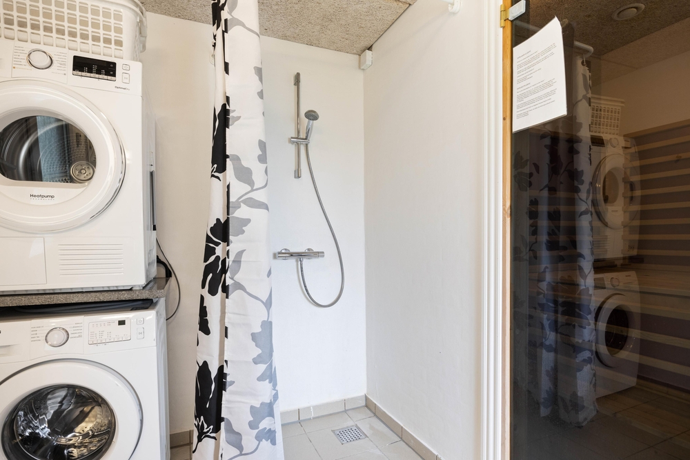 Gulvvarmen, som er installeret i næsten hele huset bliver opvarmet af en luft-til-vand varmepumpe, som blandt andet sørger for at I aldrig får kolde fødder. Vaskemaskinen og tørretumbleren sørger for at I kan vaske jeres yndlingstøj, hvis det bliver beskidt under jeres ophold.