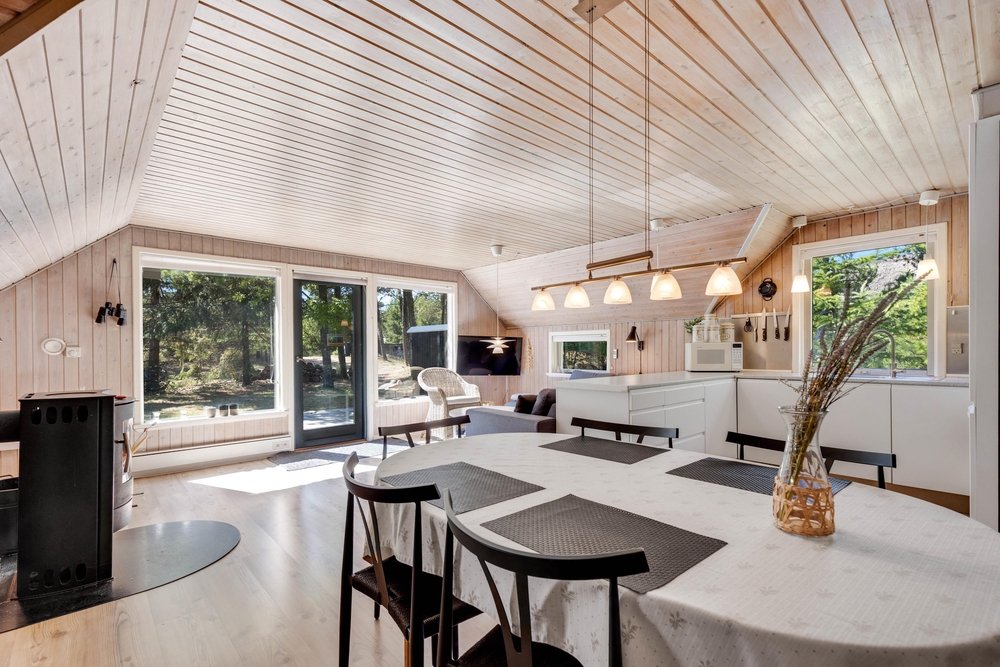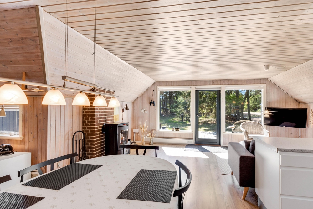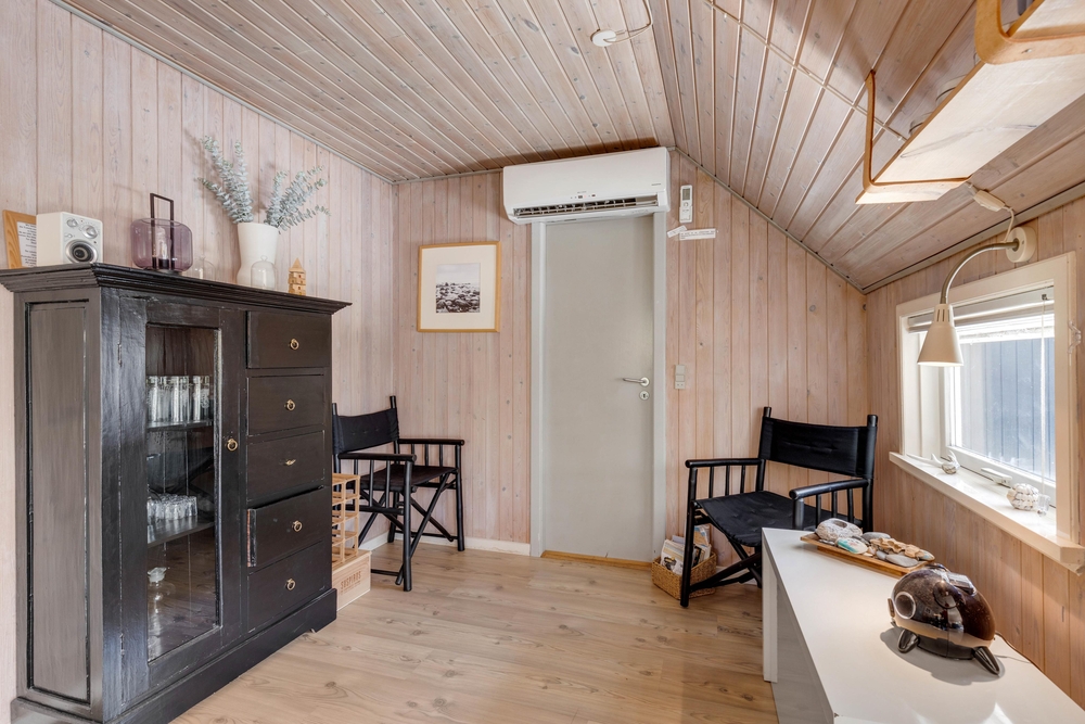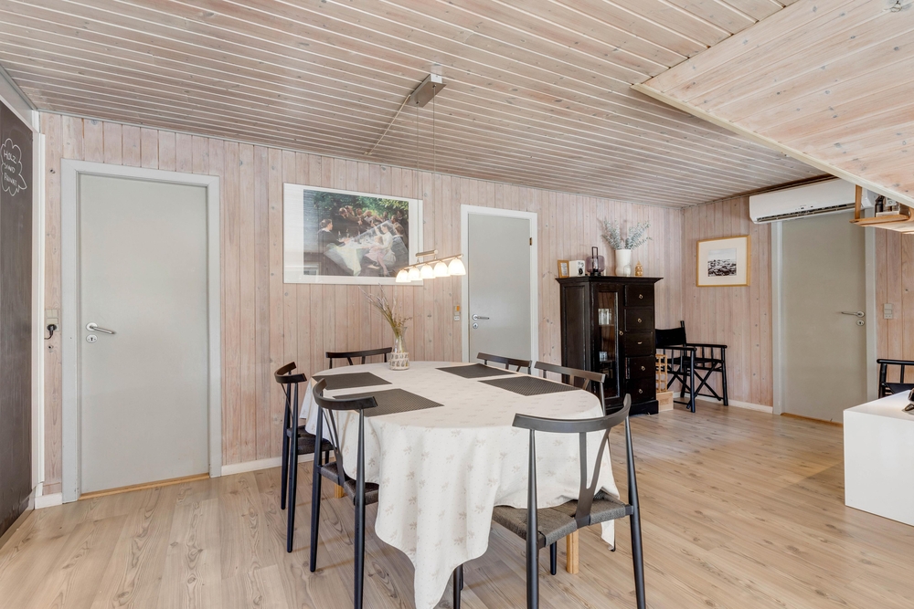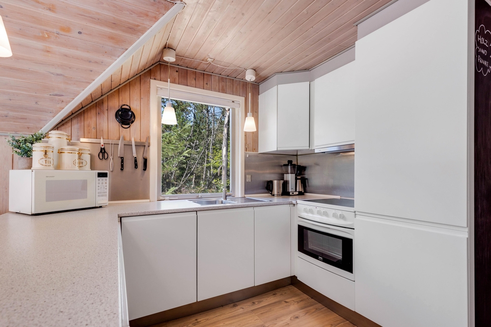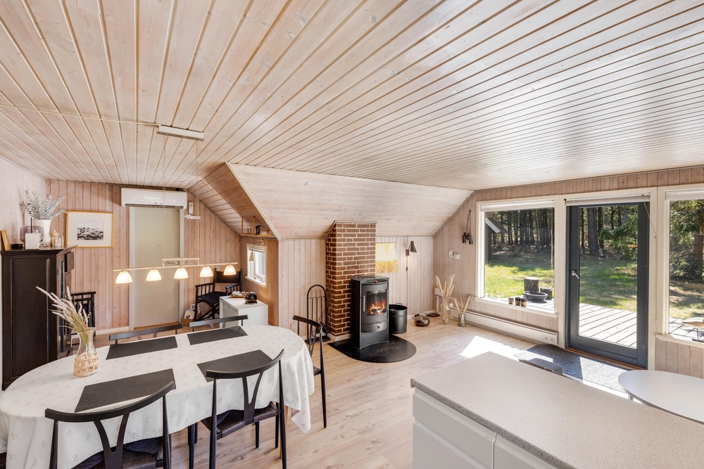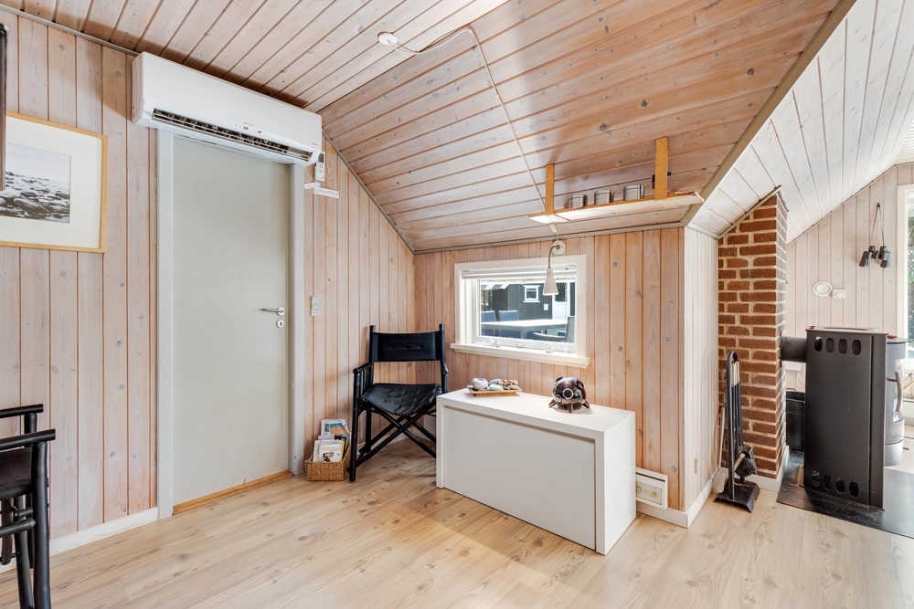 Dette sommerhus på Peder Larsensvej 7 er indrettet med fokus på både funktionalitet og hygge. Hjertet af huset er den rummelige stue, hvor en indbydende brændeovn skaber en varm og hyggelig atmosfære, perfekt til afslappende aftener. Skal der kokkeres er der masser plads i køkkenet, som også er veludstyret med en opvaskemaskine, der gør oprydningen efter måltiderne problemfri.